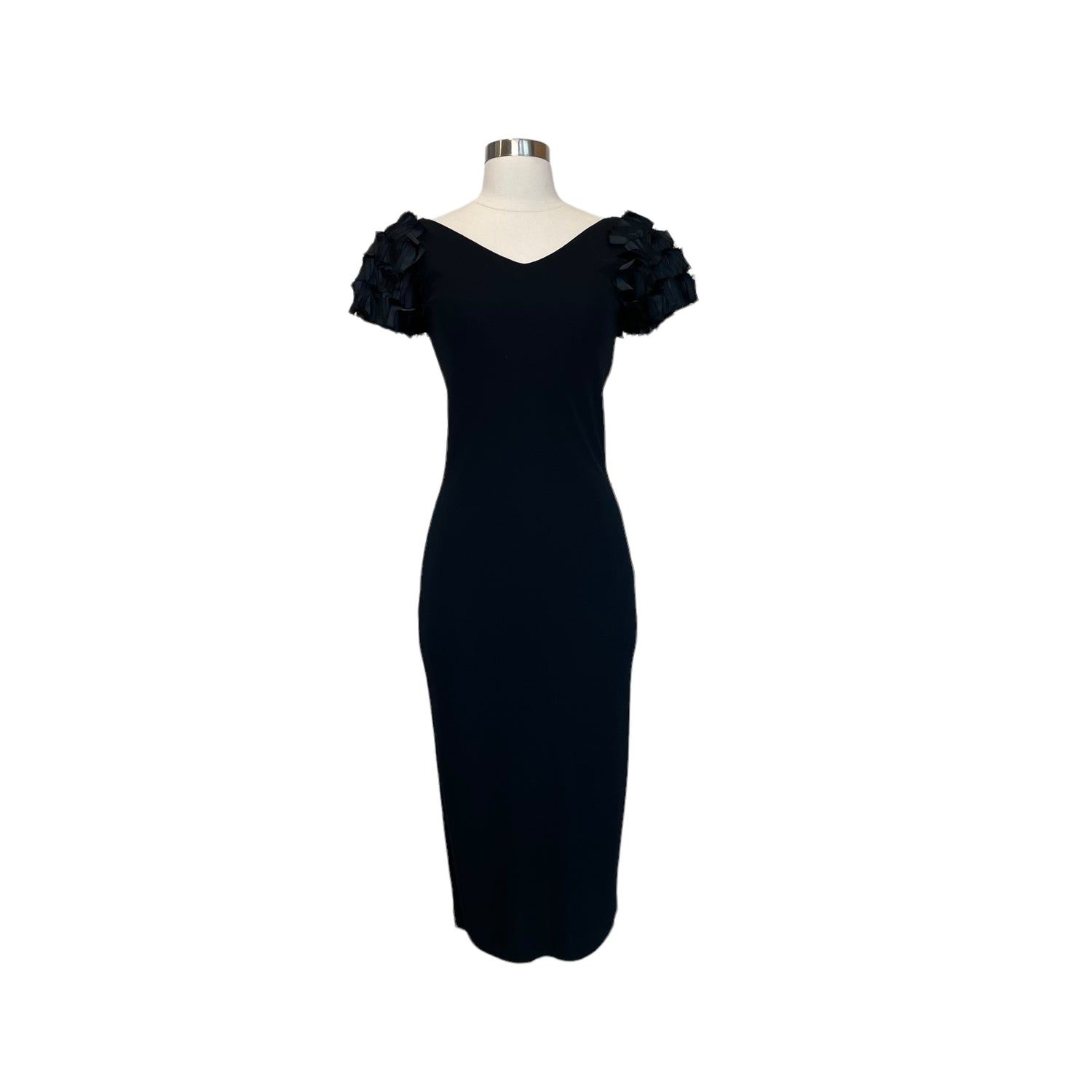 DSquared2 black ruffle cap sleeve midi dress. High v-neck at front. Ruffled fabric cap sleeve. Stretchable fabric. Designer size M.