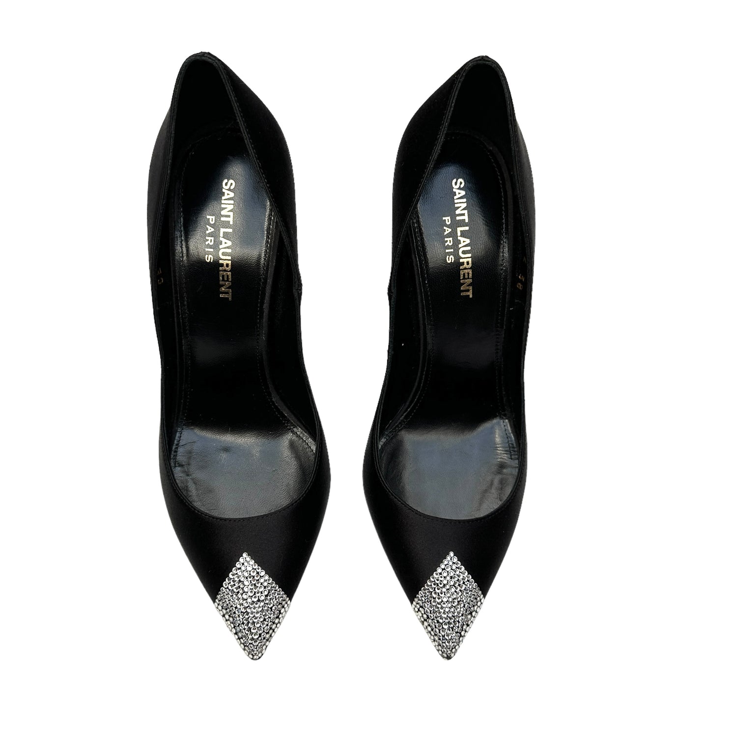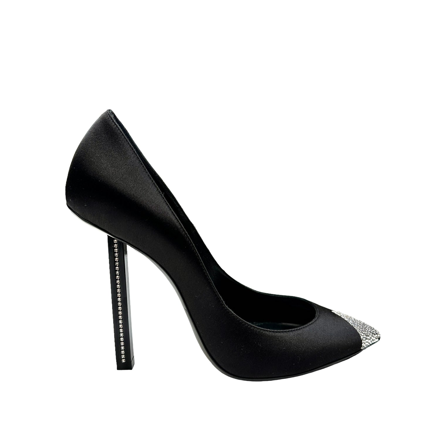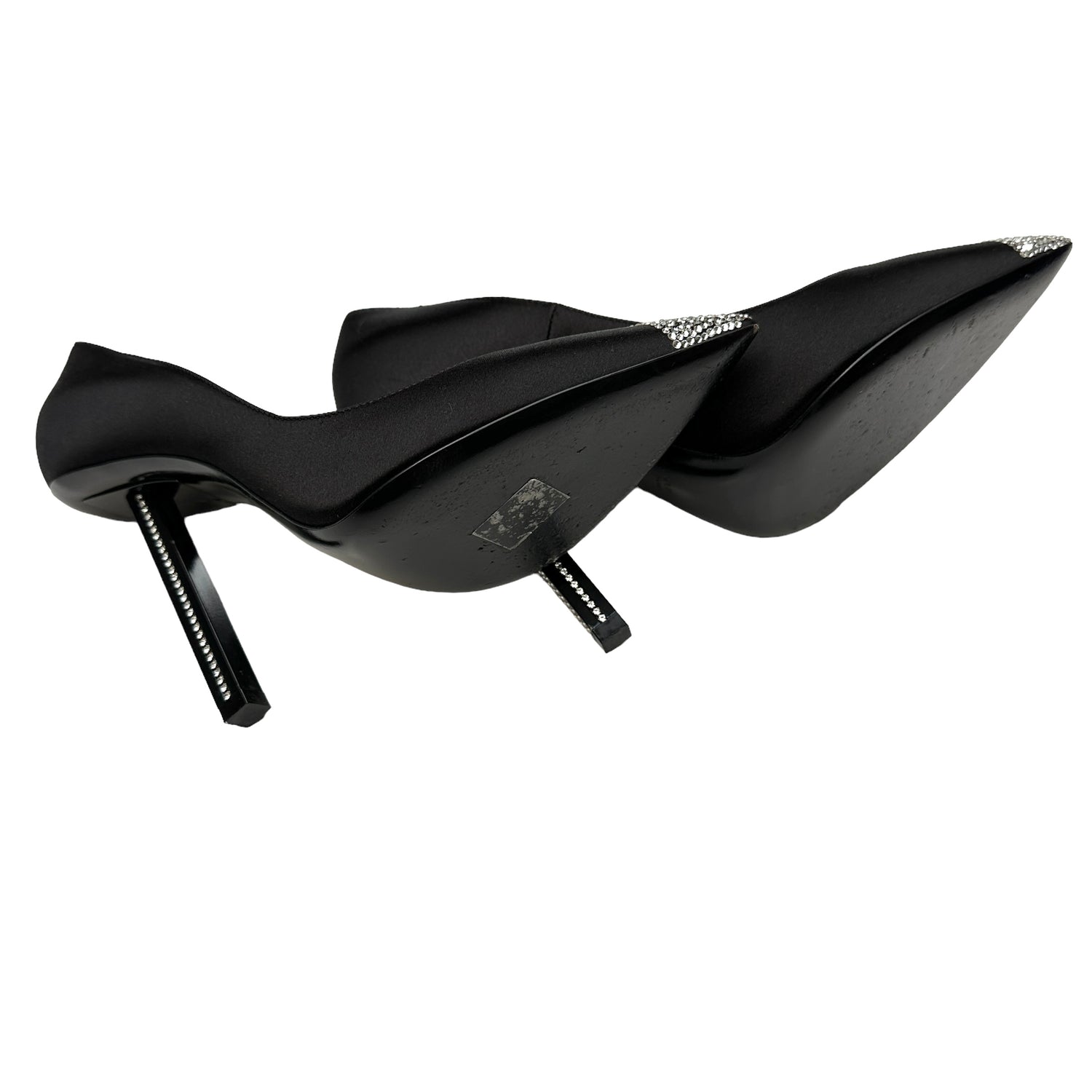 Saint Laurent black satin and crystals heels. Pointed toe. Architectural heels with crystal embellishments. Designer size 38.