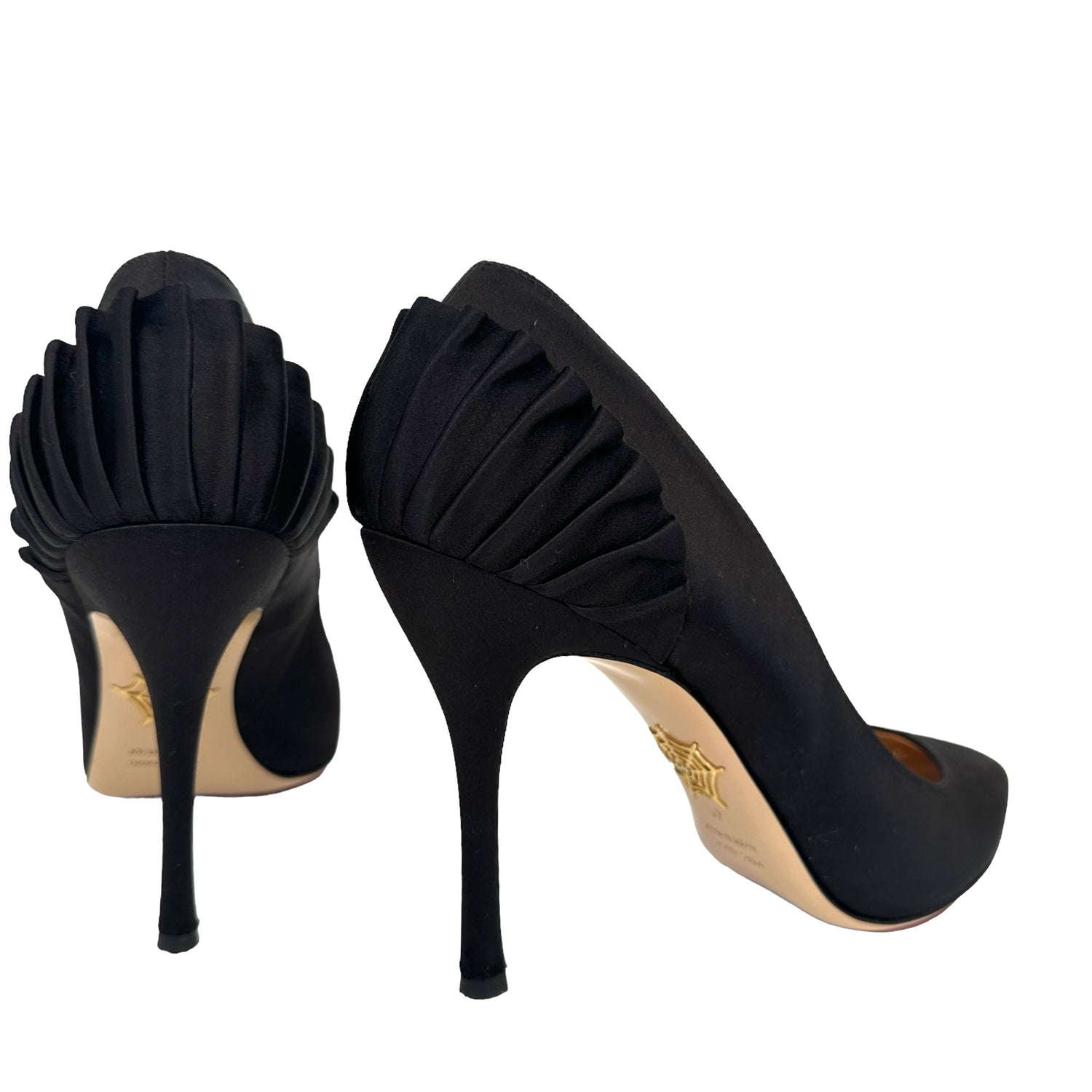 Charlotte Olympia black satin heels. Ruffle detail at back. Pointed toe. Designer size 41.