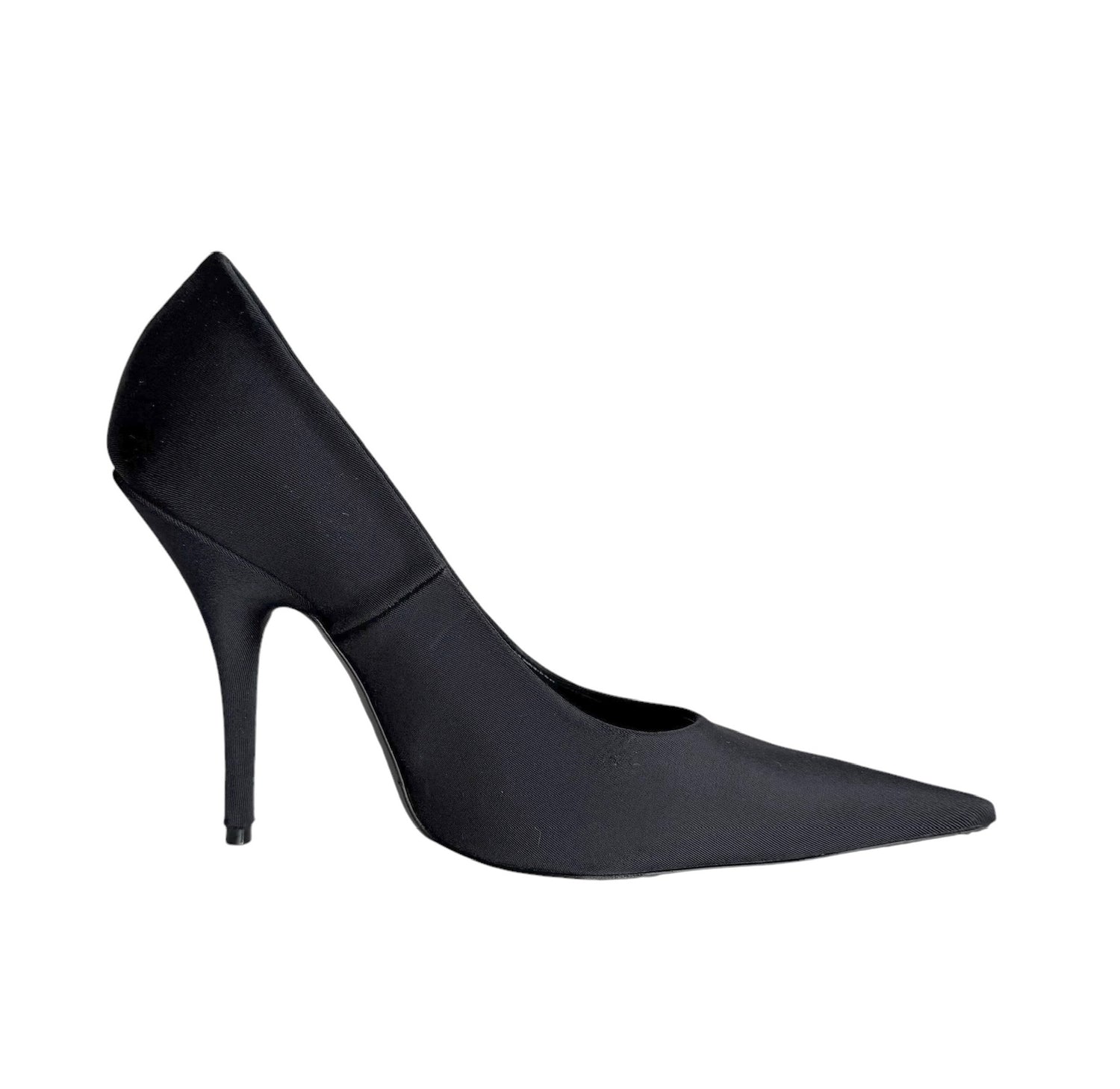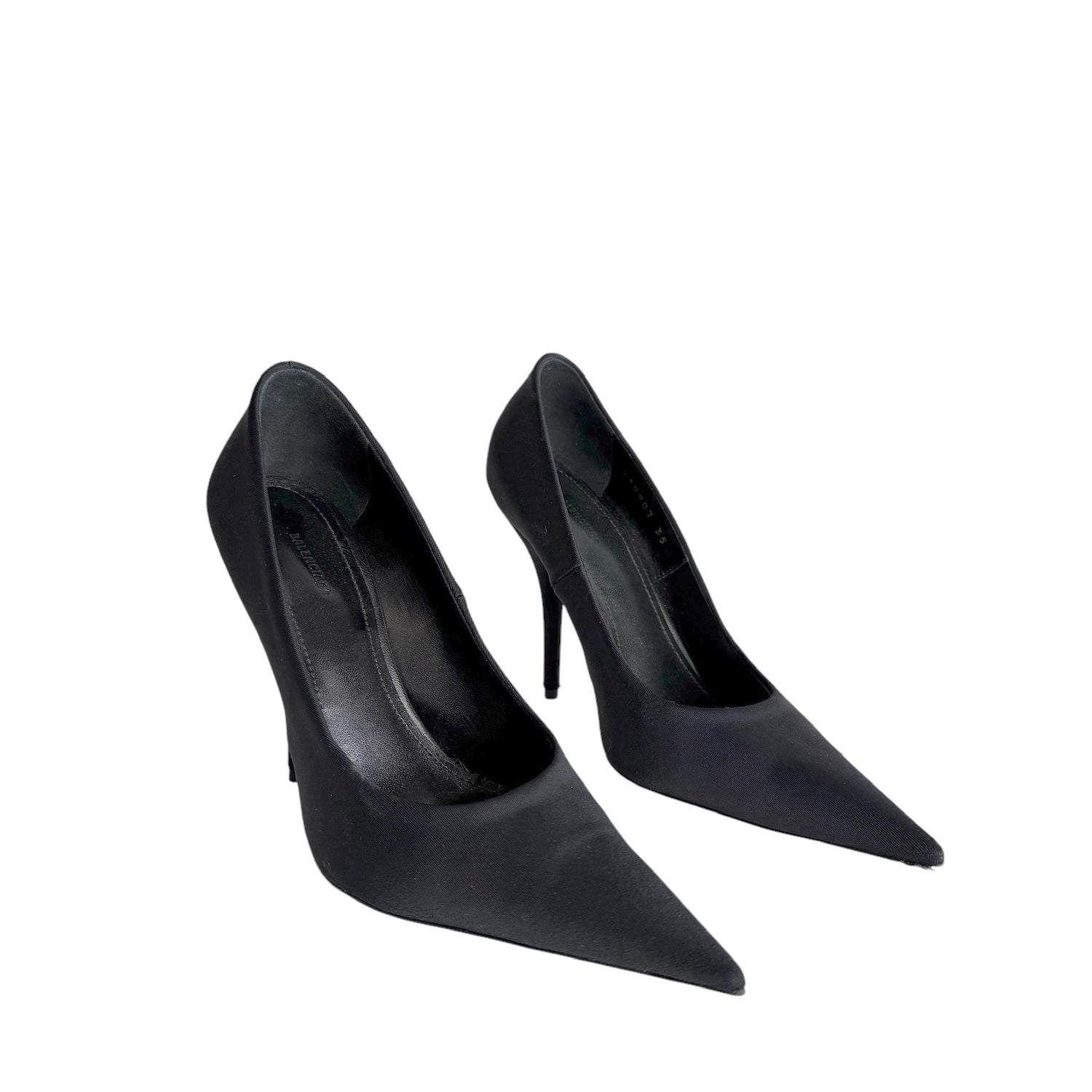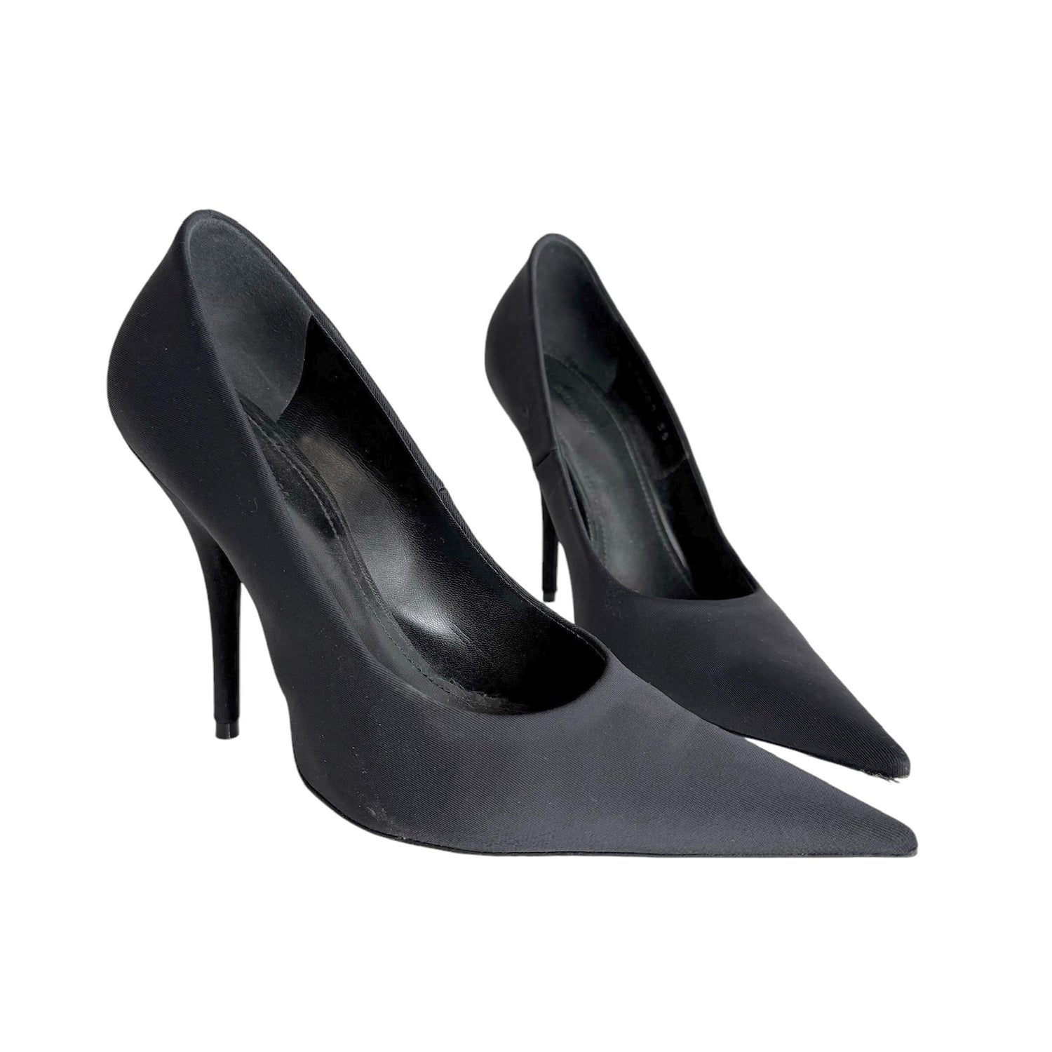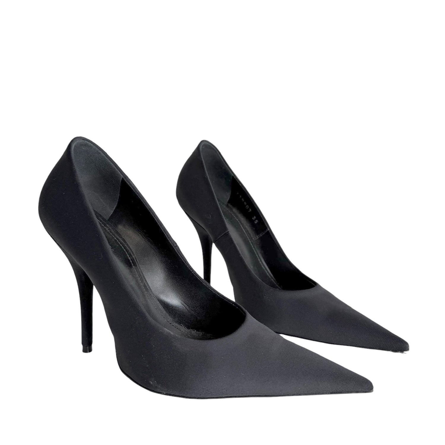 Balenciaga black satin heels. Exaggerated pointed toe. Designer size 35