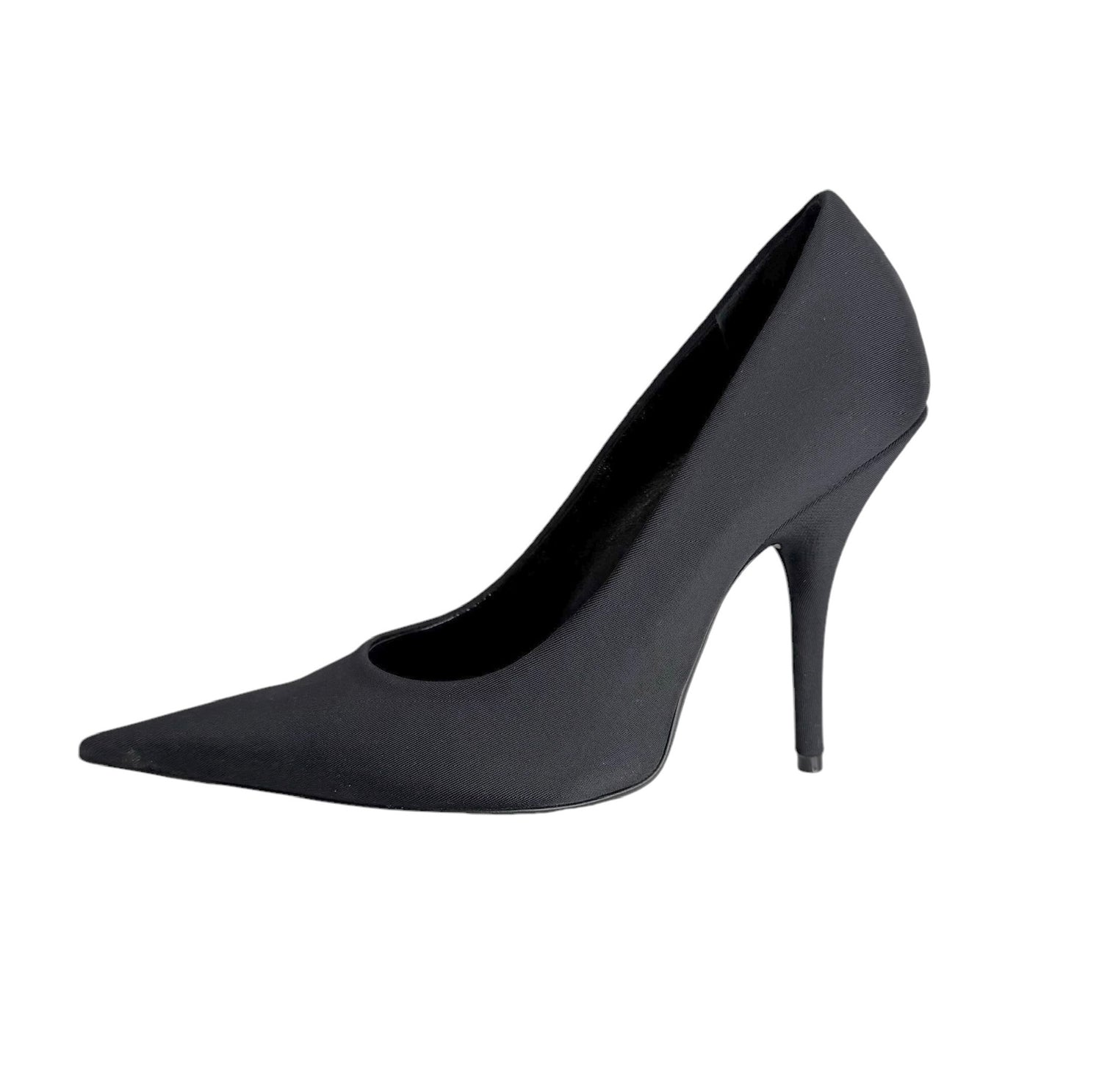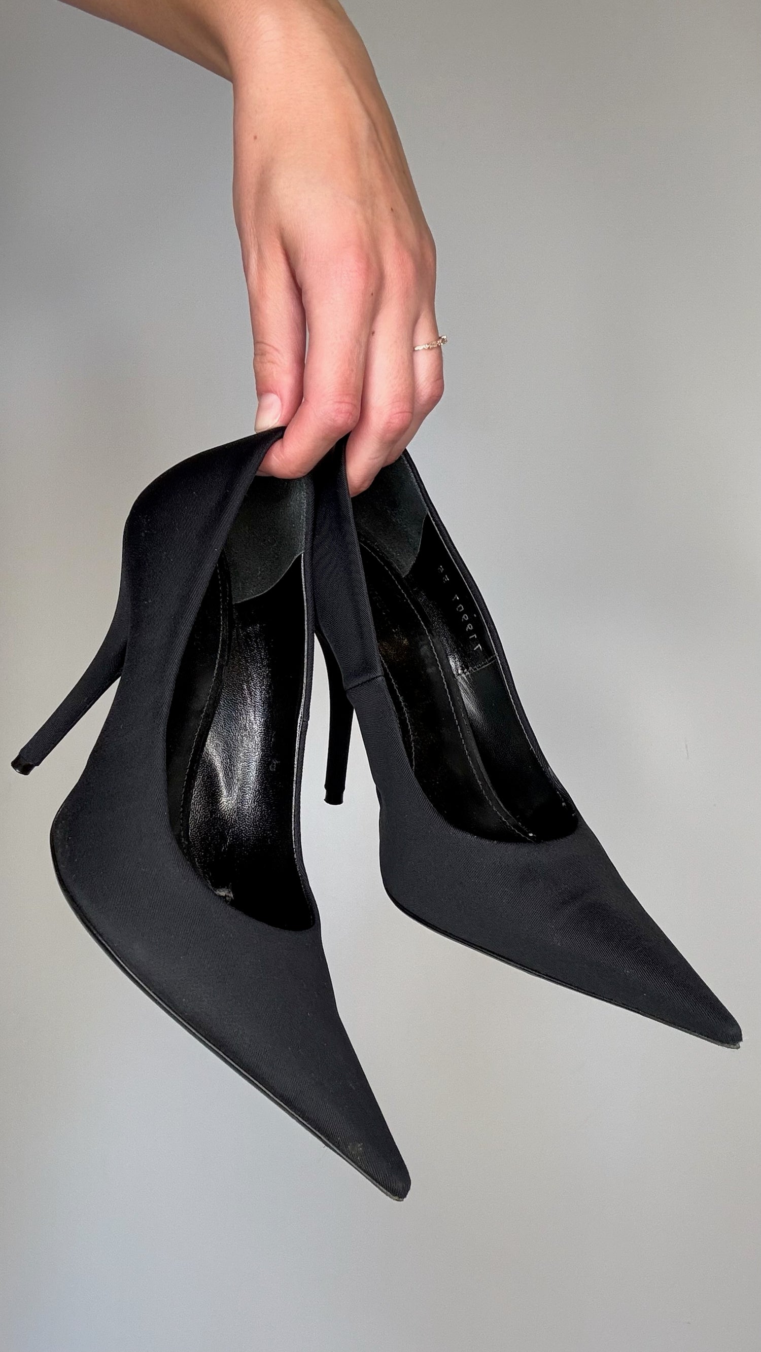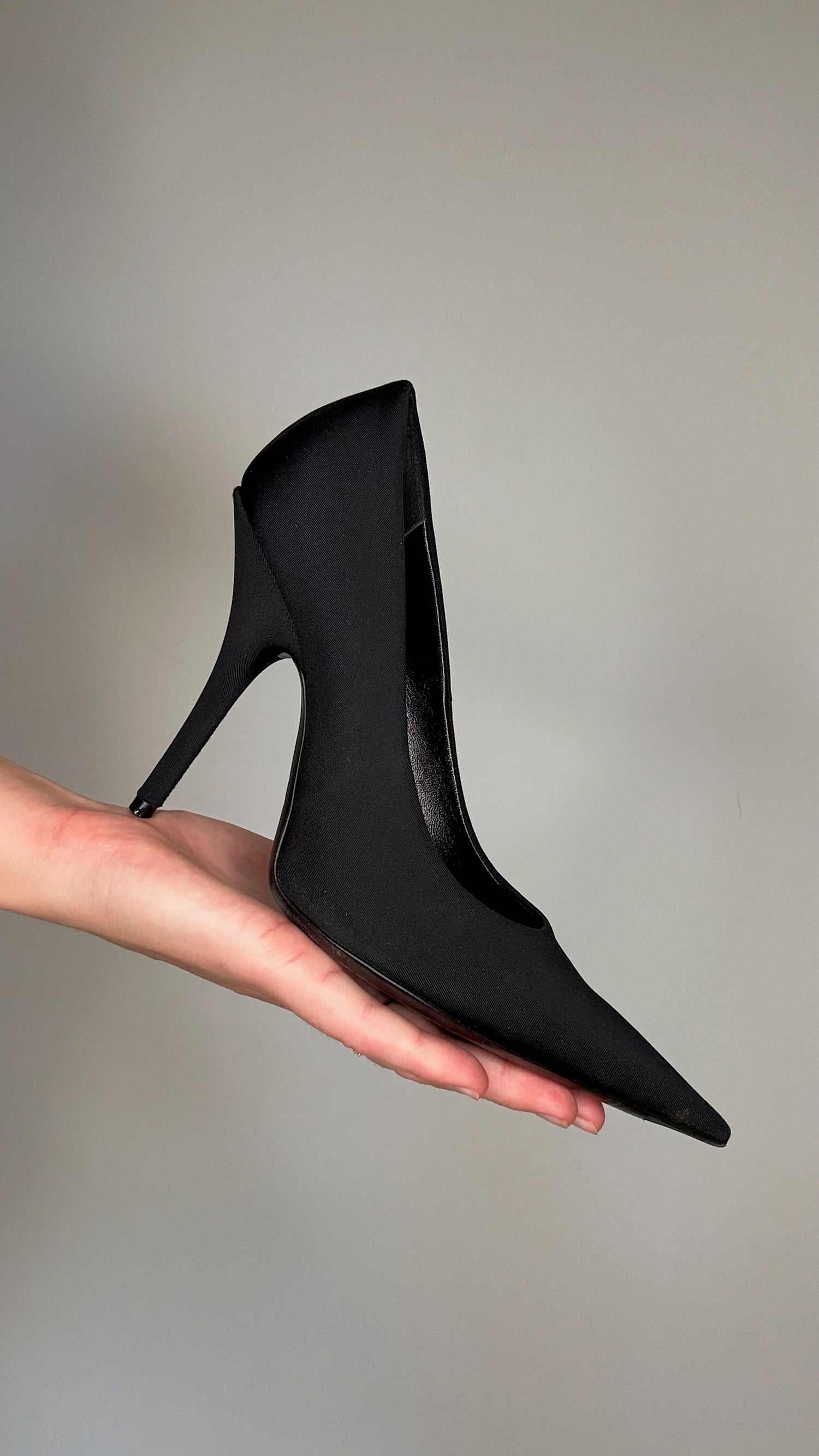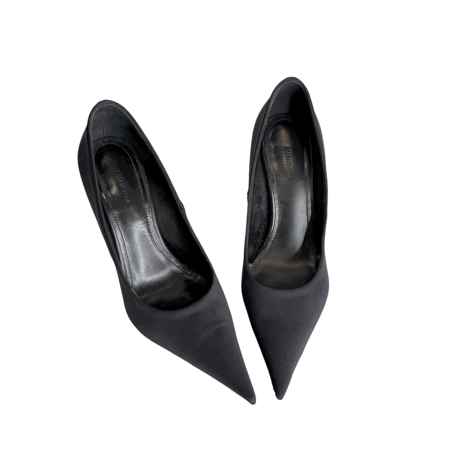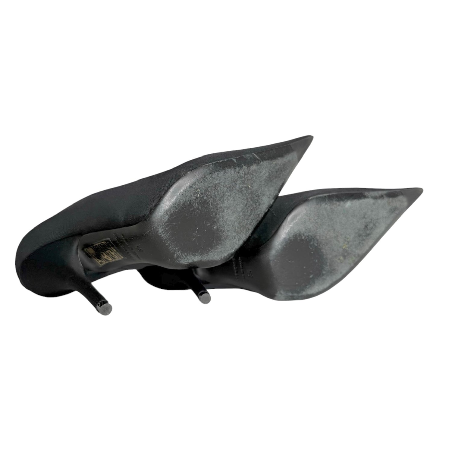Balenciaga black satin heels. Exaggerated pointed toe. Designer size 35