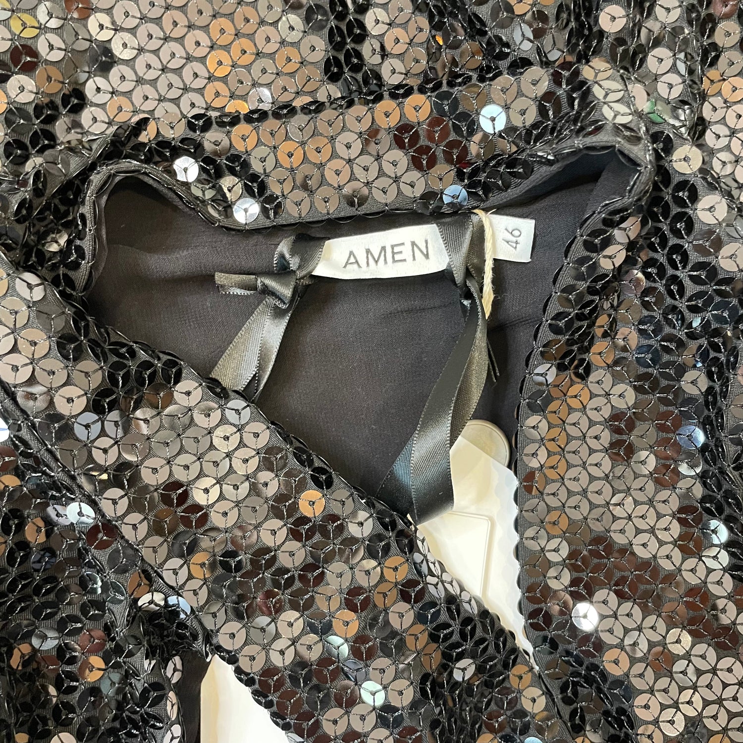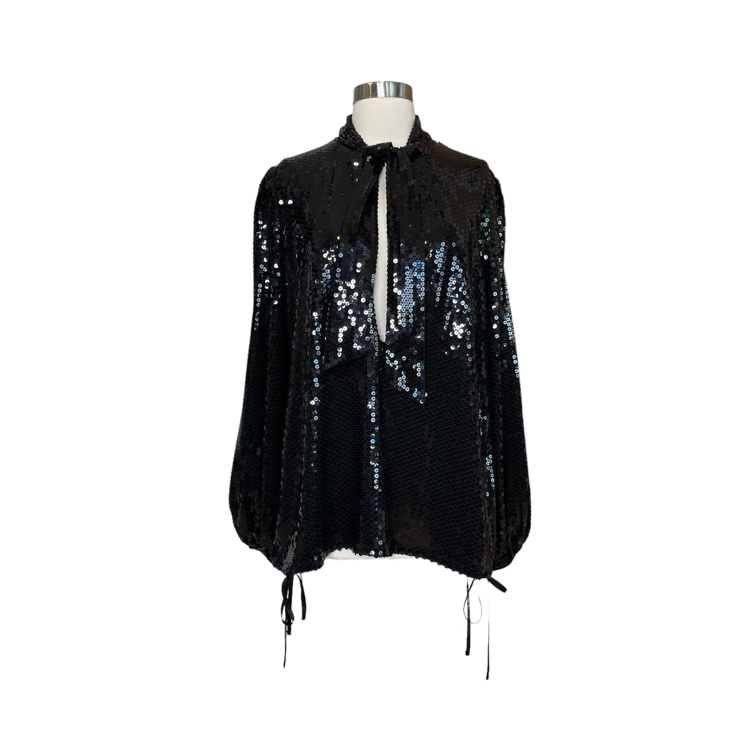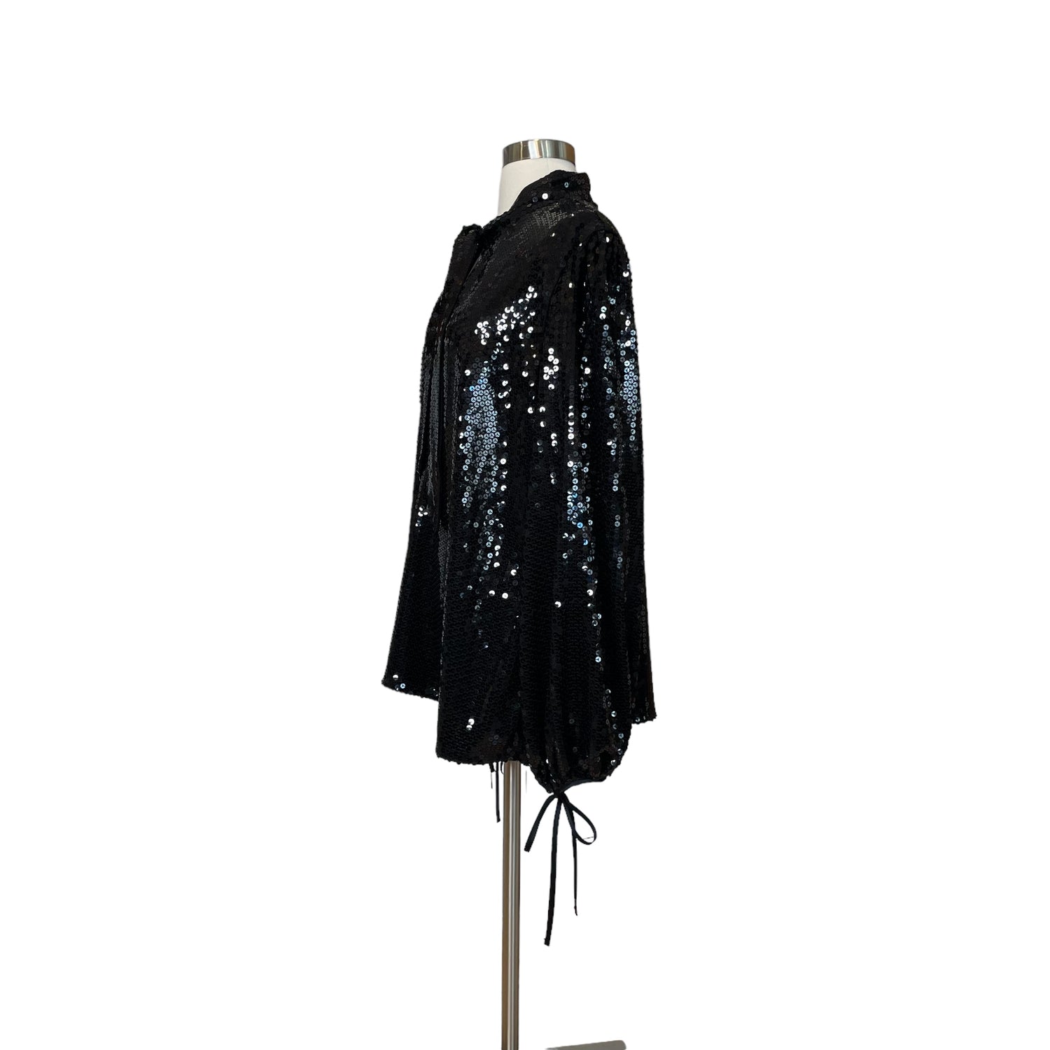 Amen black sequin top with billowy long sleeves. Ties at cuffs. Deep v with tie at neck. Designer size 46.