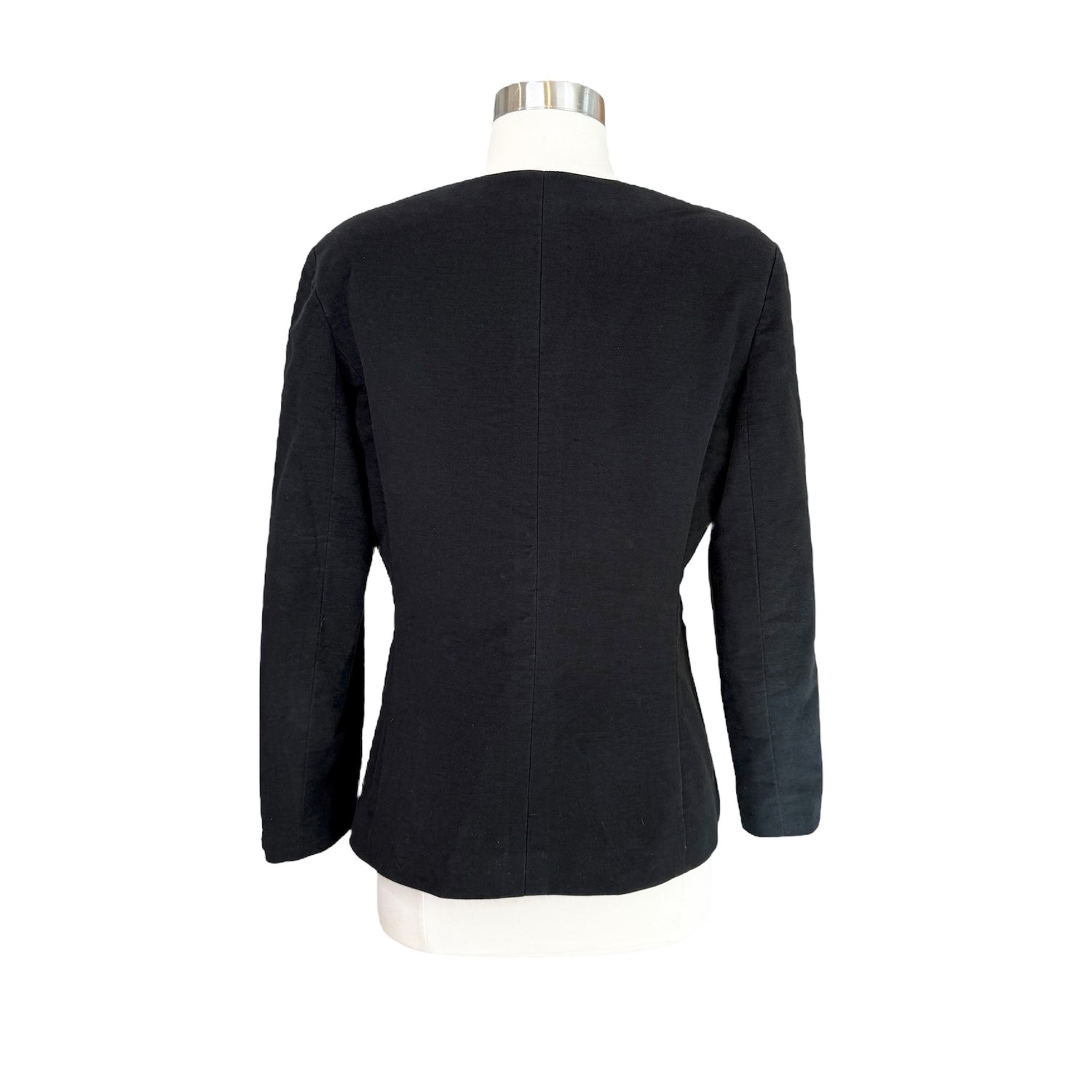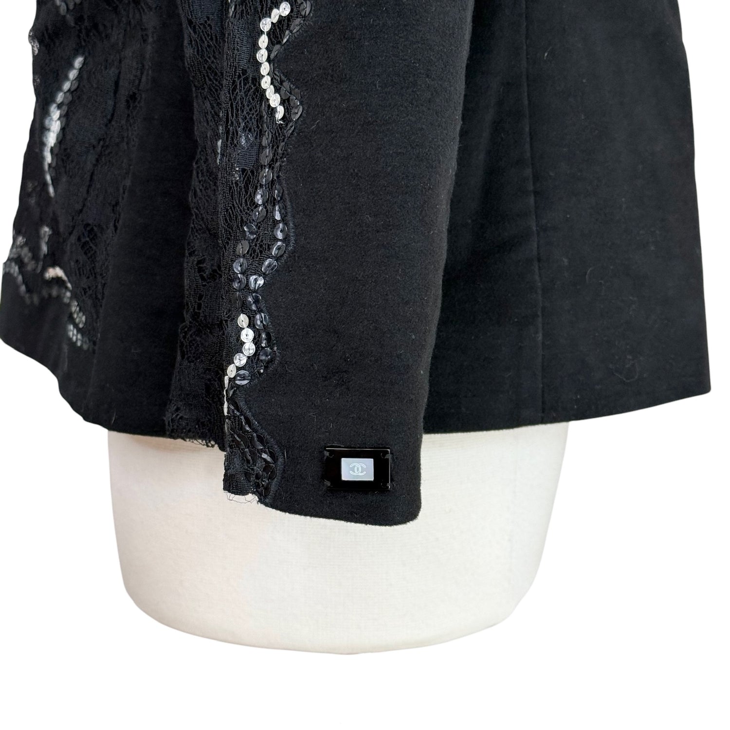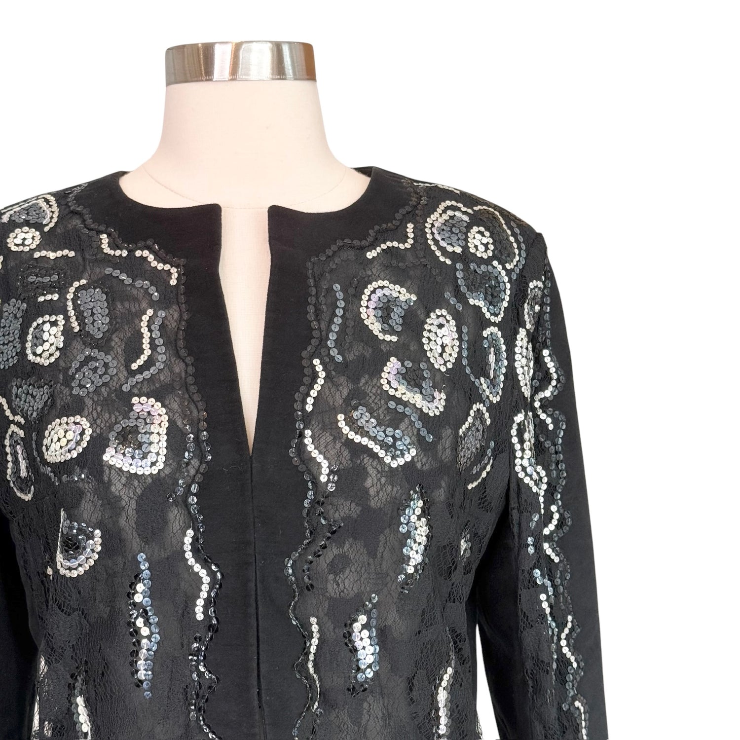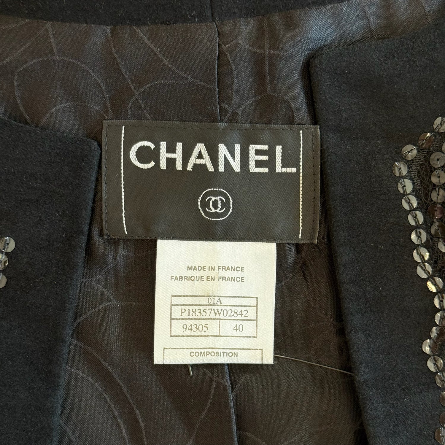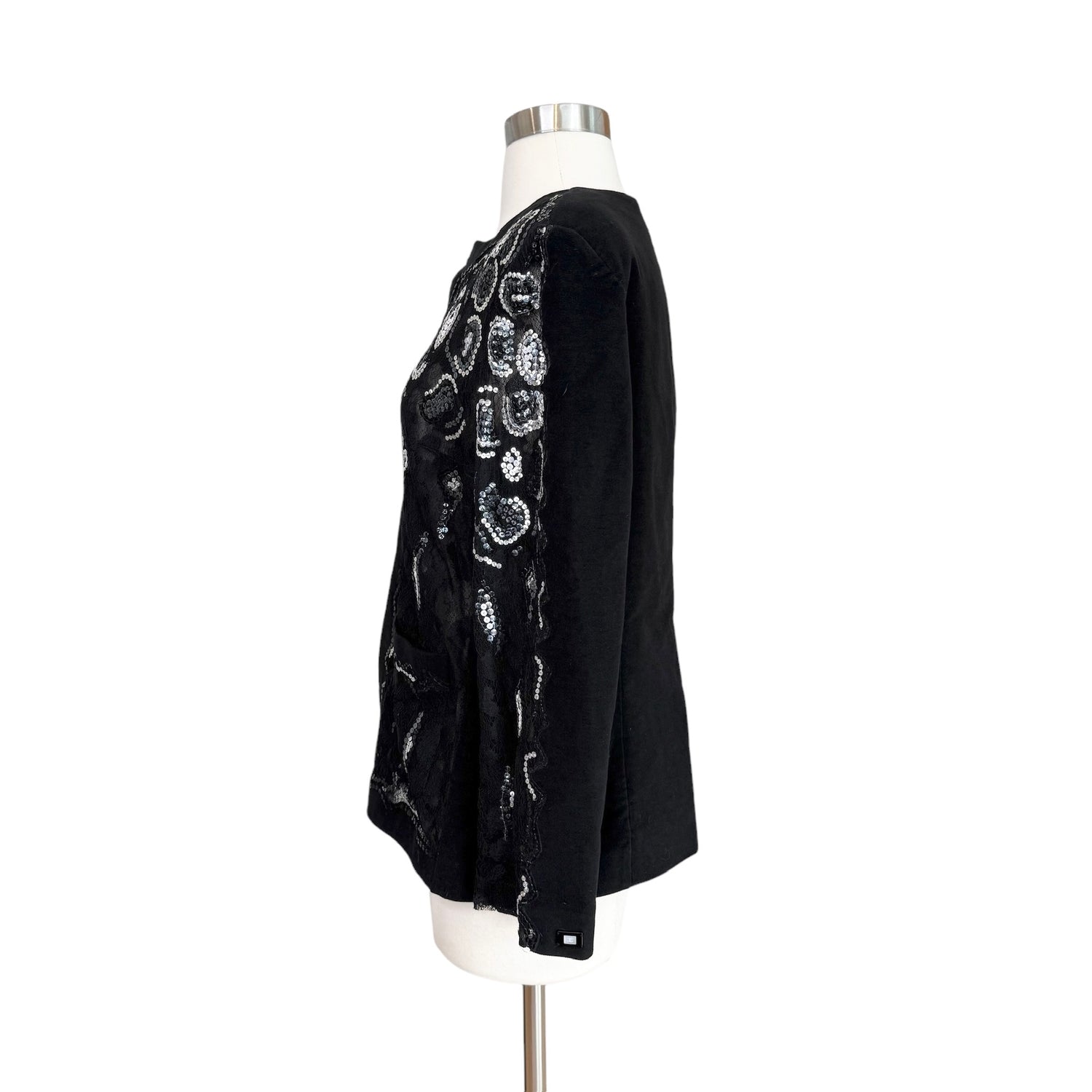 Chanel black and silver sequins jacket. Fall 2001 collection. Hook and eye closure. Collarless. Pockets. Chanel logo plate at sleeve. Designer size 40.