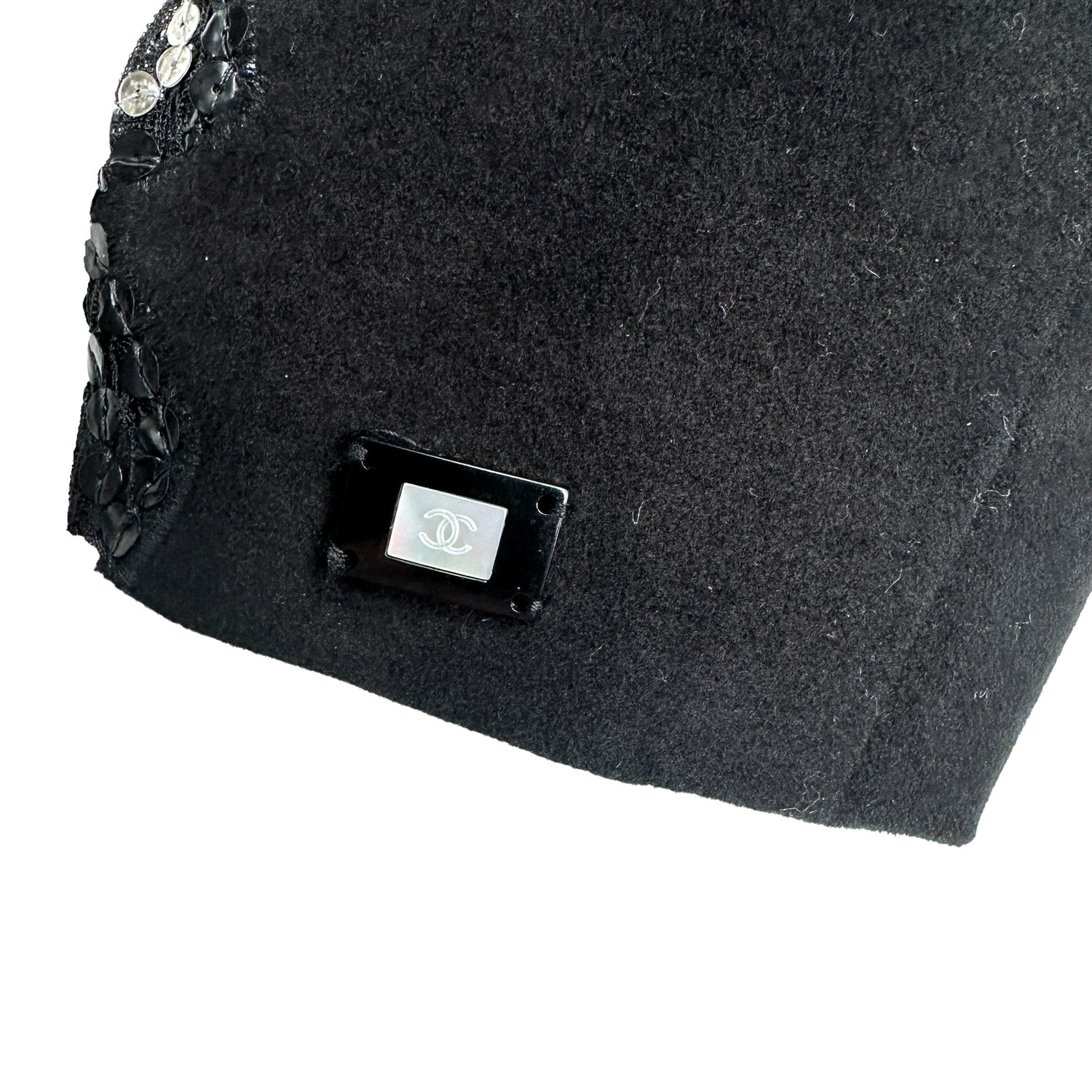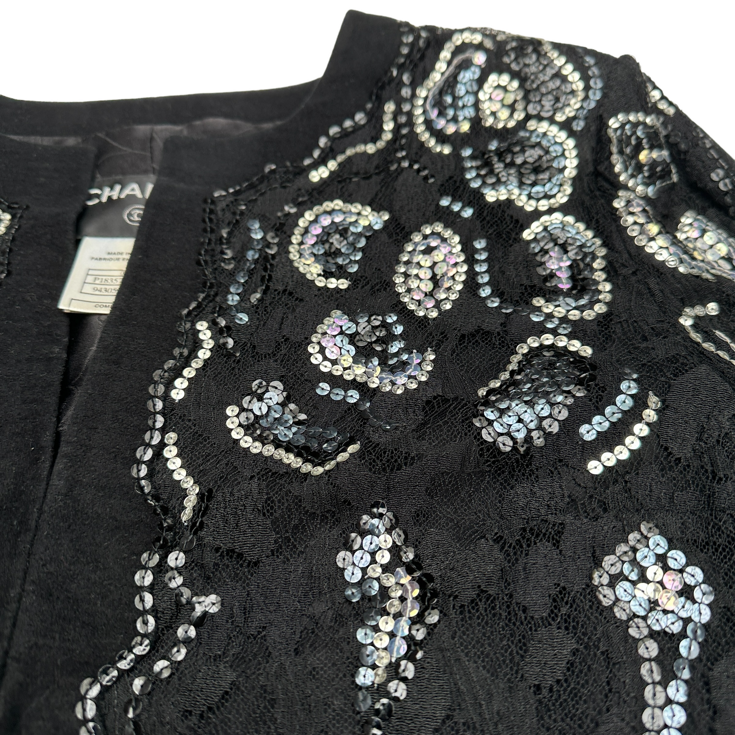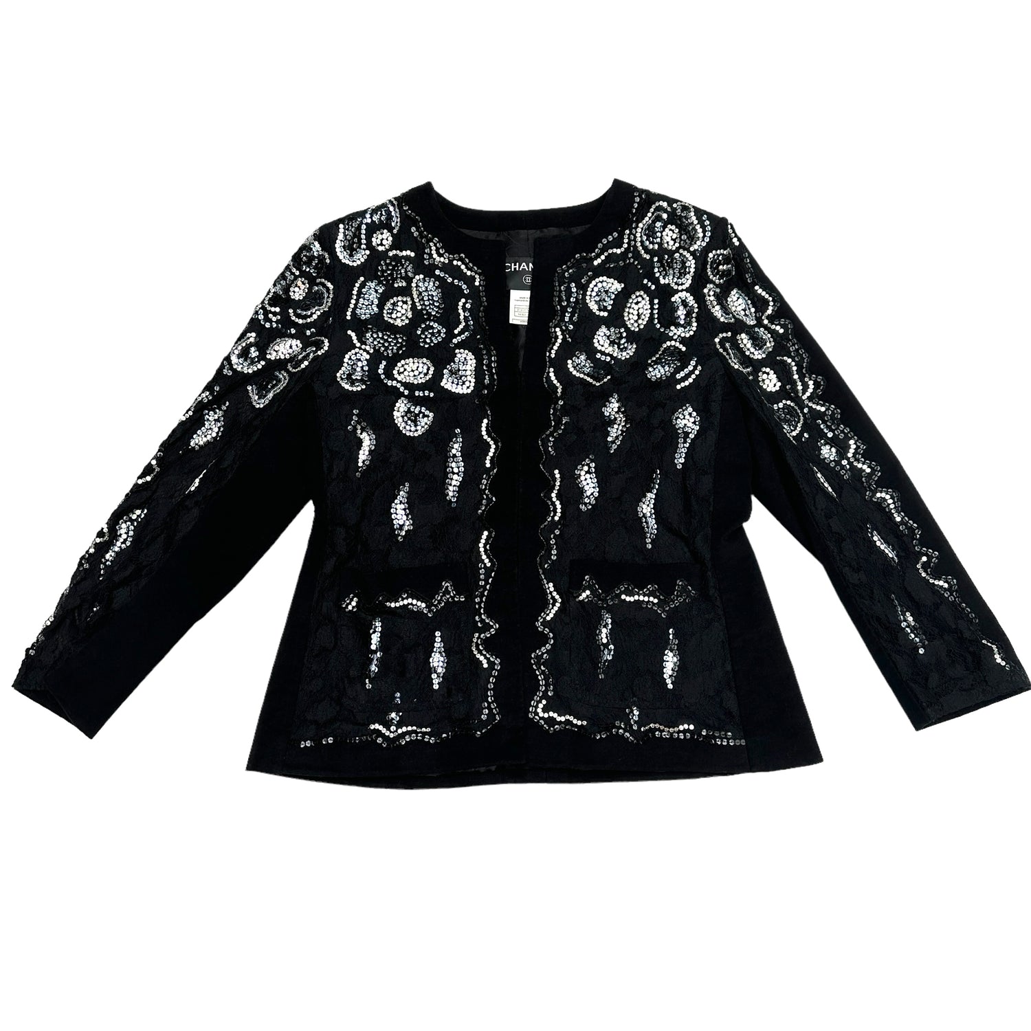 Chanel black cardigan blazer with sequins and lace panels at front. Hook closure at front. Two pockets. Very soft velvet-like fabric. Adorable CC logo pin at sleeve. Designer size 40.