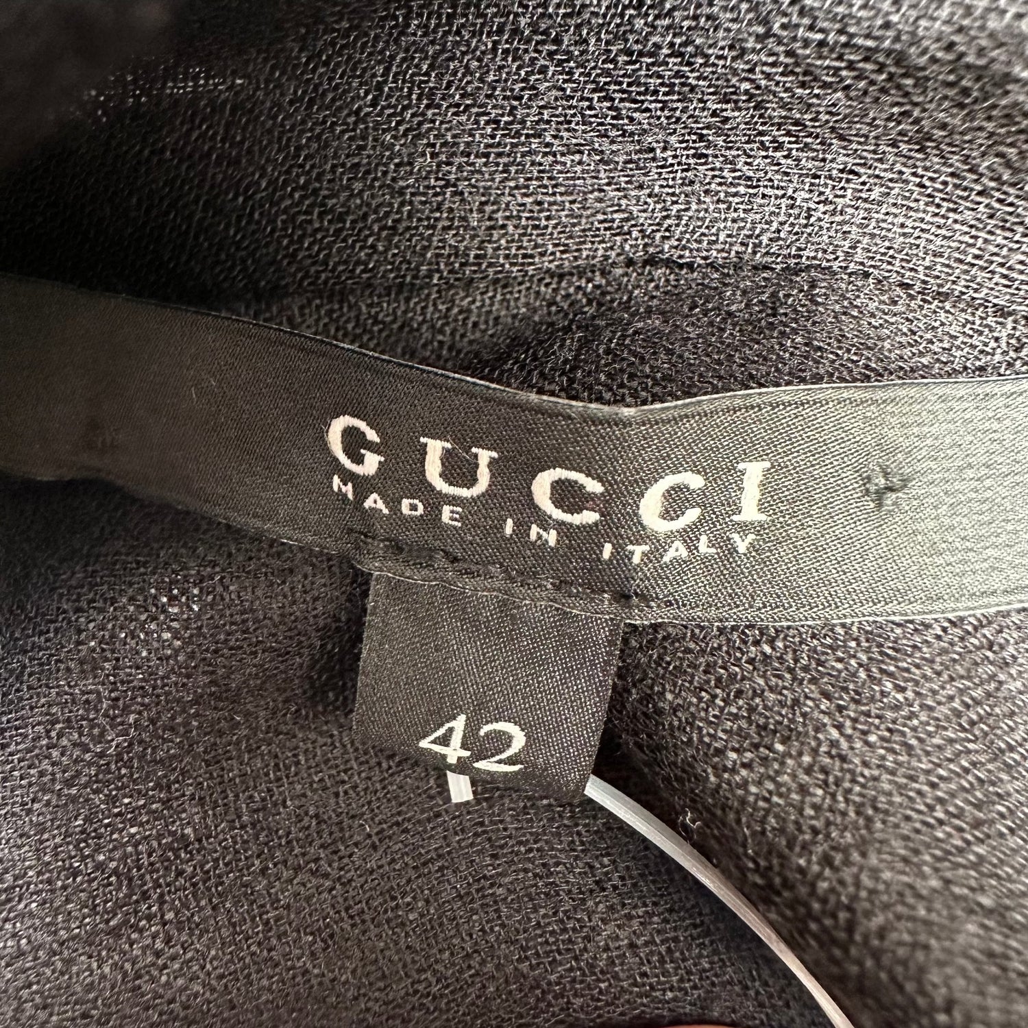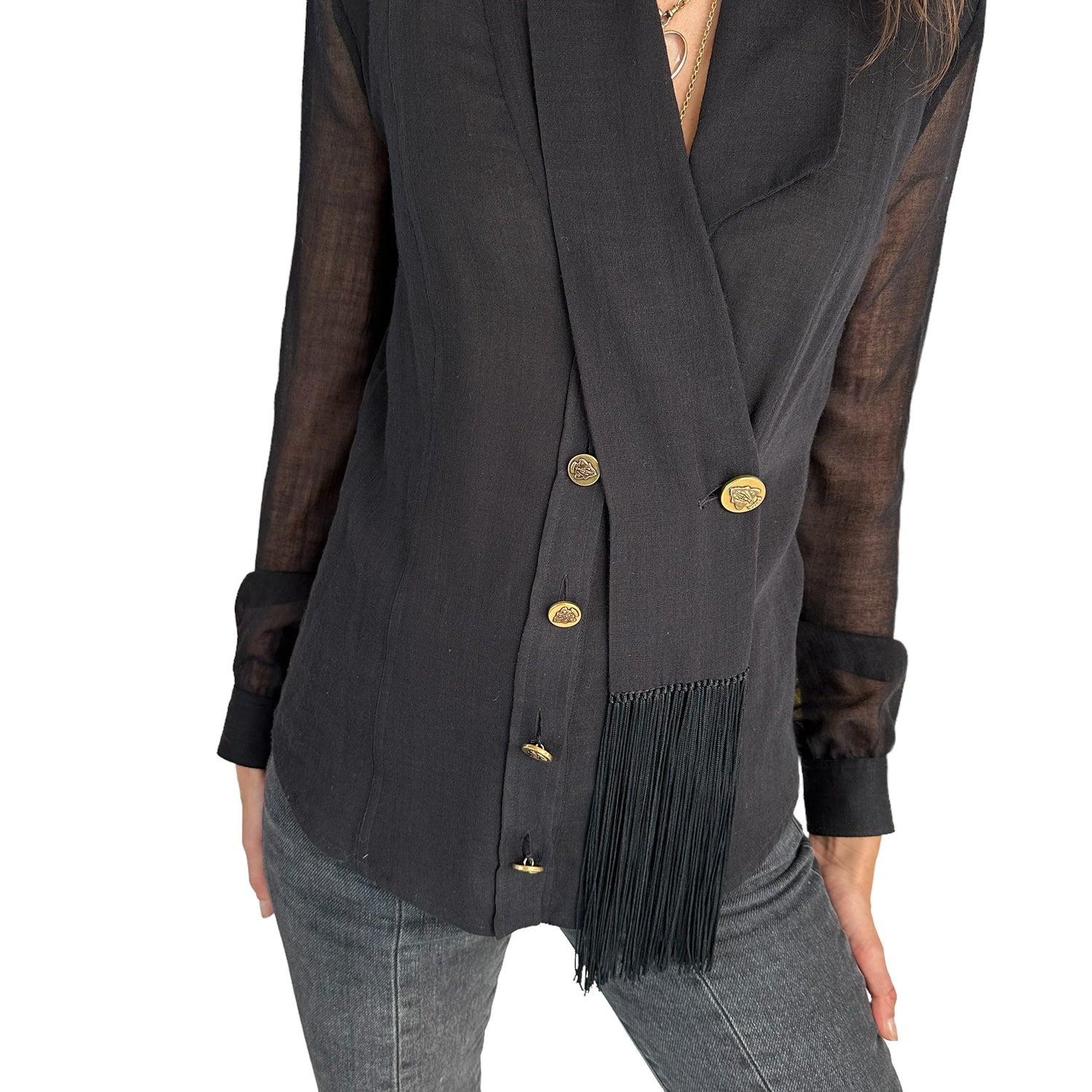 Gucci lightweight asymmetrical black shirt. Large Gucci logo buttons. V-neck. Fringes detail at tie. Long sleeves. Designer size 42.