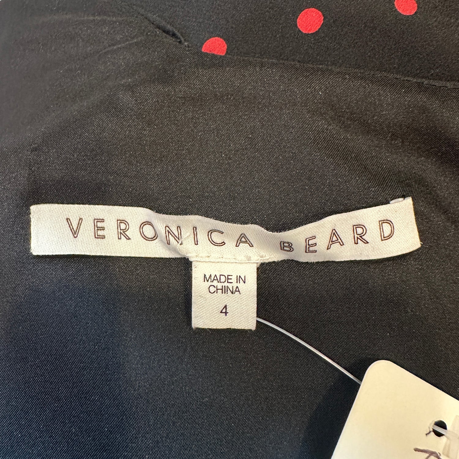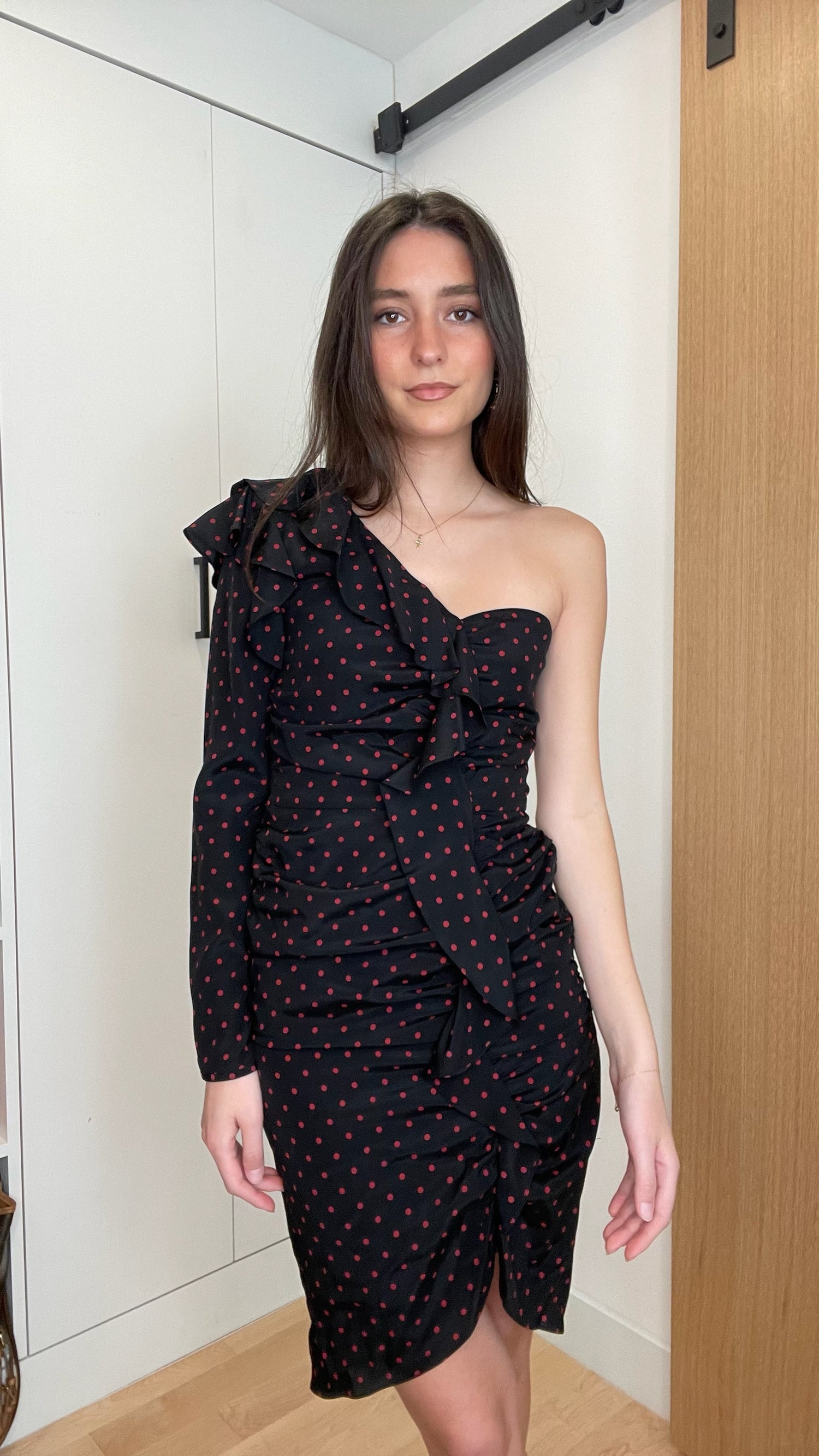 Veronica Beard black and red polka dot dress. One sleeve. Rushed details. Concealed zipper at side. Designer size 4.