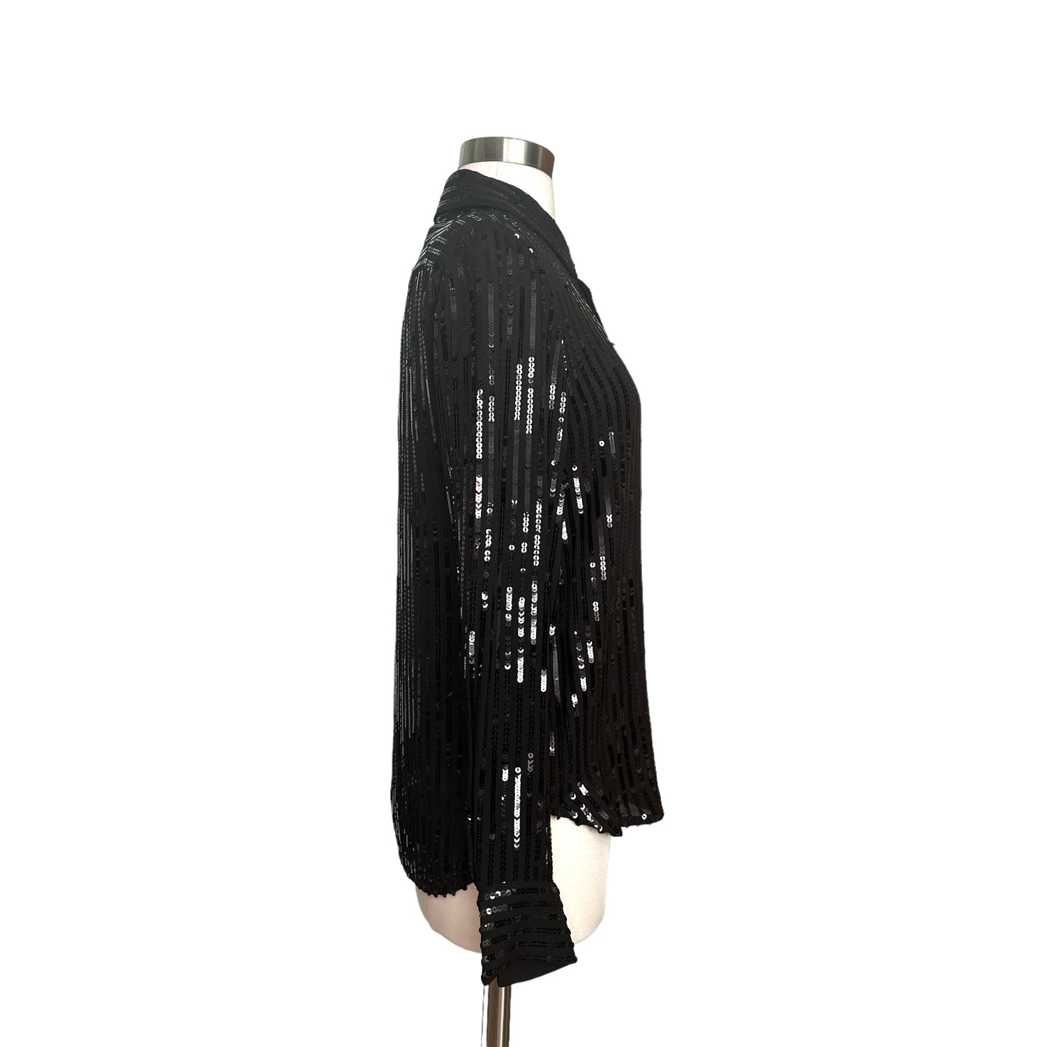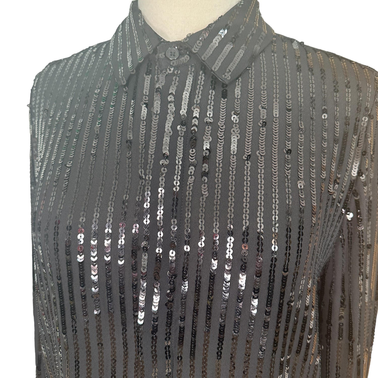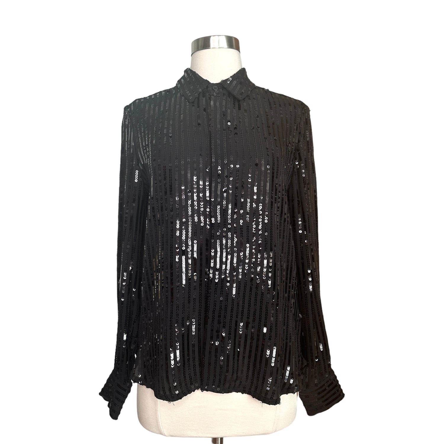 Nili Lotan silk button-up shirt. Black with sequins throughout. Pointed collar. Designer size Small.