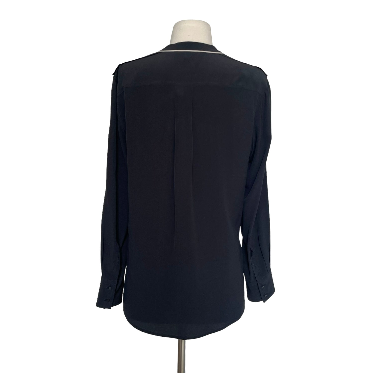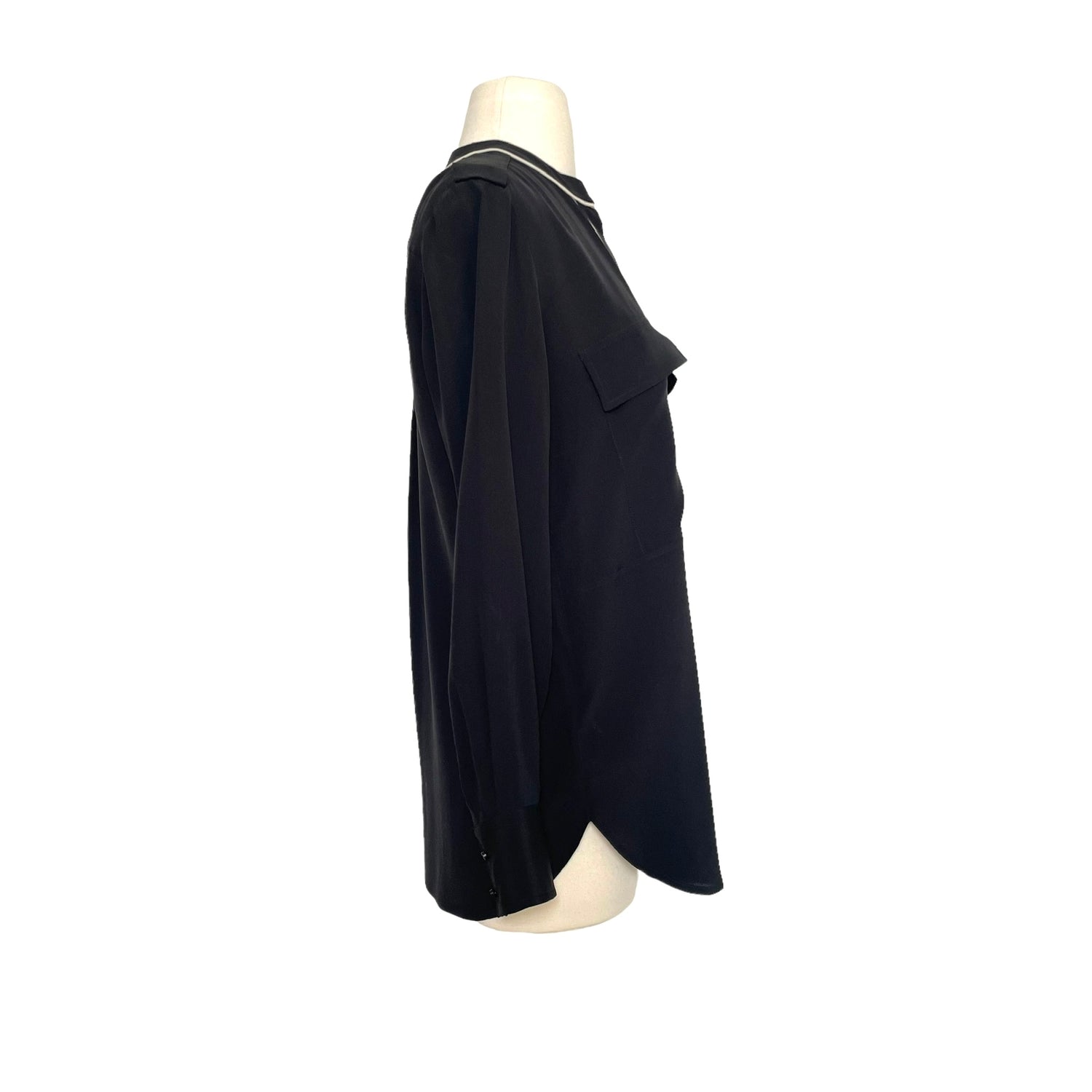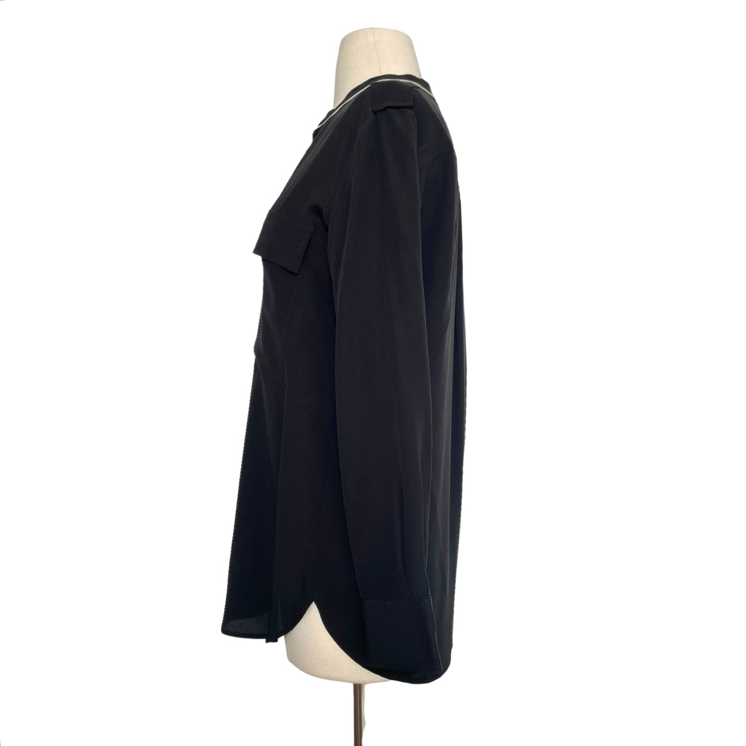 Belstaff black silk shirt. White trim. Collarless. Button closure at front. Designer size 40.