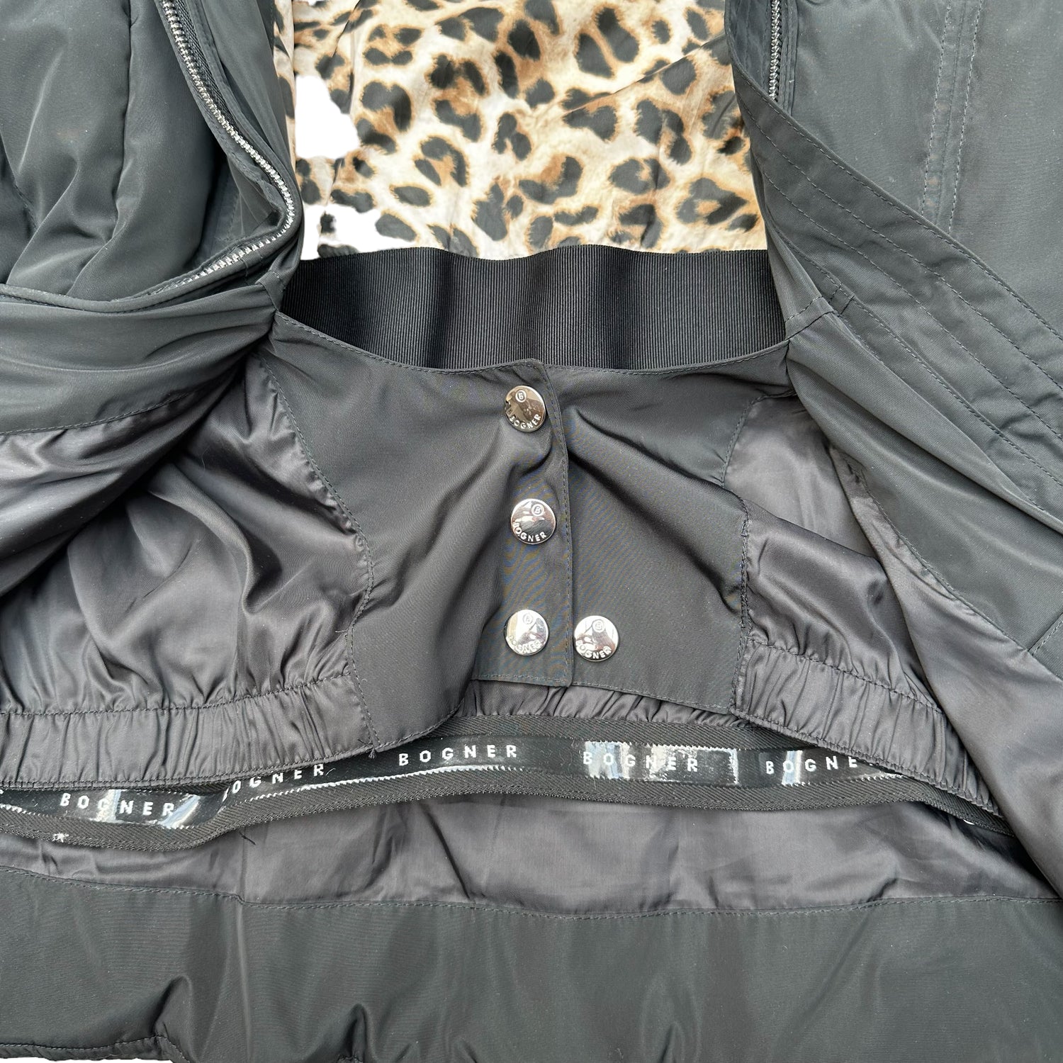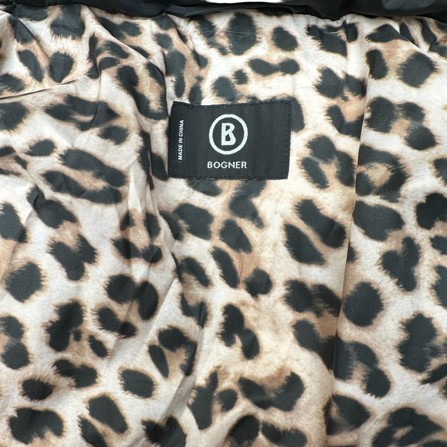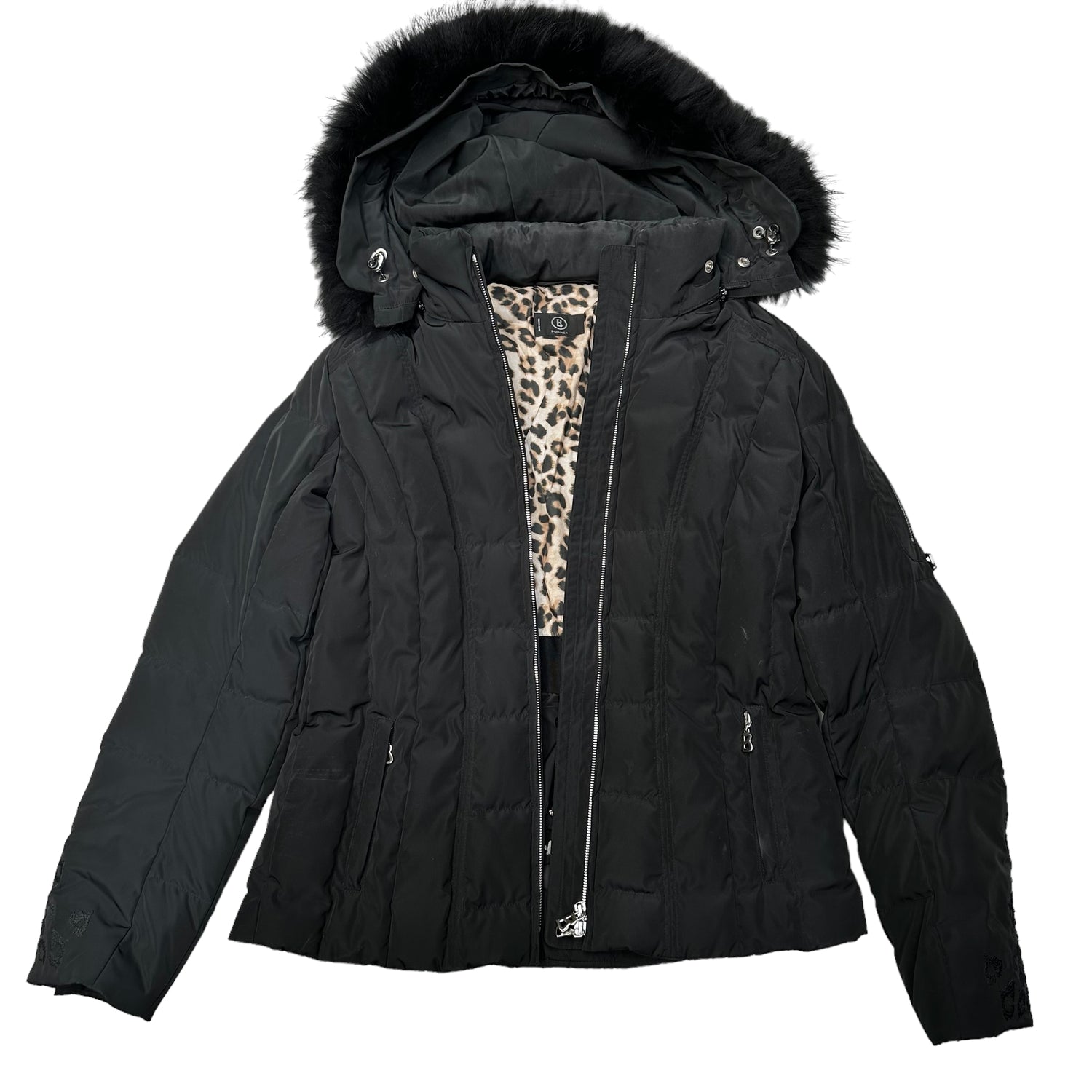 Bogner black puffer coat with fur. Zipper closure at front. Zipper pockets. Fur trip at hoodie. Leopard lining. Designer size 8.