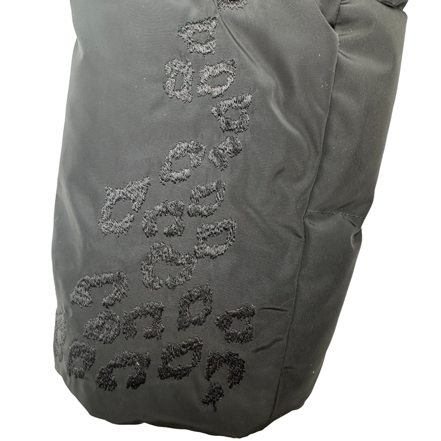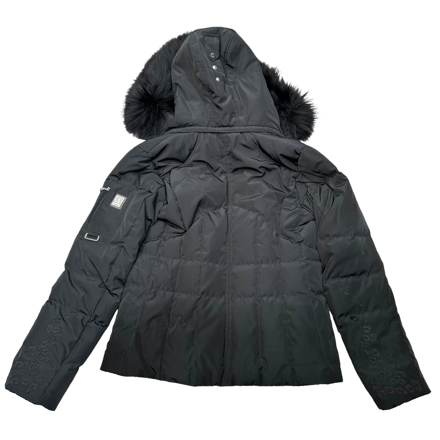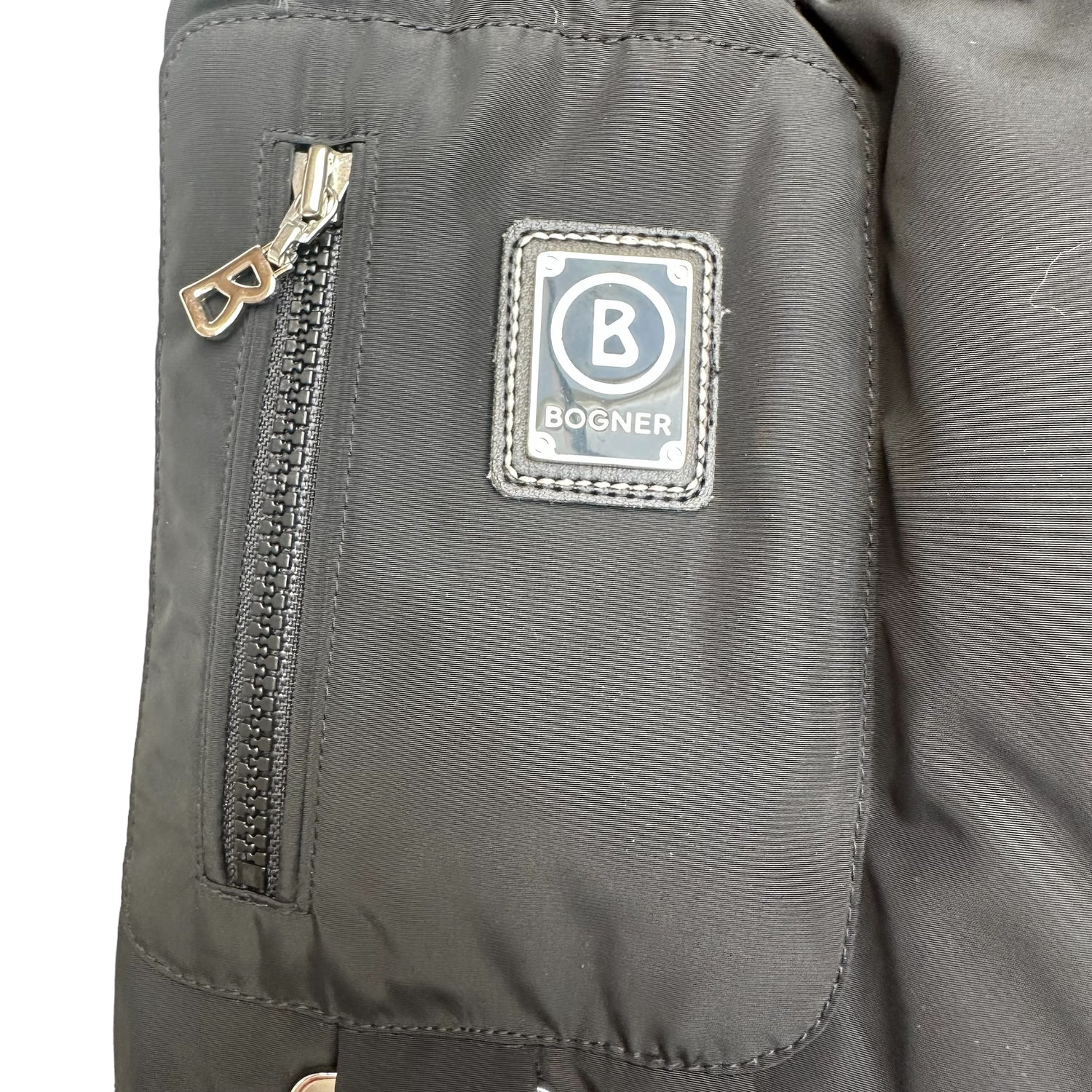Bogner black puffer coat with fur. Zipper closure at front. Zipper pockets. Fur trip at hoodie. Leopard lining. Designer size 8.