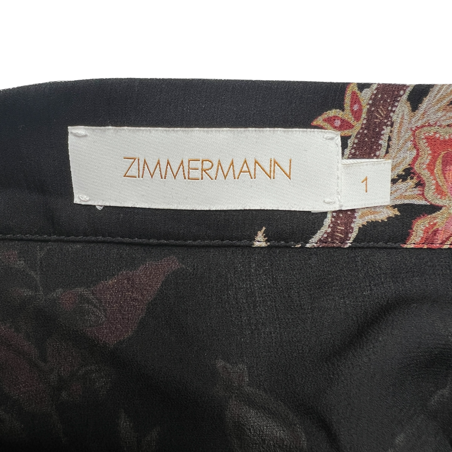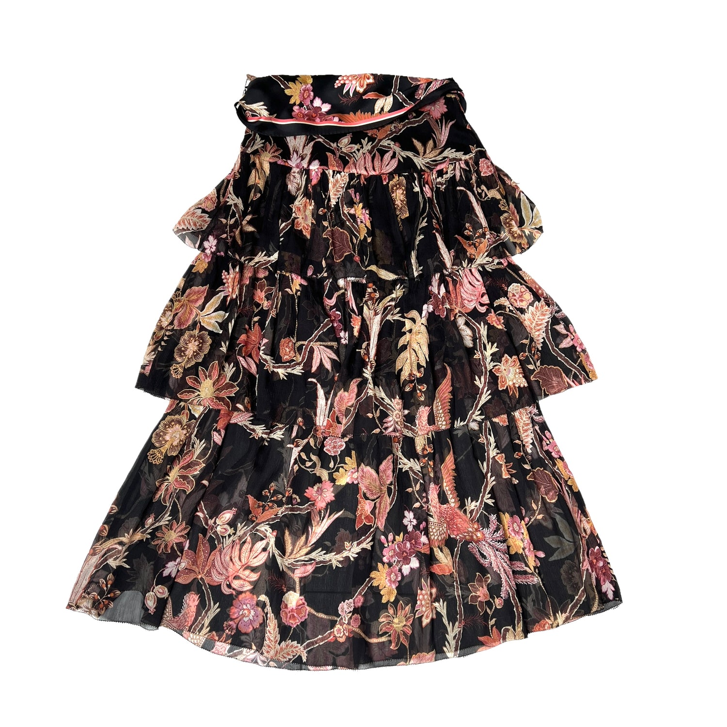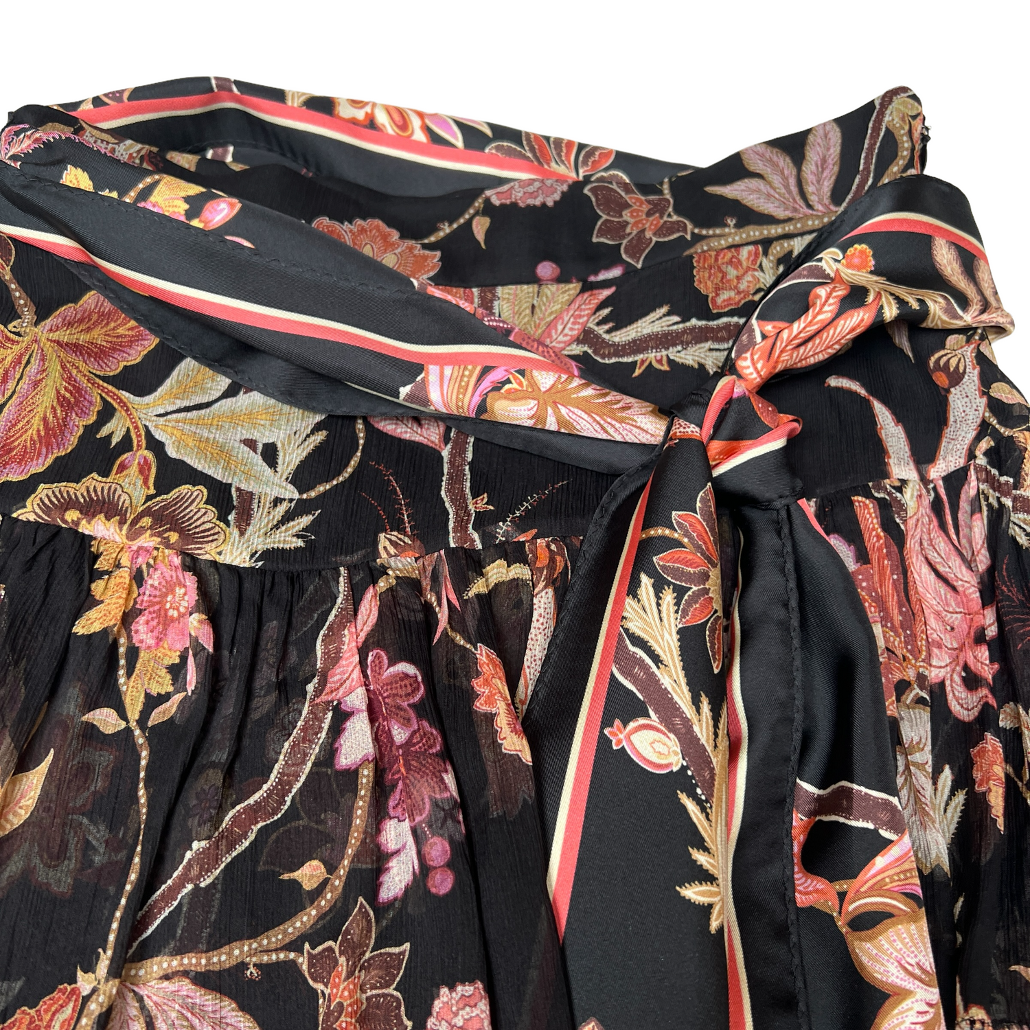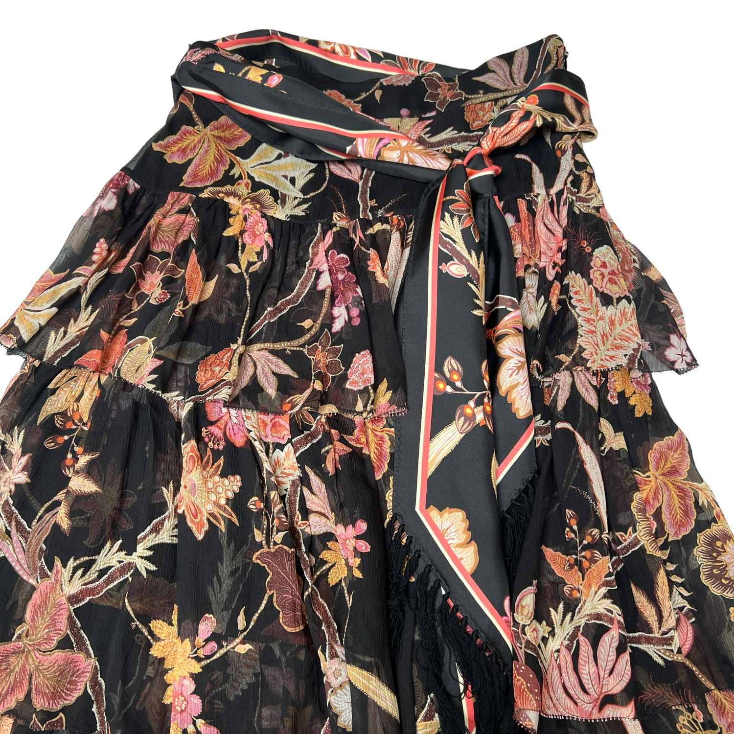 Zimmermann black ruffle silk skirt. Floral print. Zipper closure. Silk scarf with tassels at waist. Designer size 1.
