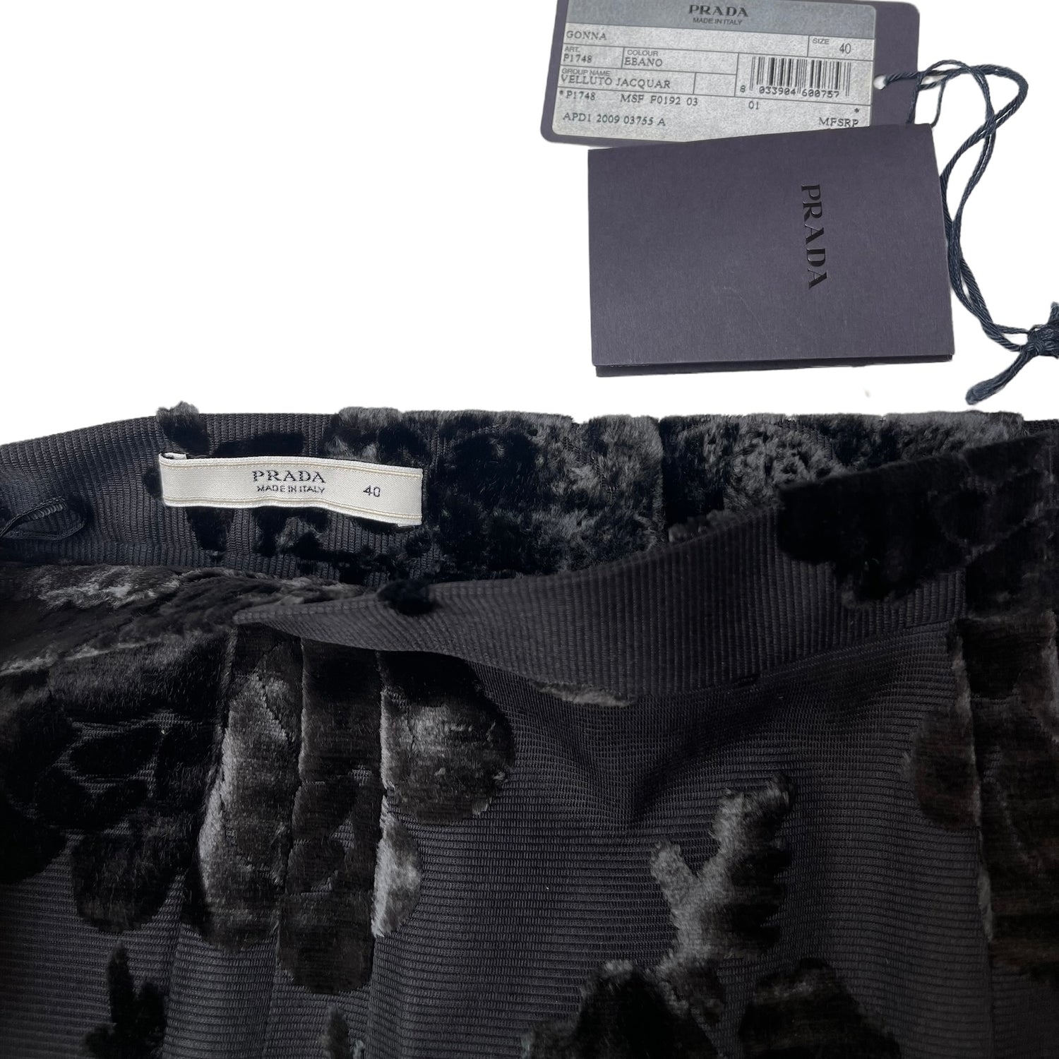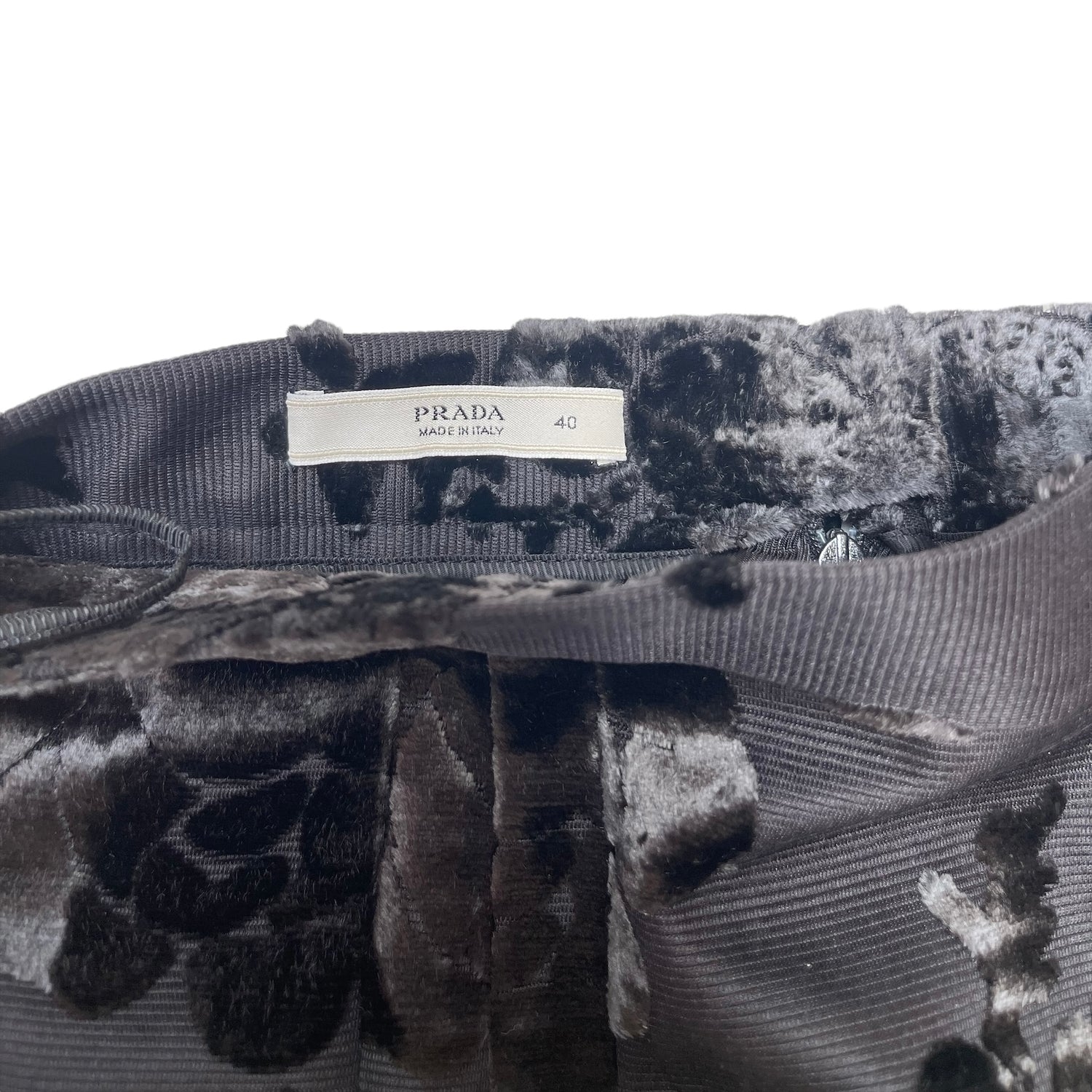 Prada black skirt with velvet floral details. Concealed zipper to close. Size 40.