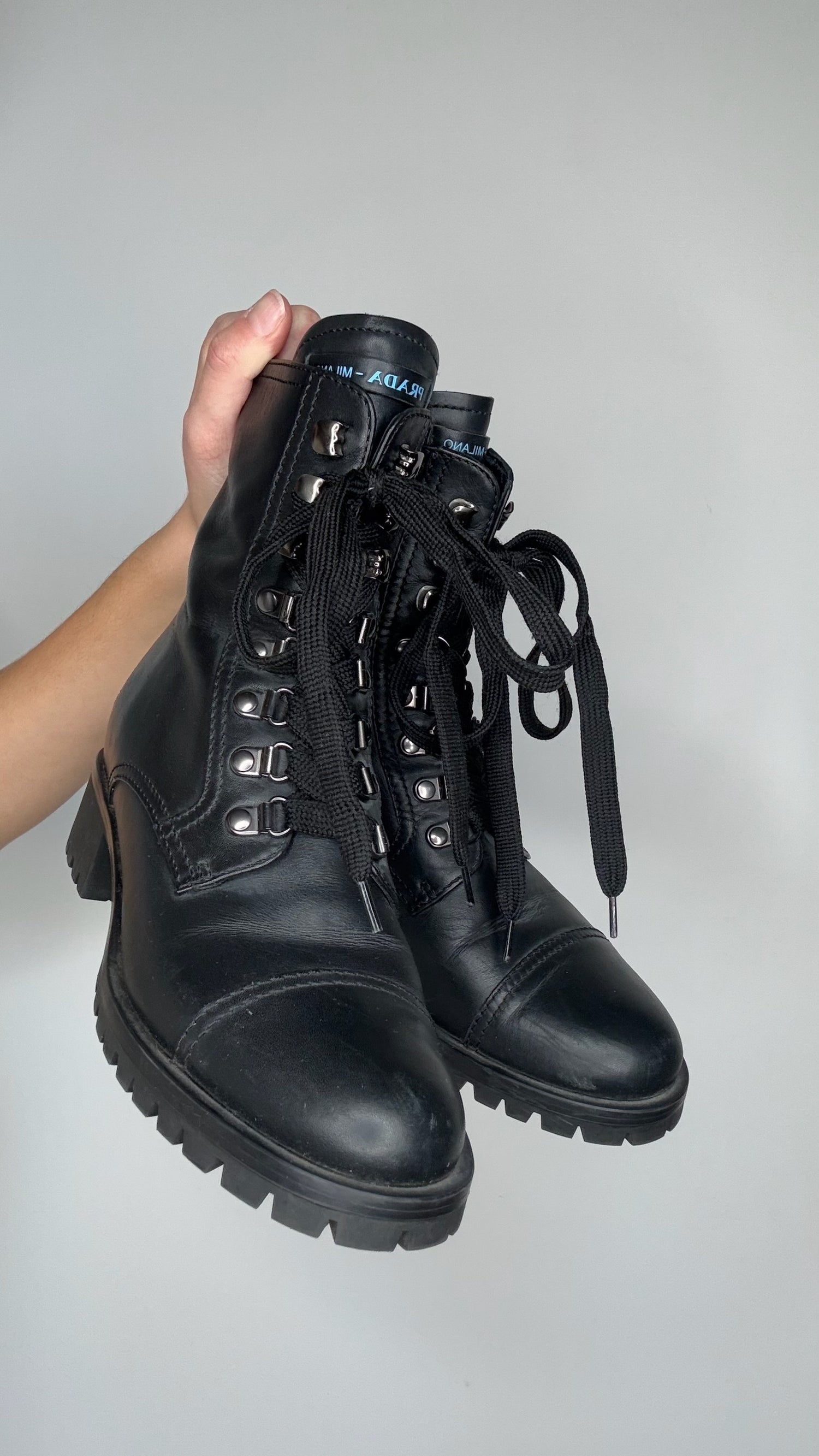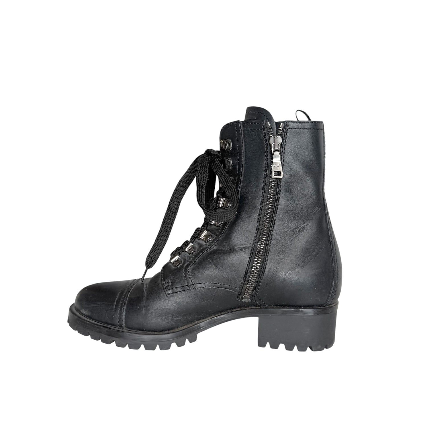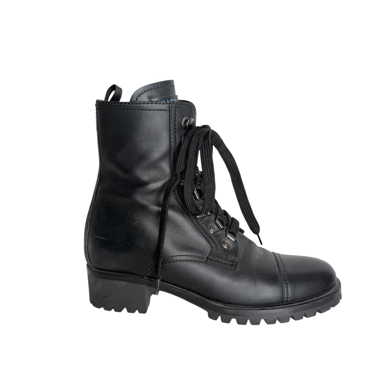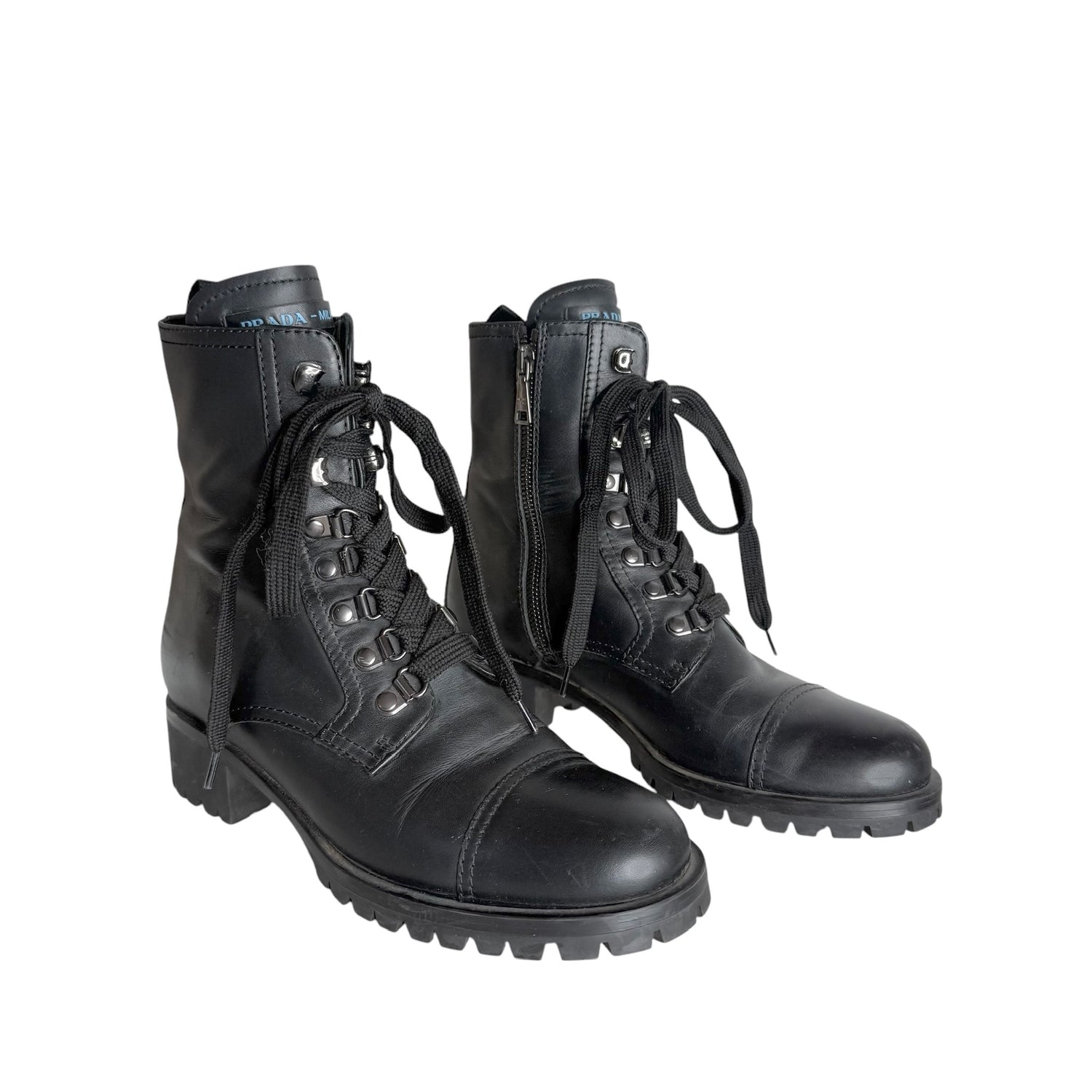 Prada black leather combat boots. Round toe. Laces closure at front. Zipper closure at sides. Blue logo boots at front. Designer size 37