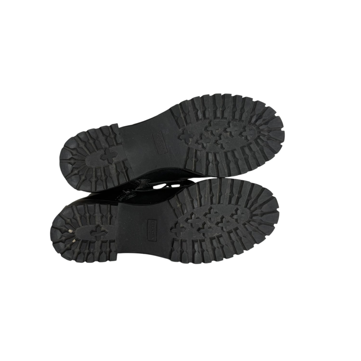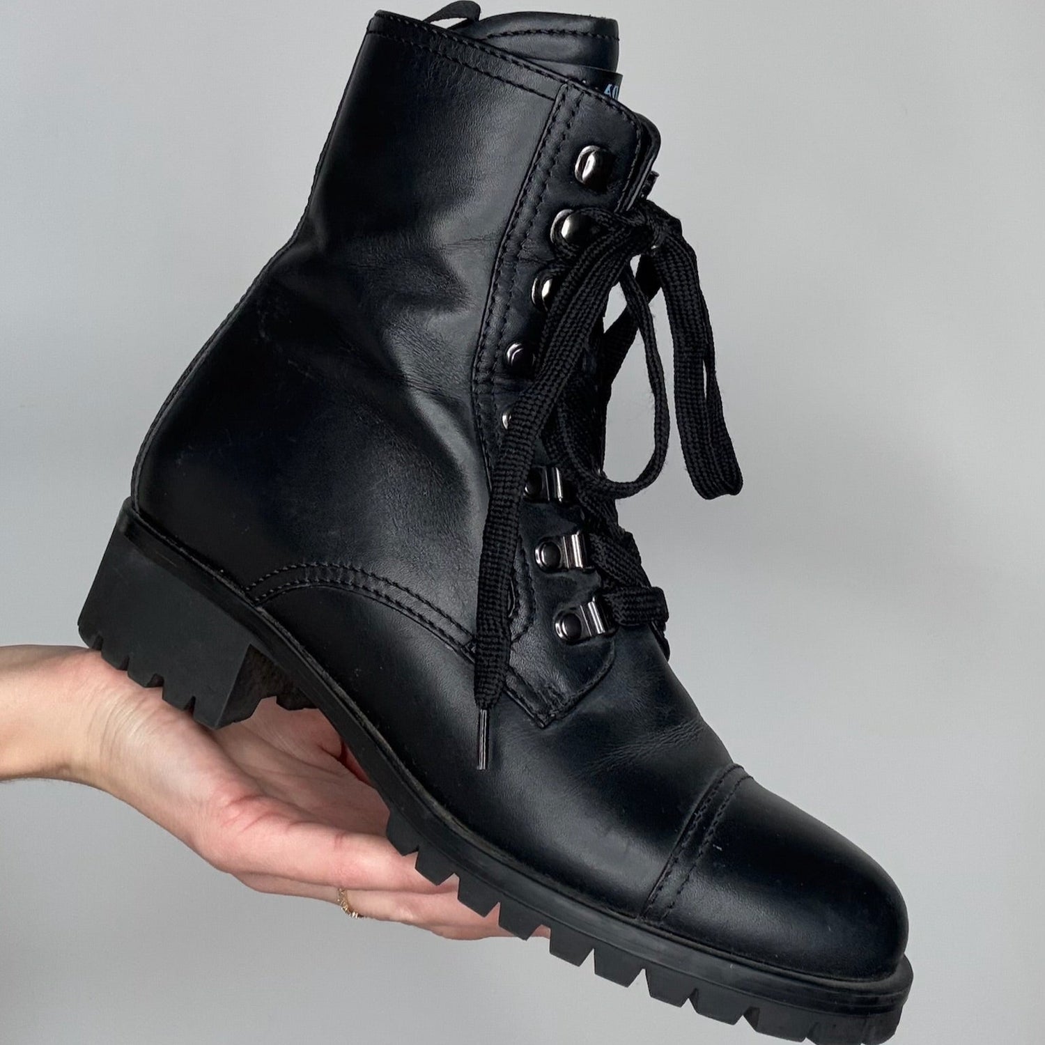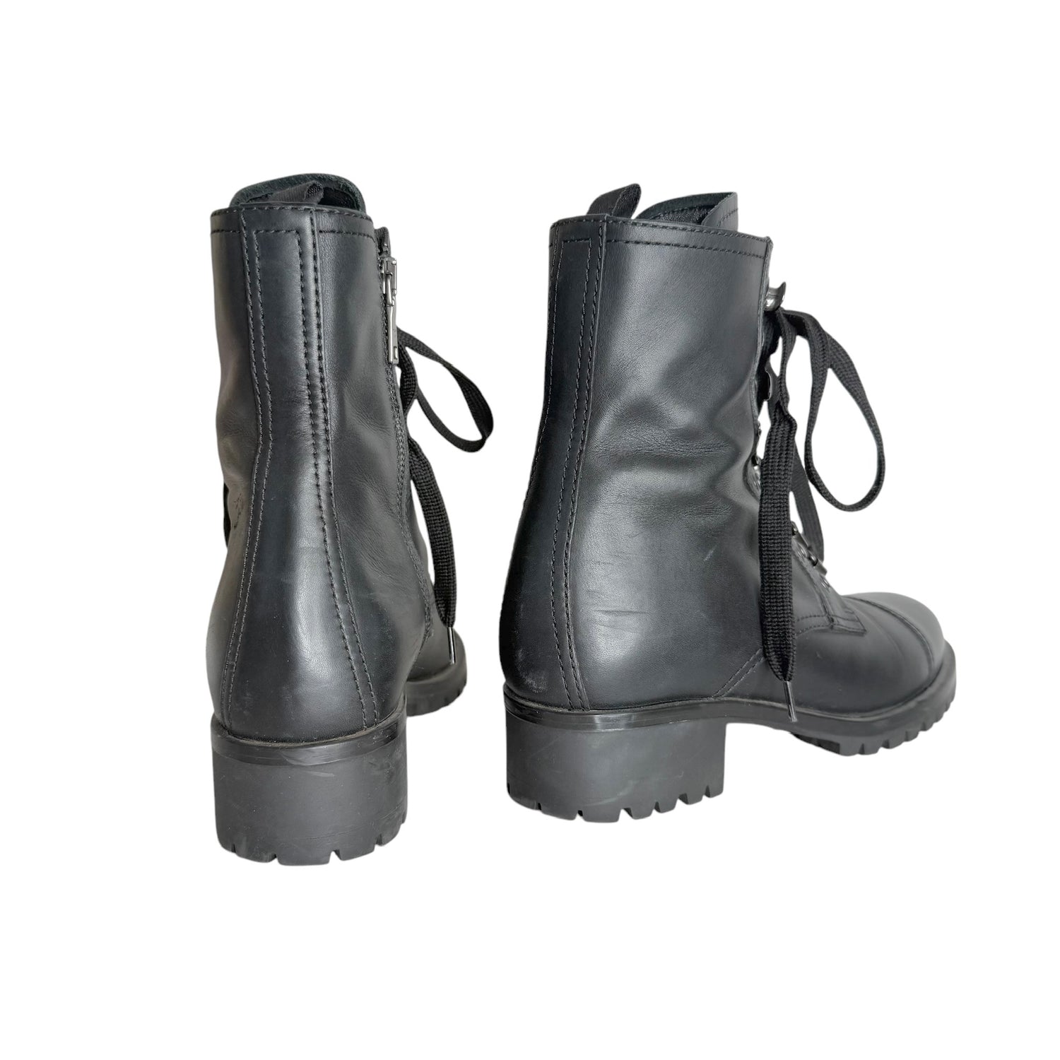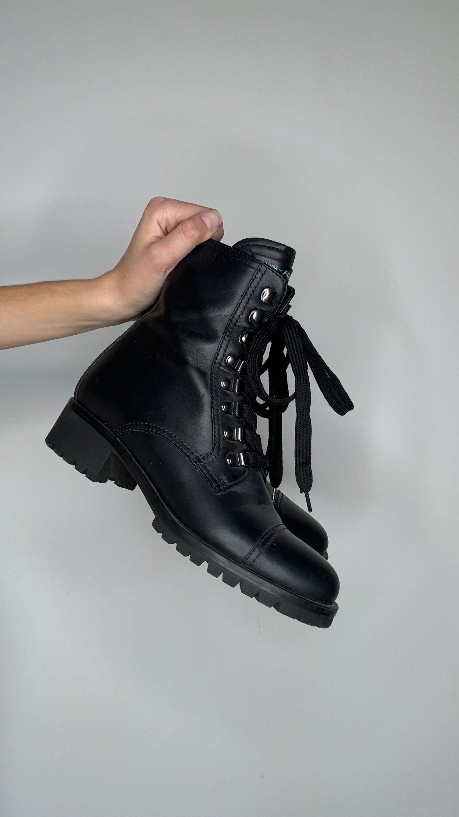 Prada black leather combat boots. Round toe. Laces closure at front. Zipper closure at sides. Blue logo boots at front. Designer size 37