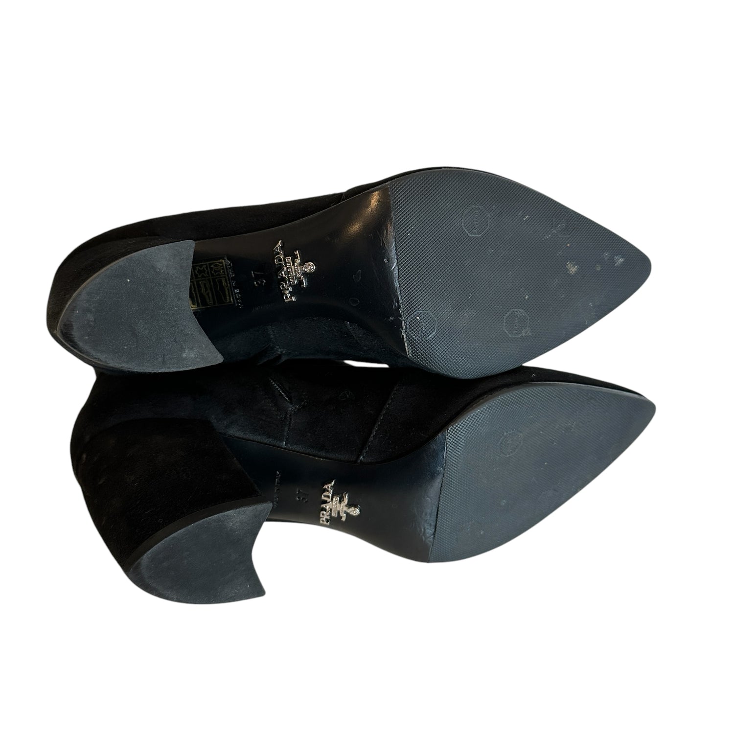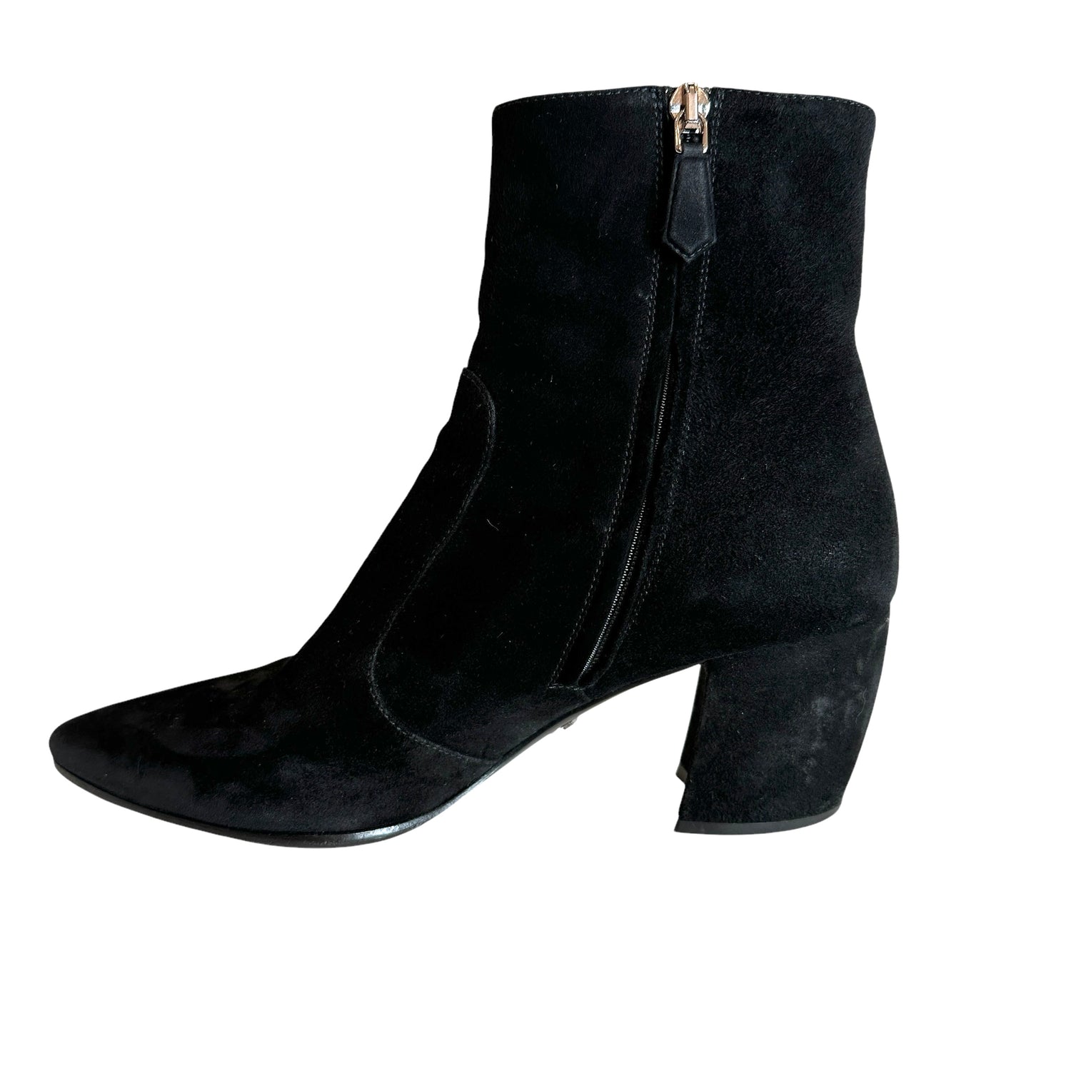 Prada black suede boots. Pointed toe. Zipper closure at inside. Designer size 37.