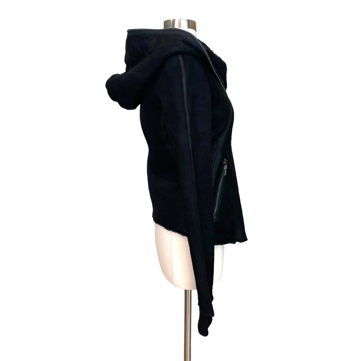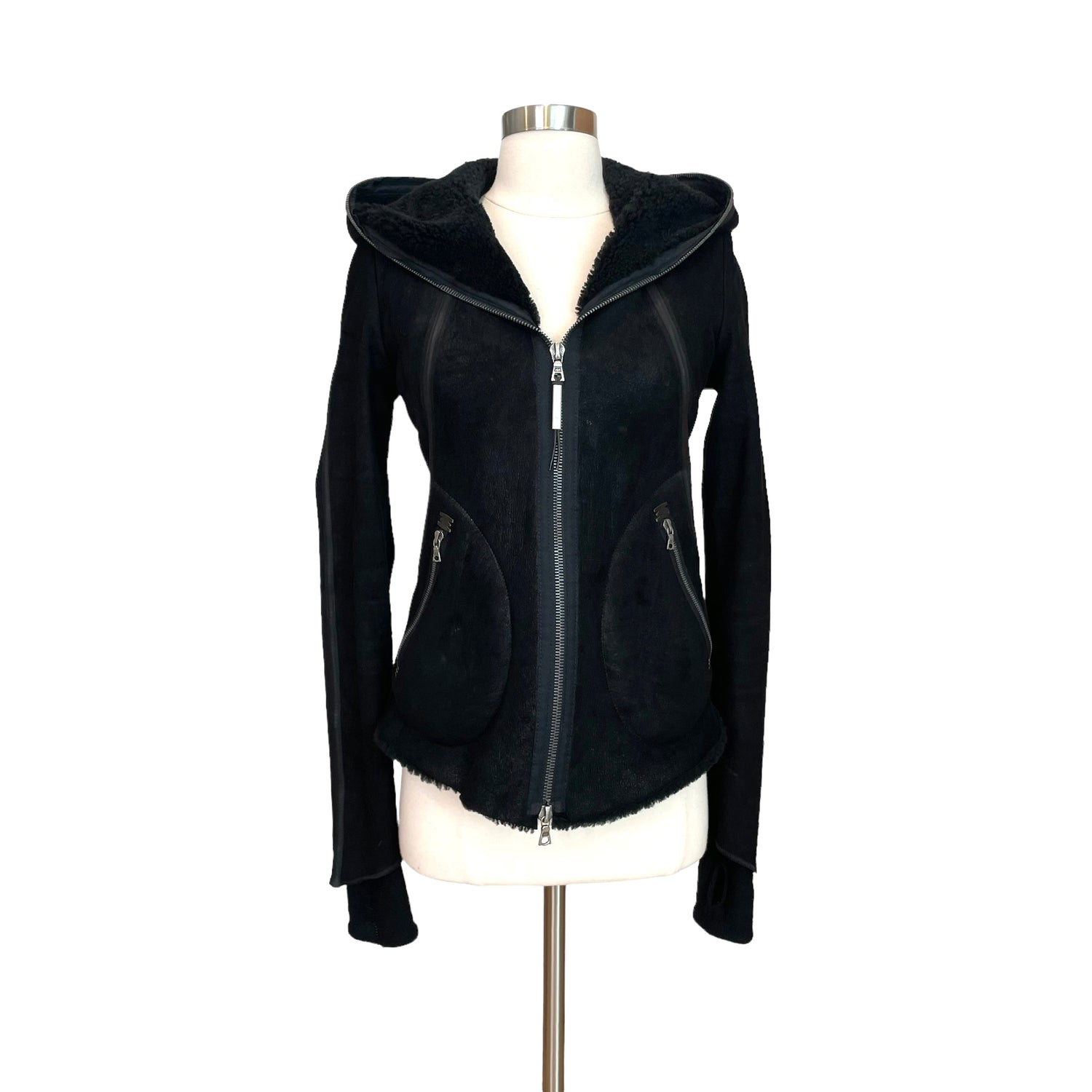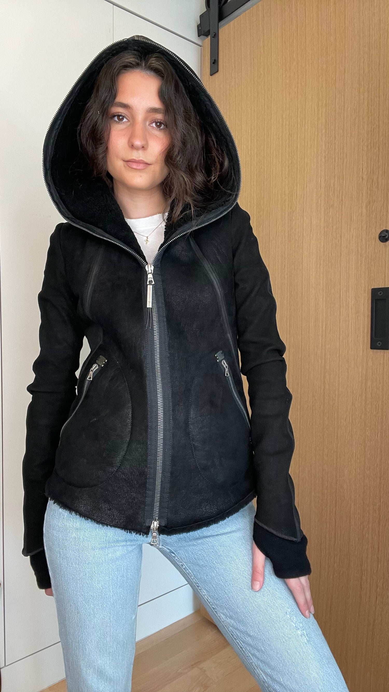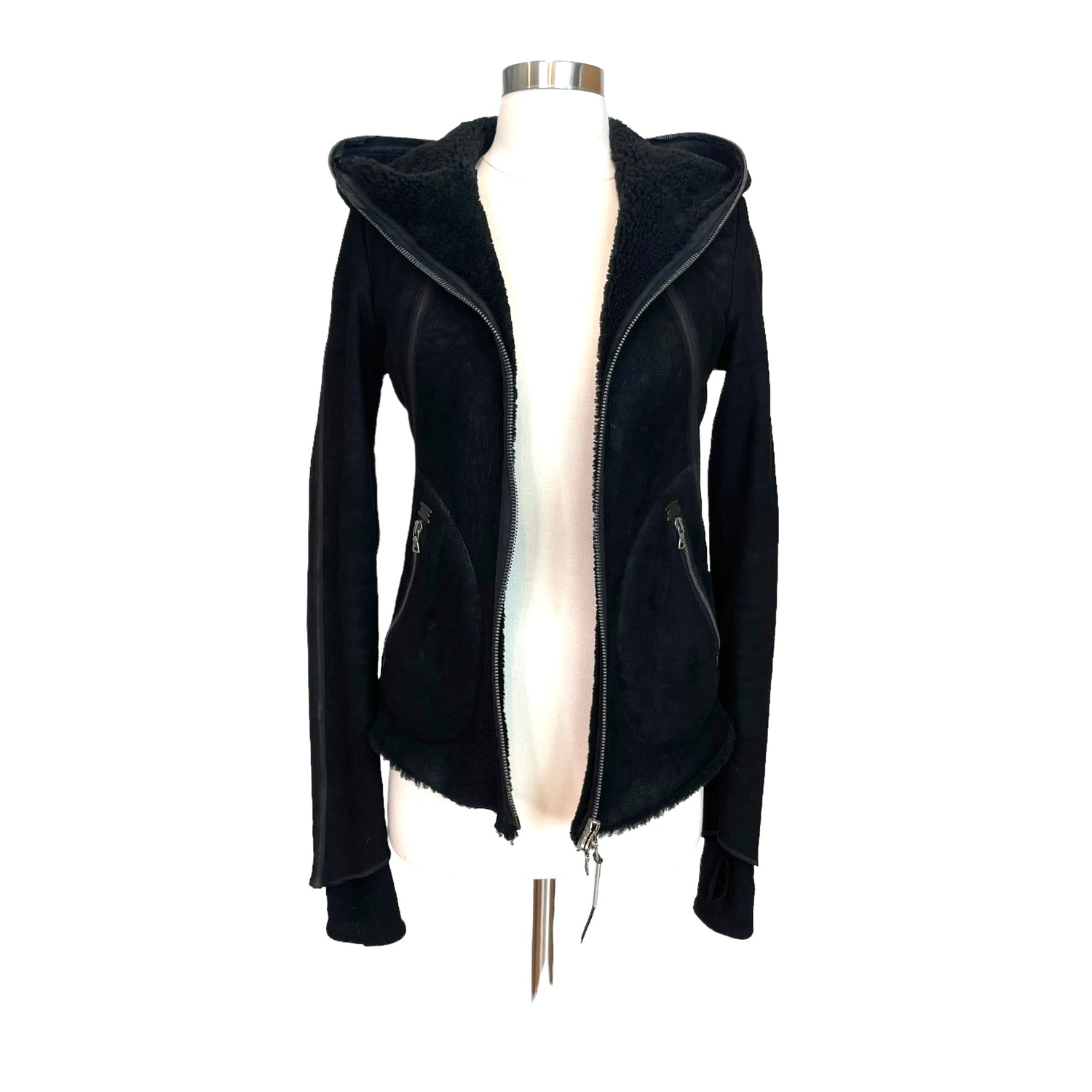 Isaac Sellam black suede and shearling jacket with hood. Zipper closure at front. Zipper pockets. Designer size 38.