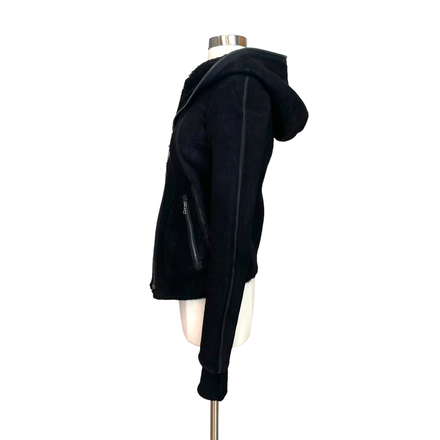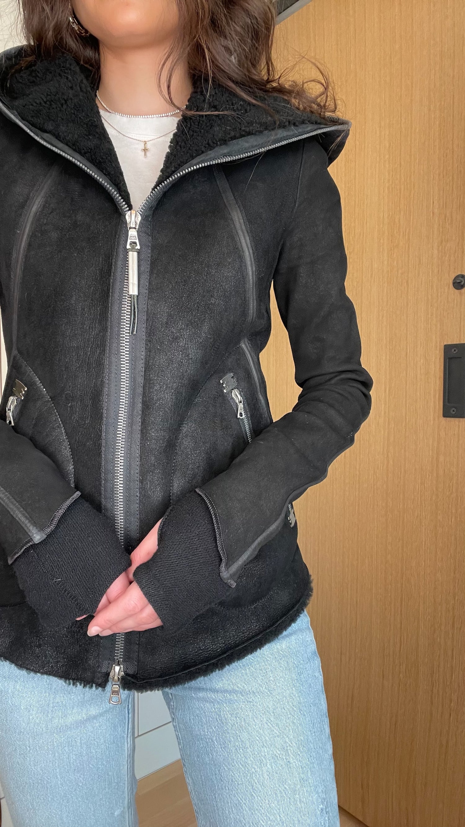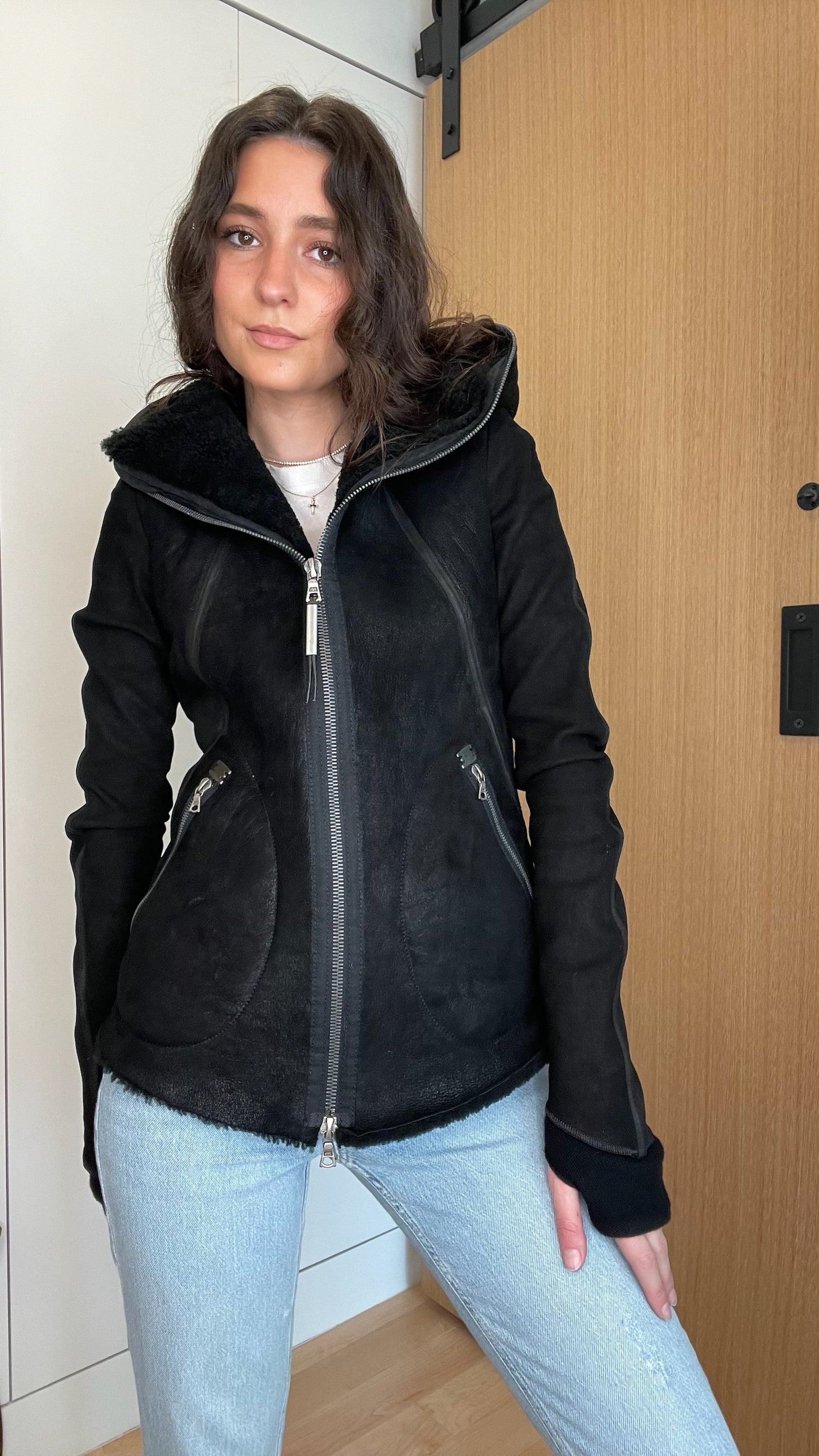 Isaac Sellam black suede and shearling jacket with hood. Zipper closure at front. Zipper pockets. Designer size 38.