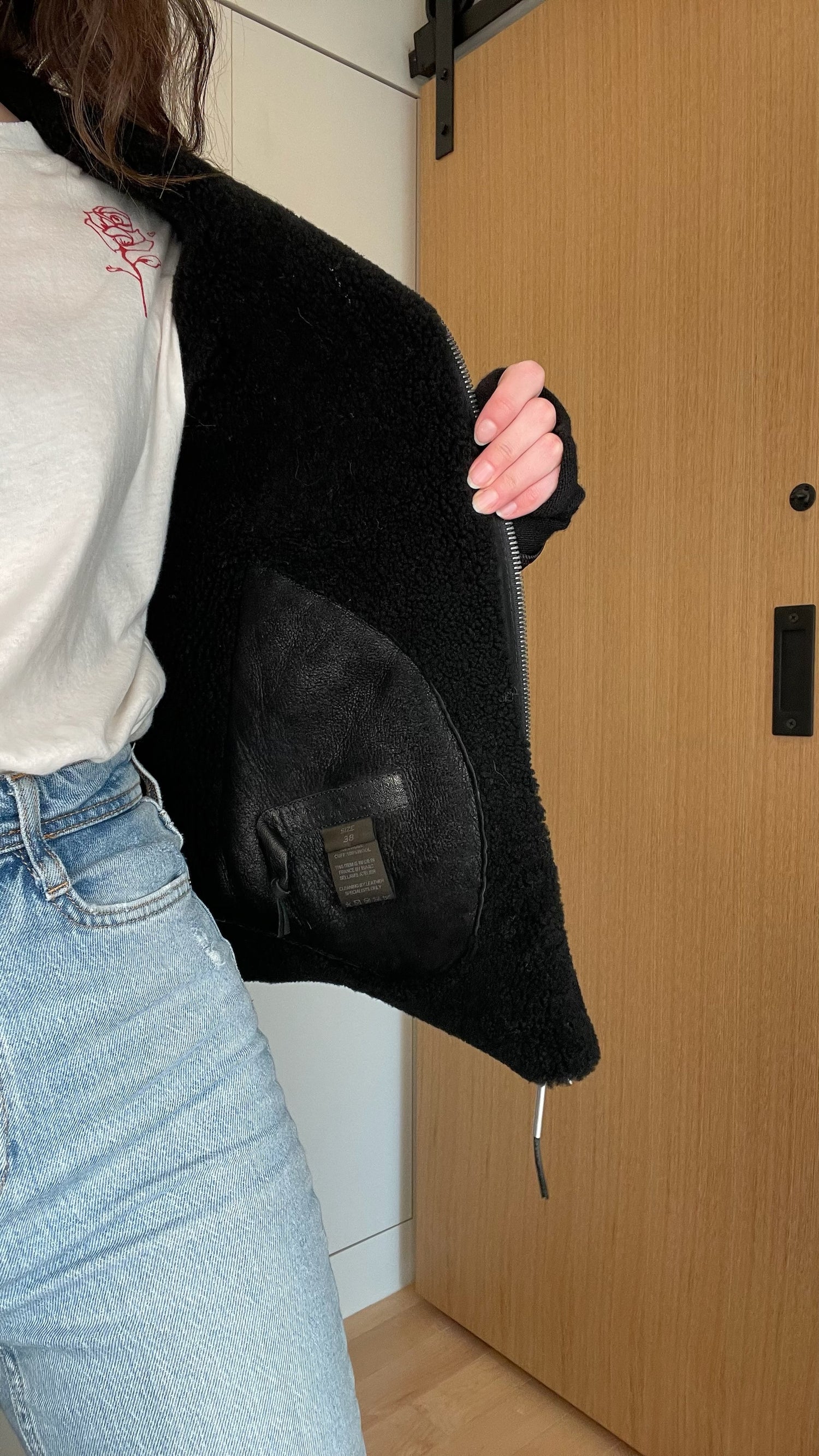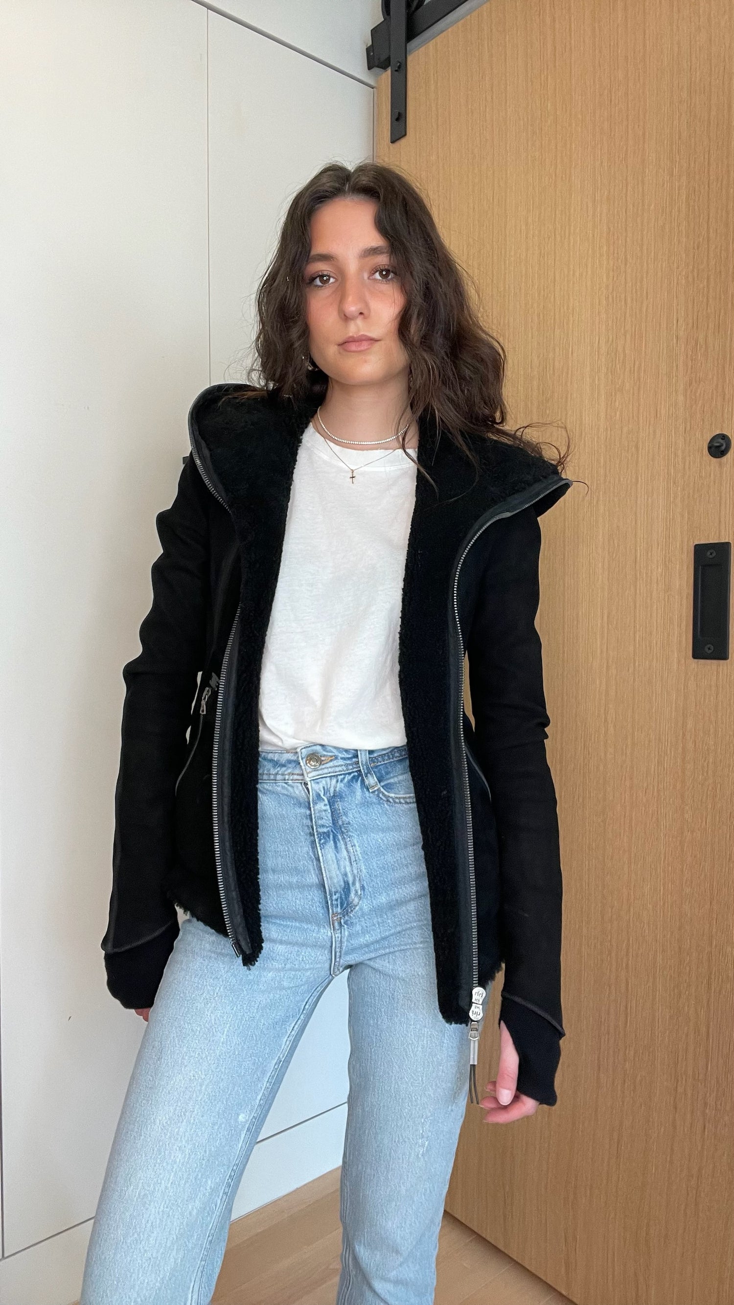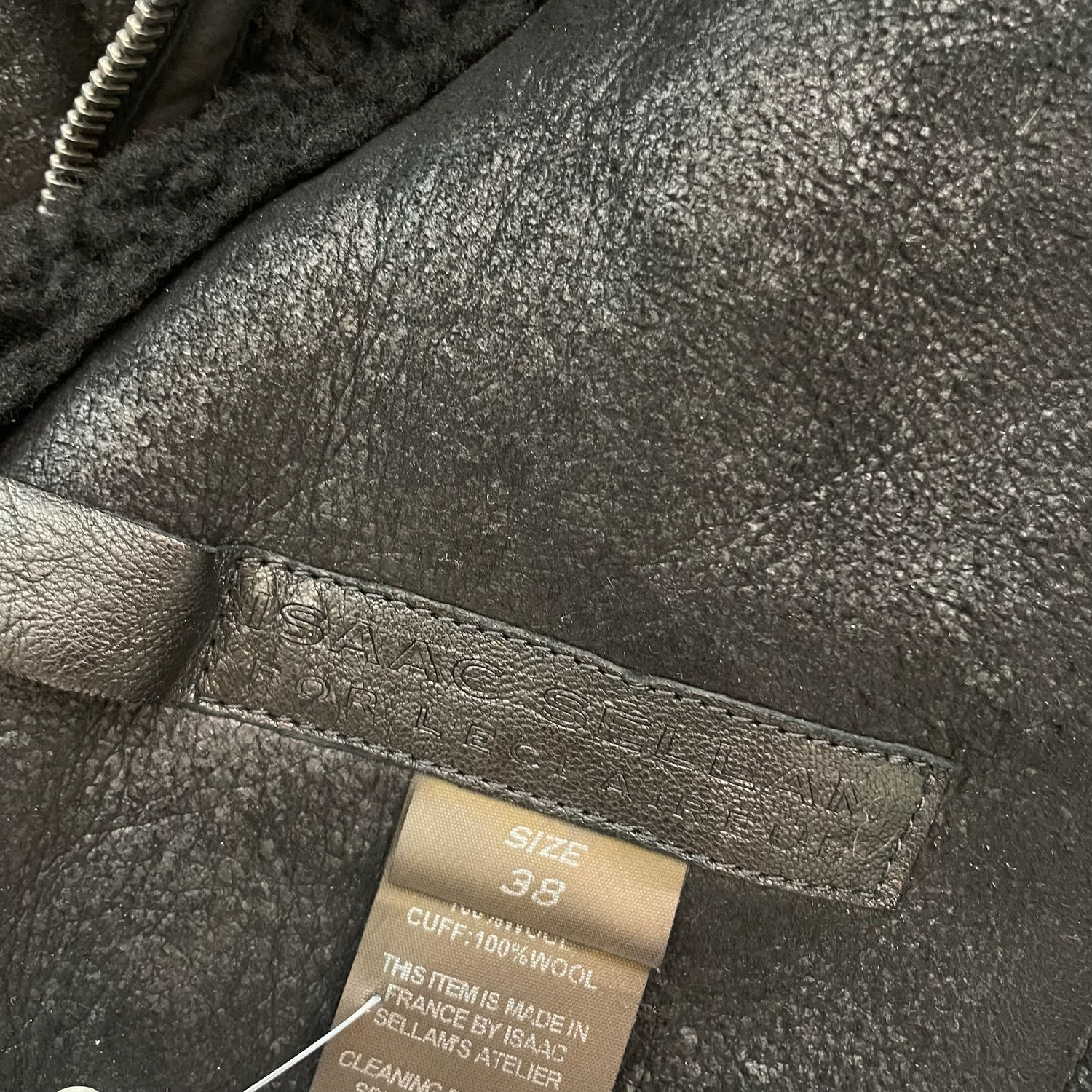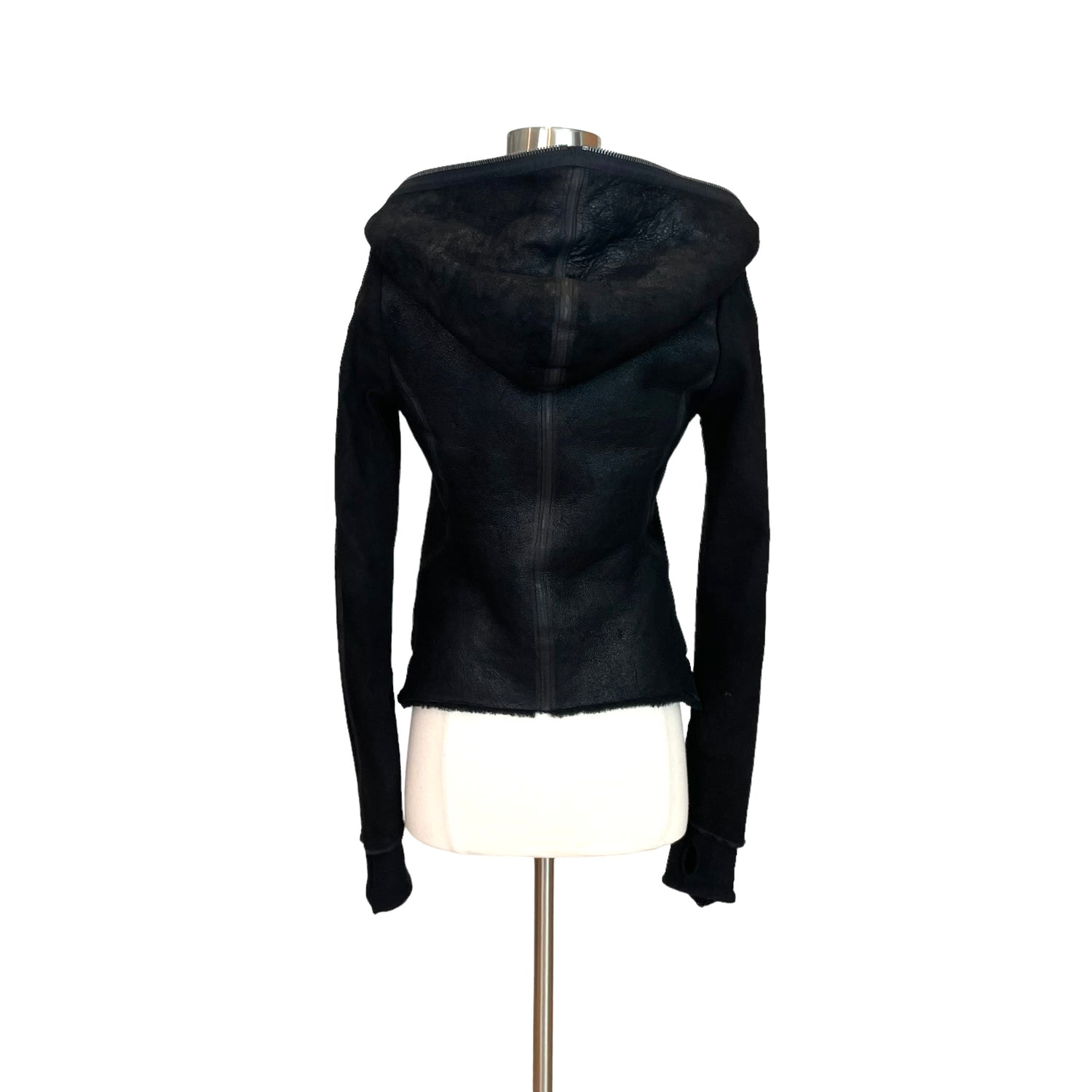 Isaac Sellam black suede and shearling jacket with hood. Zipper closure at front. Zipper pockets. Designer size 38.