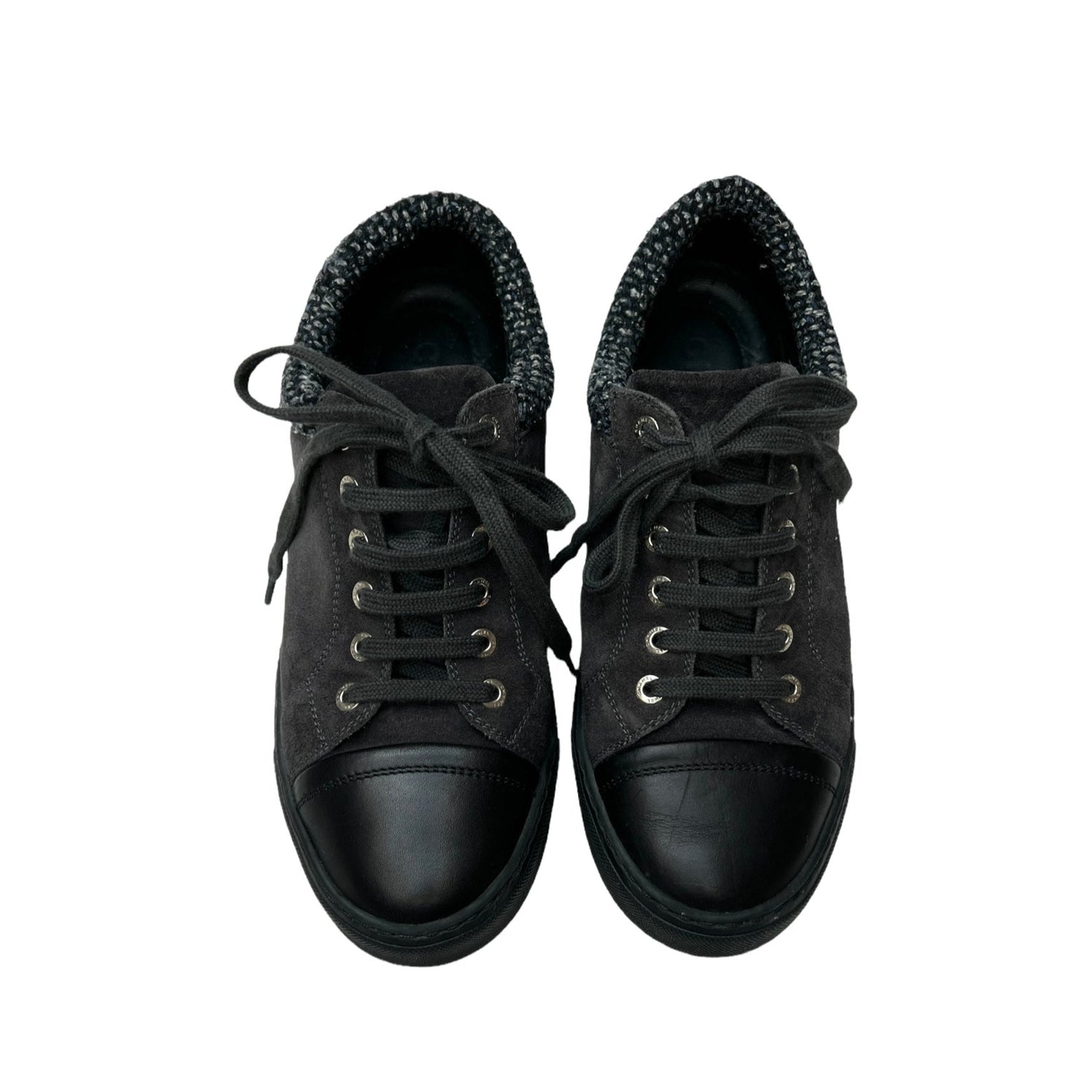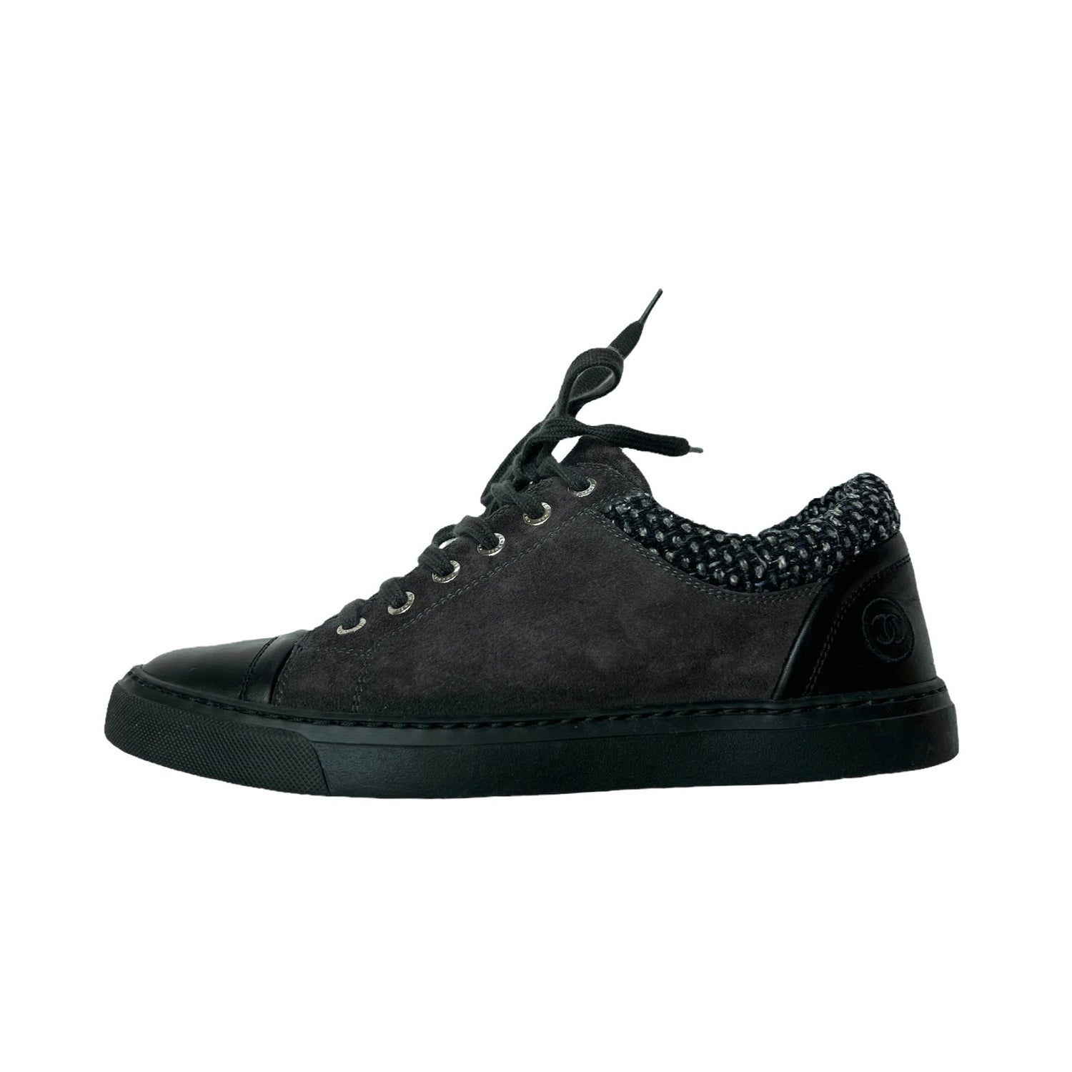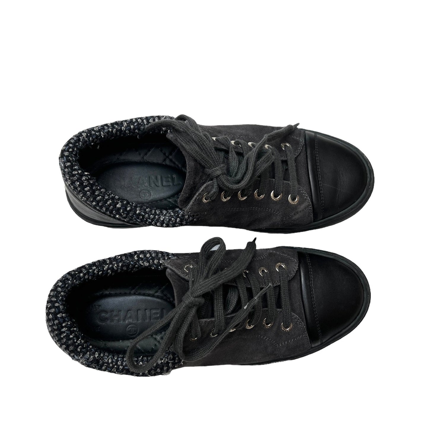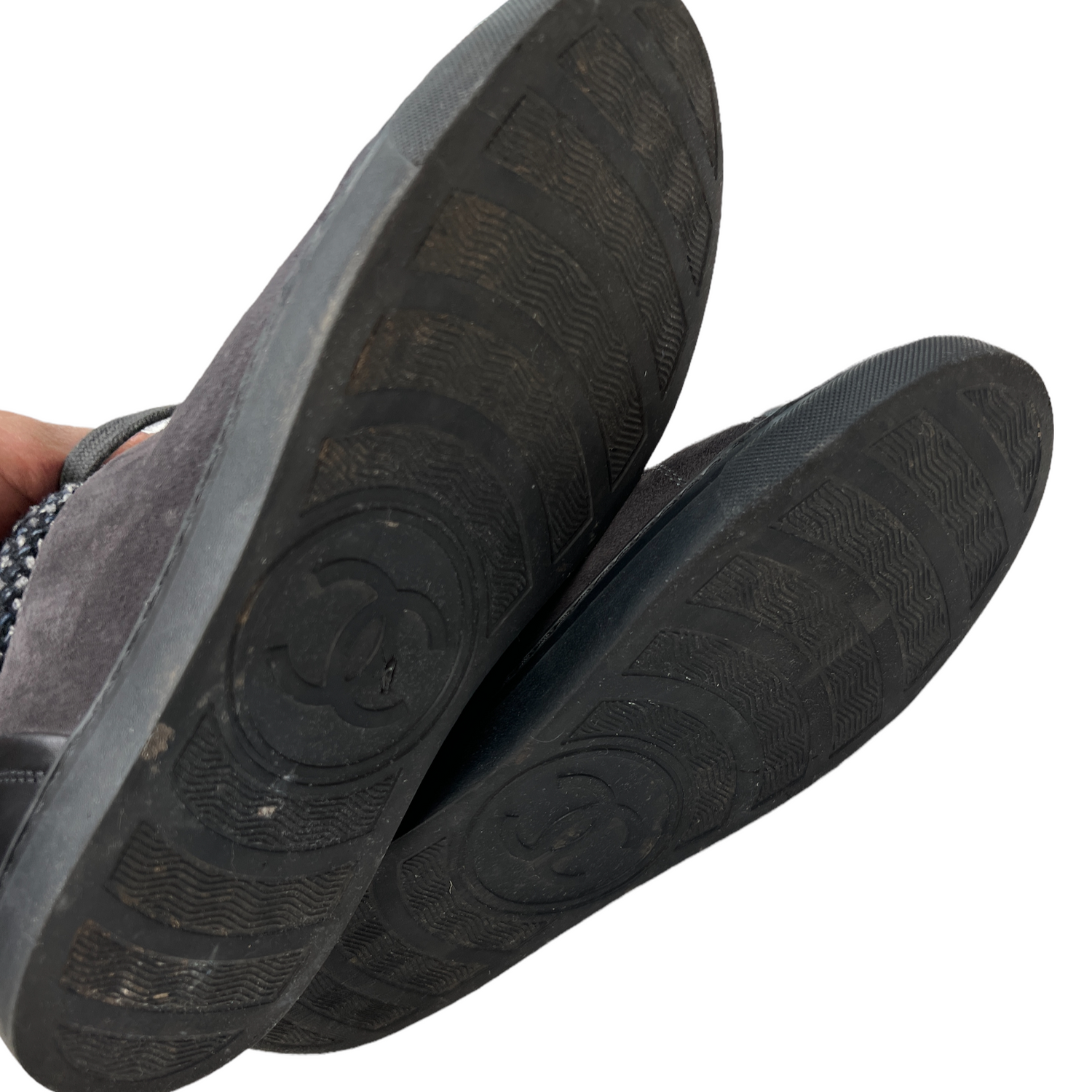 Chanel black suede sneakers with grey and blue tweed. Logo on the side. Size 37.