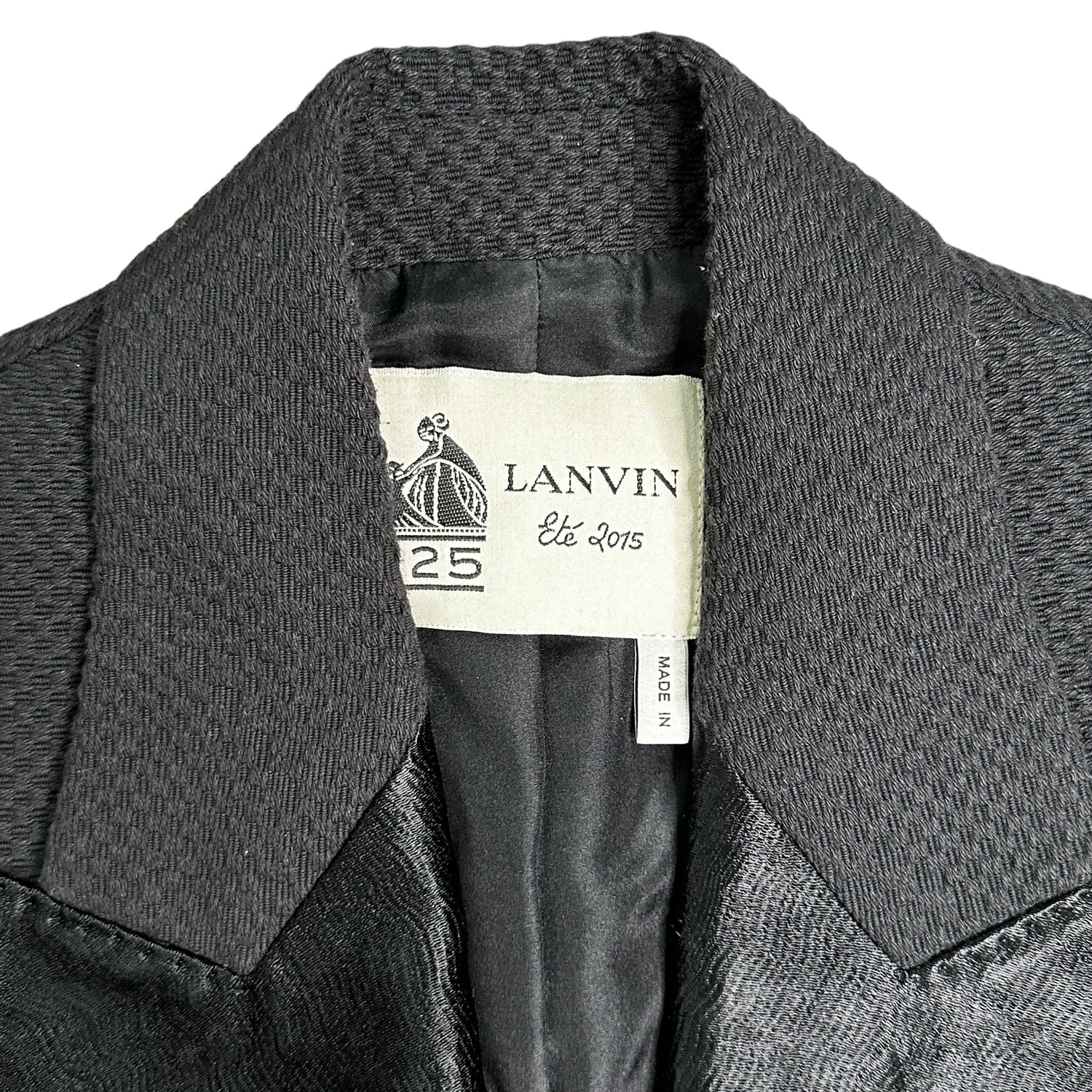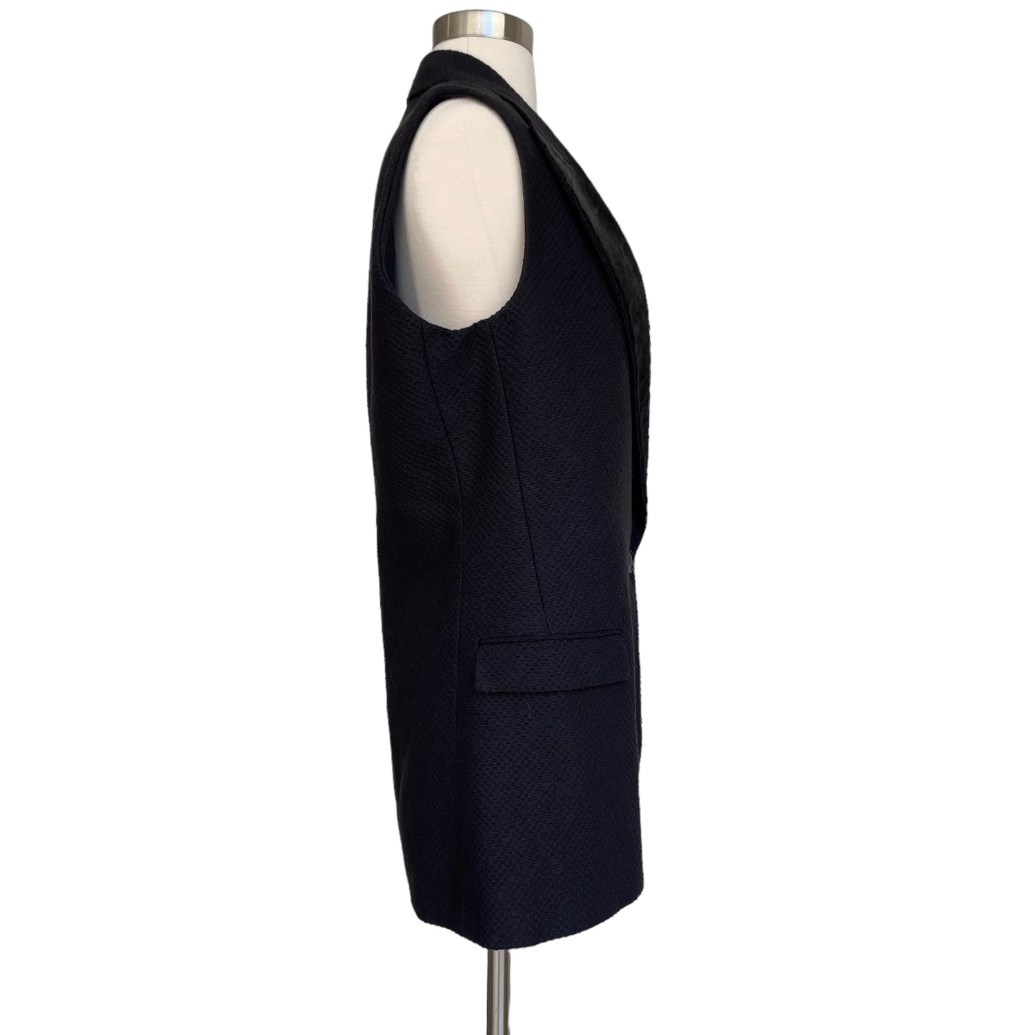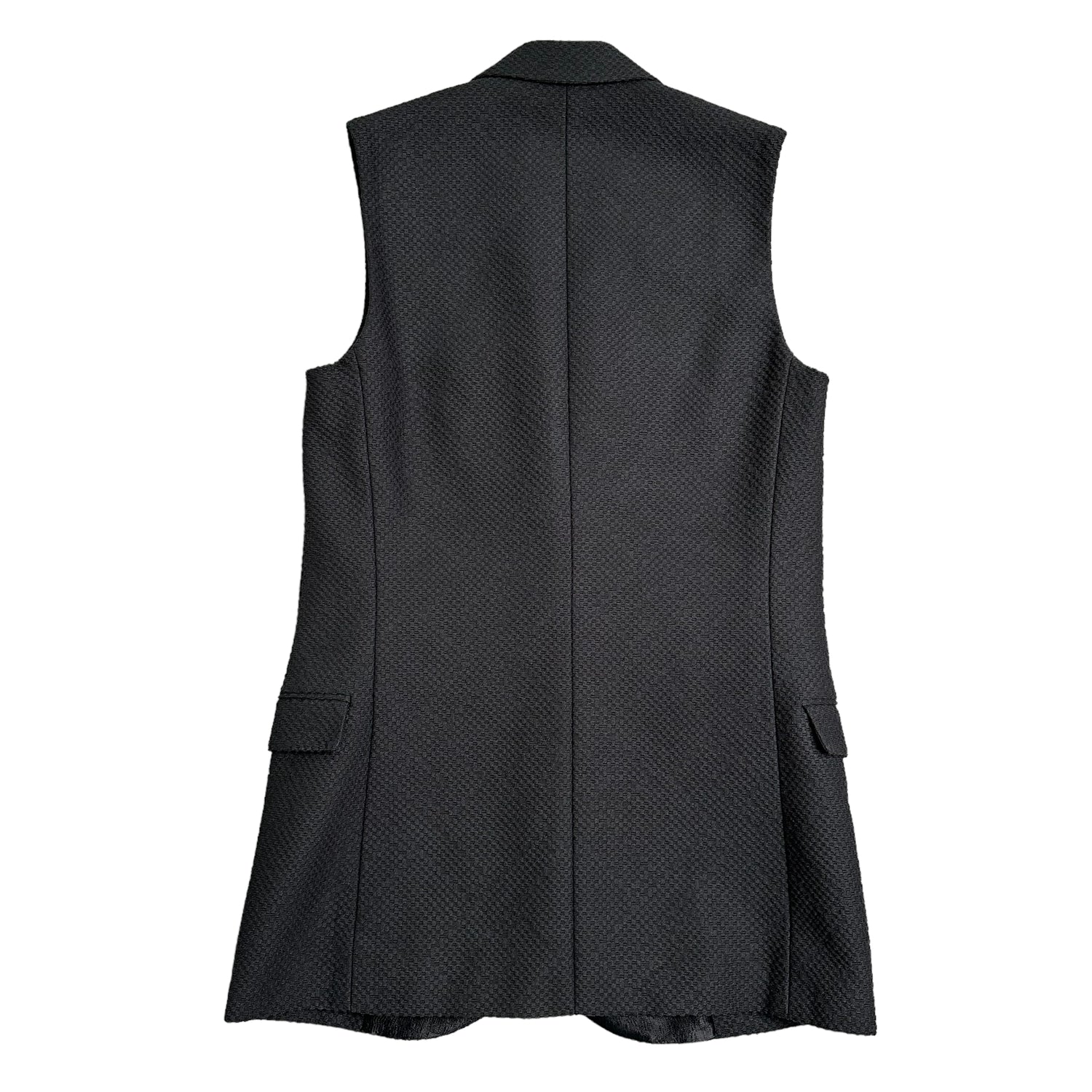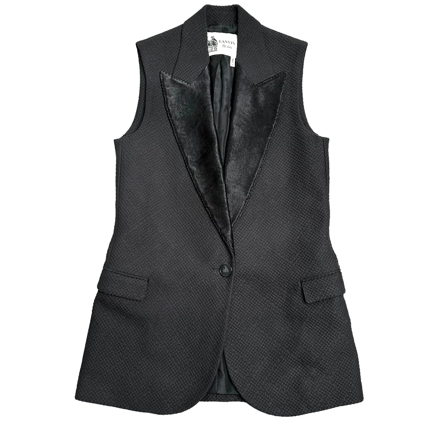 Lanvin long black vest. Summer 2015 collection. One button closure at front. Pointed collar. Beautiful textured fabrics. Two flap pockets. Designer size 36.