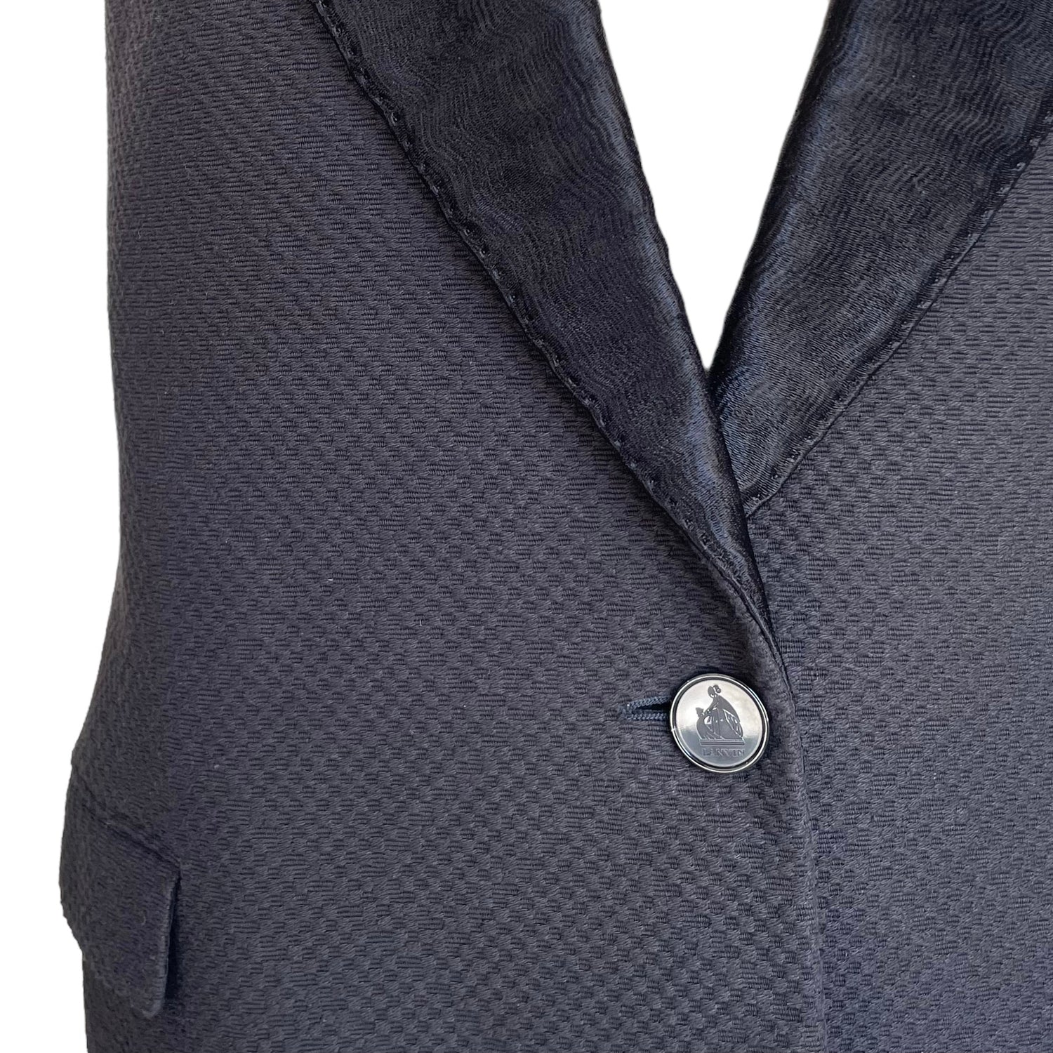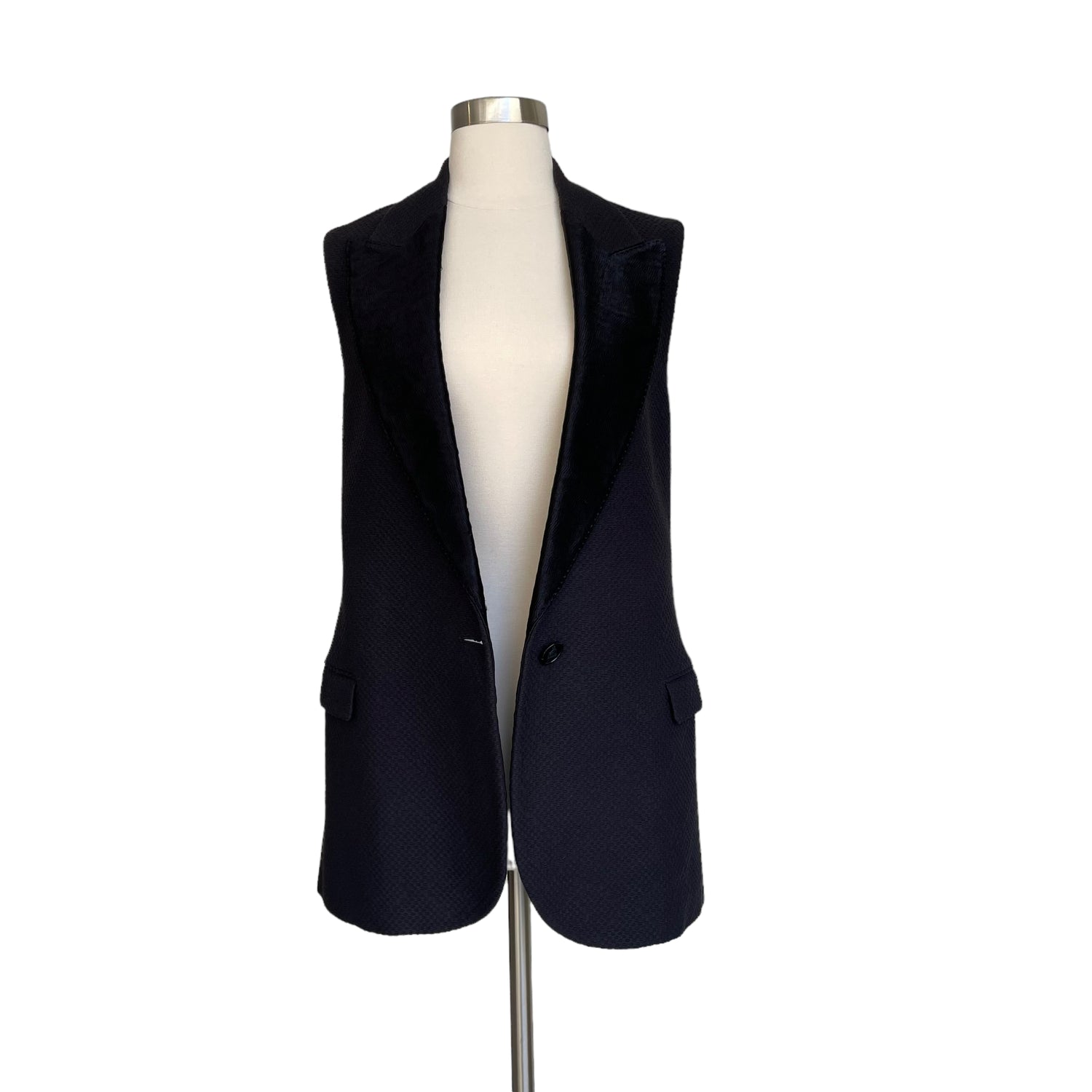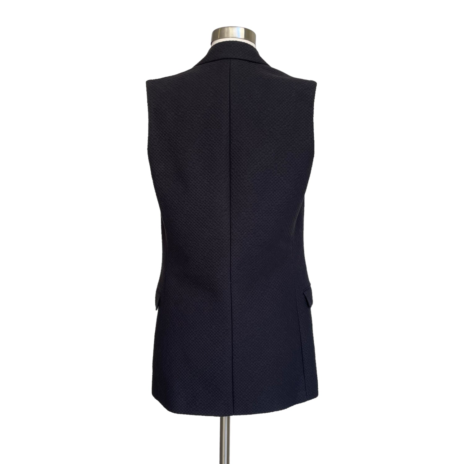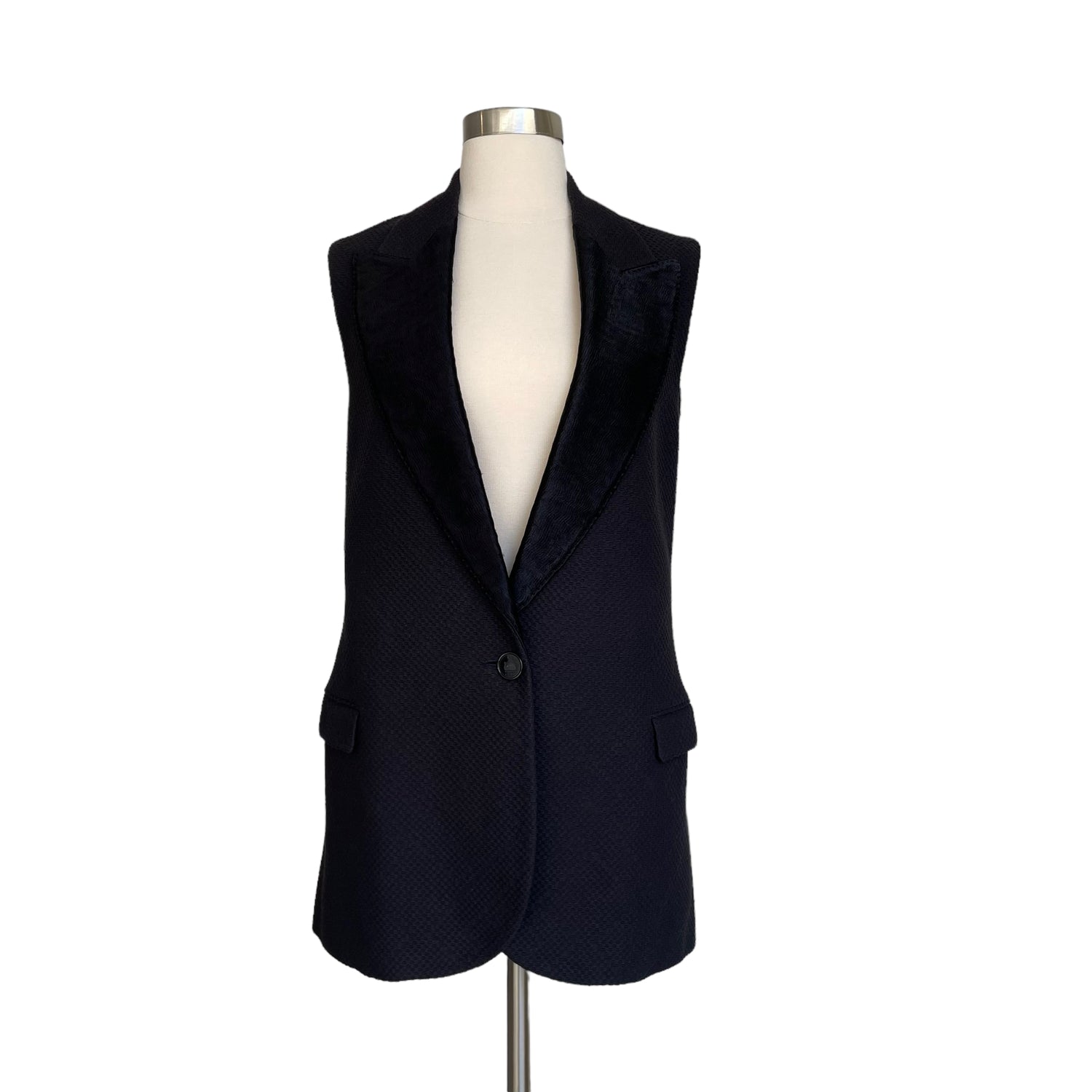 Lanvin long black vest. Summer 2015 collection. One button closure at front. Pointed collar. Beautiful textured fabrics. Two flap pockets. Designer size 36.