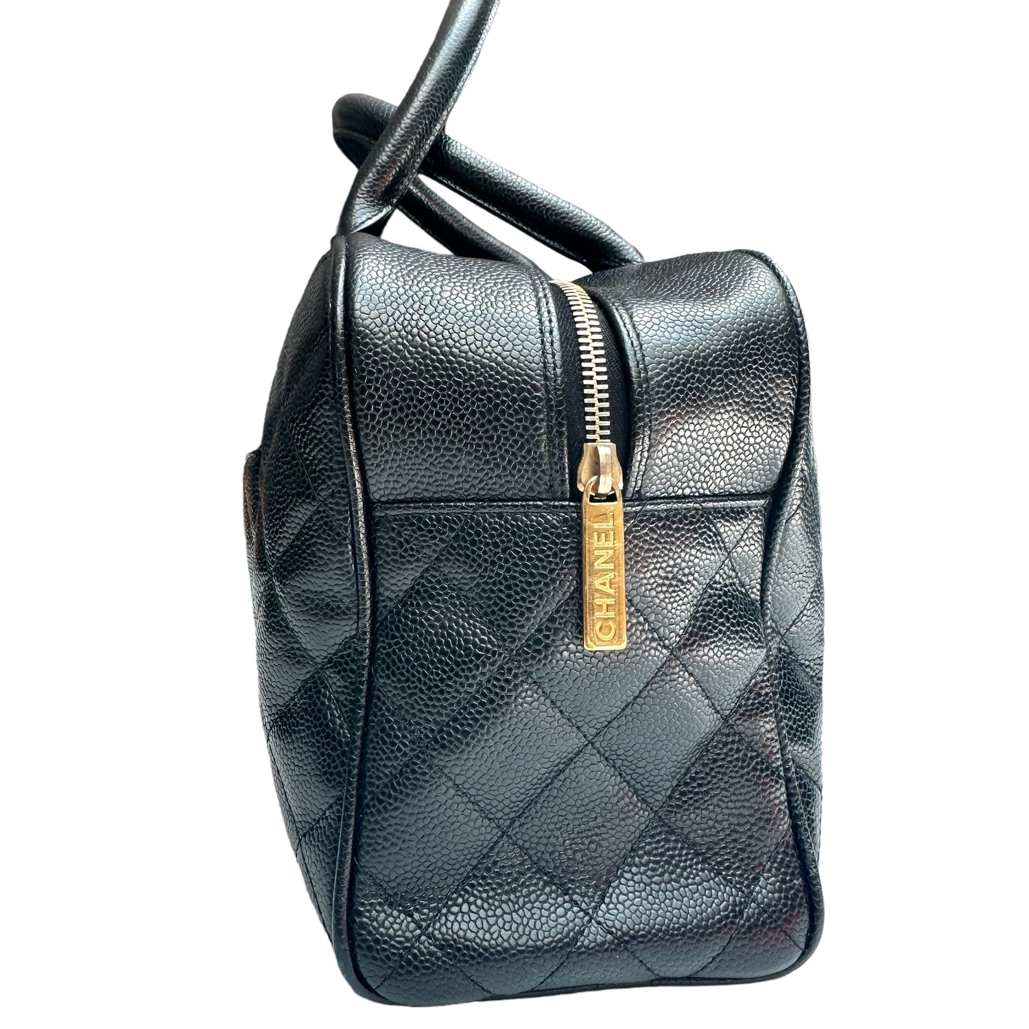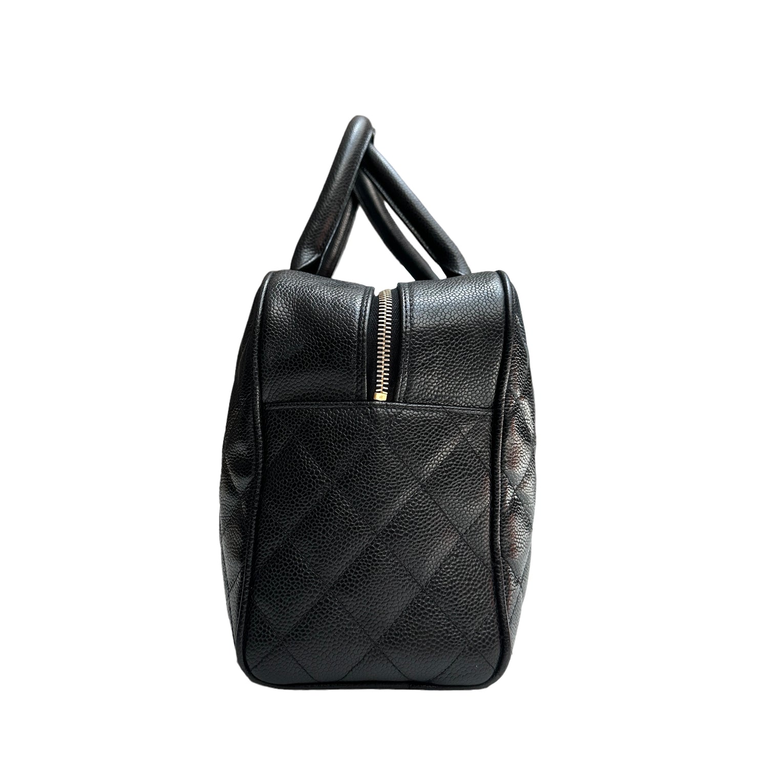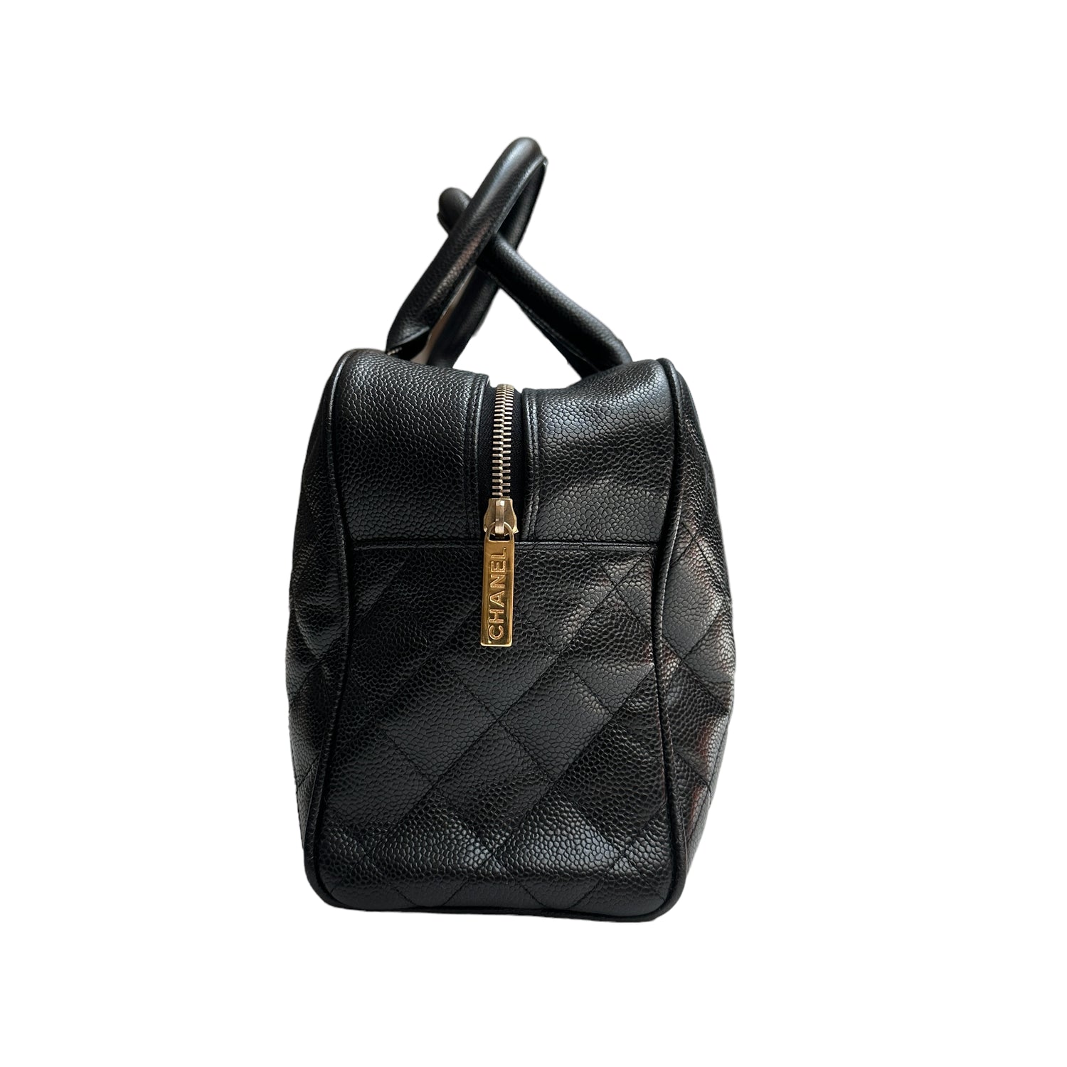 Chanel black caviar leather bowling bag. Double rolled handles at top. Zipper closure in gold-tone hardware with Chanel logo engraved. One exterior slit pocket at back. Protective feet at base.