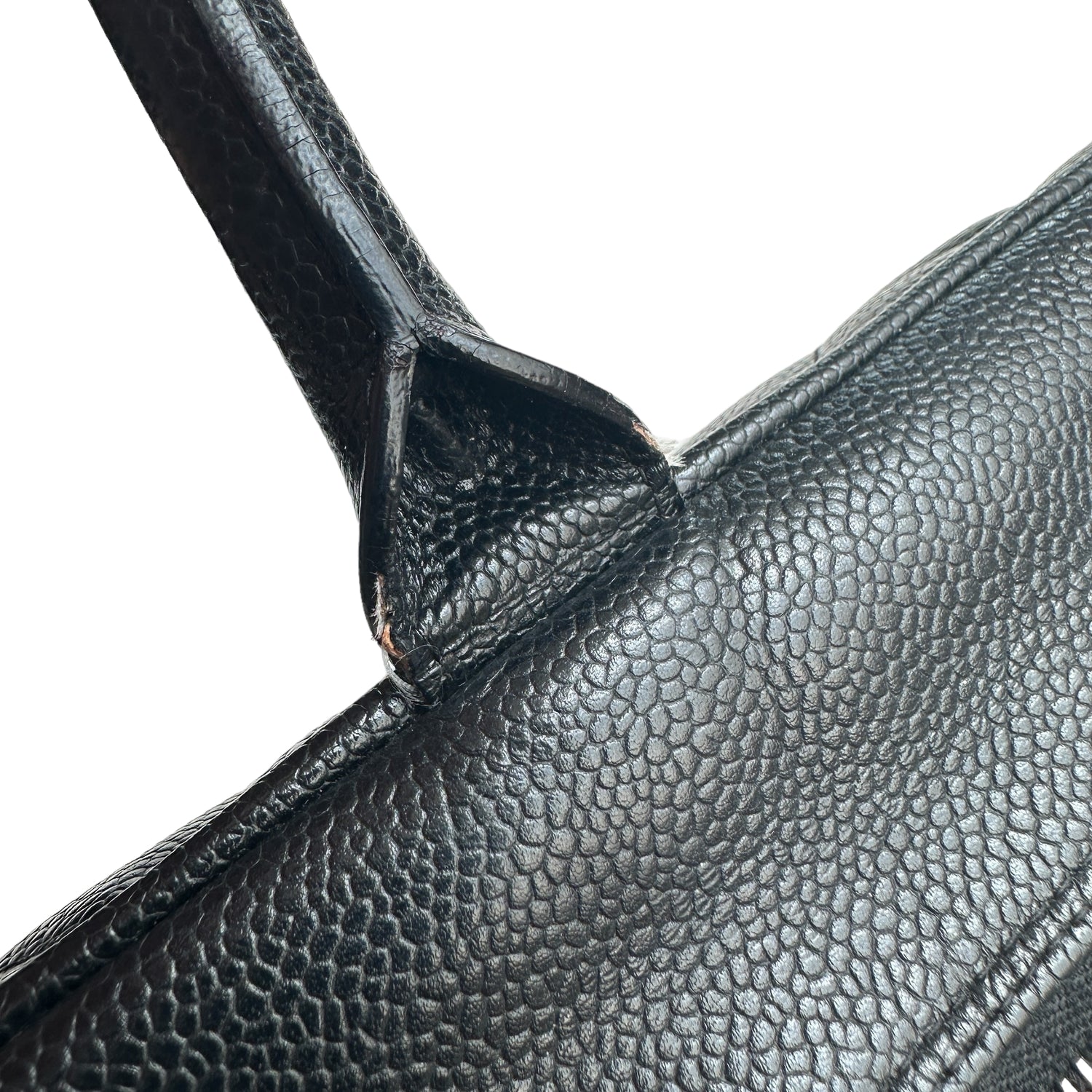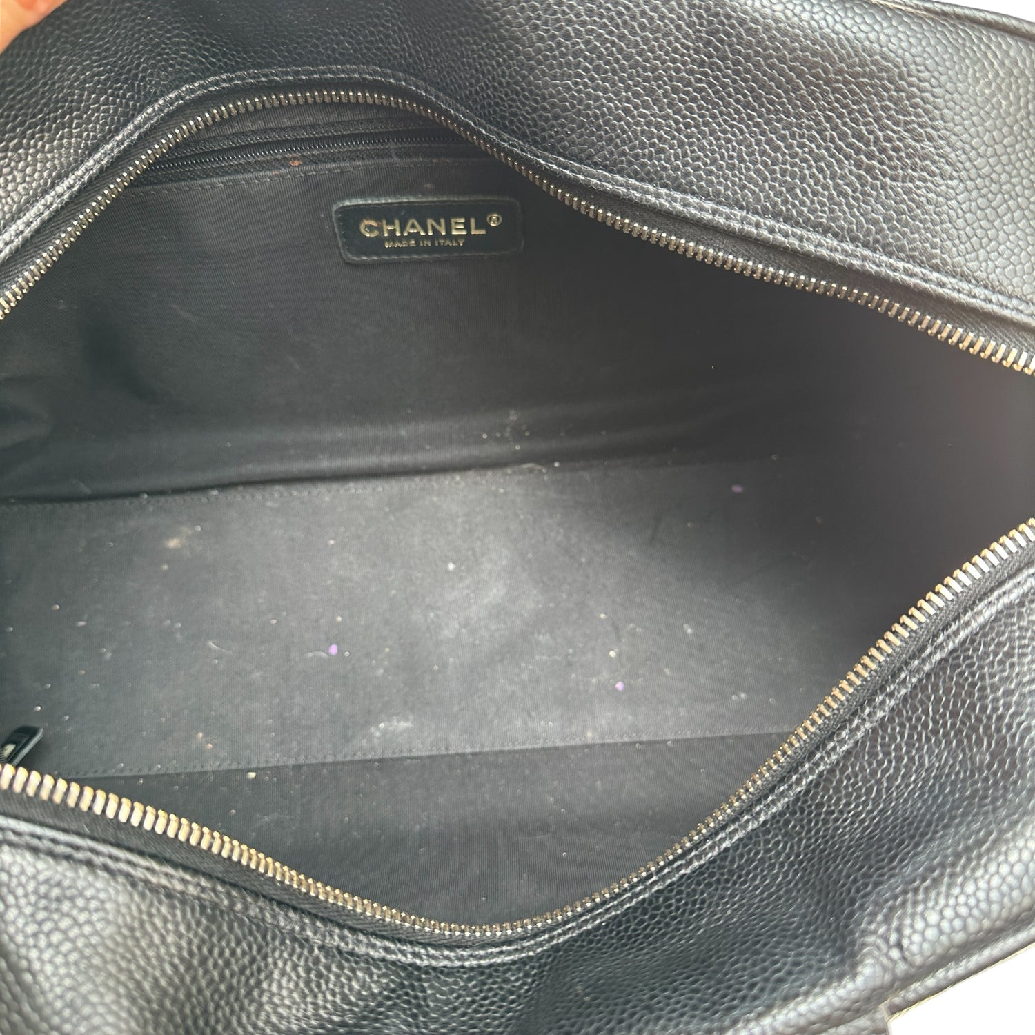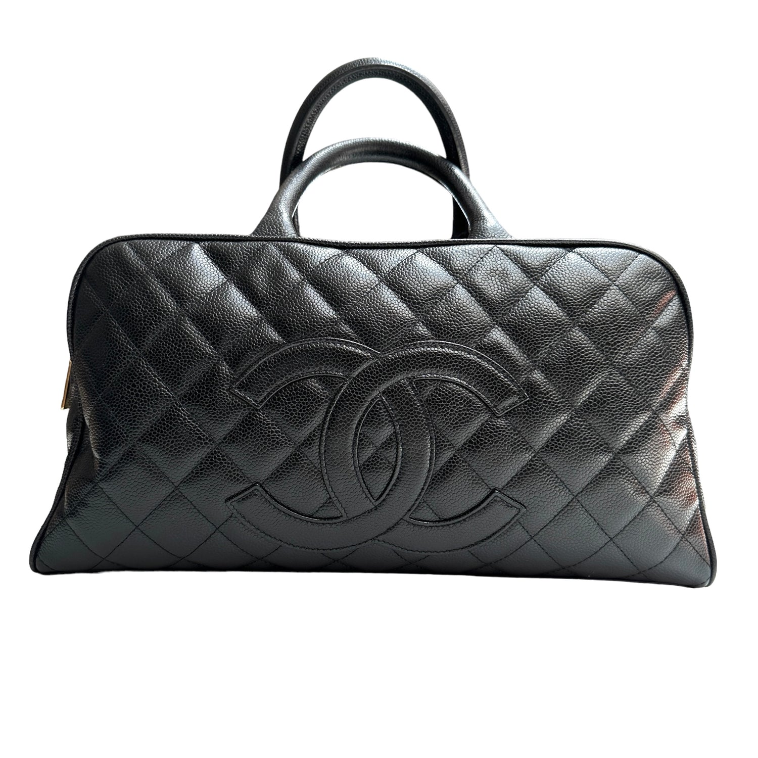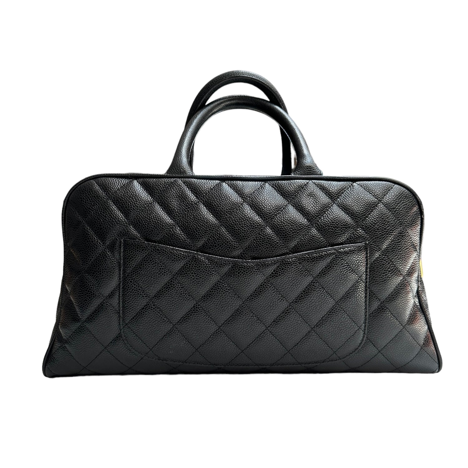 Chanel black caviar leather bowling bag. Double rolled handles at top. Zipper closure in gold-tone hardware with Chanel logo engraved. One exterior slit pocket at back. Protective feet at base.