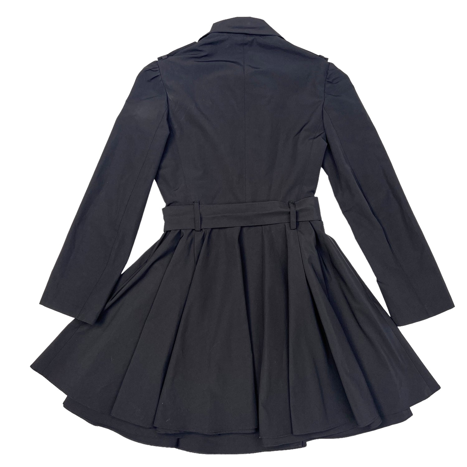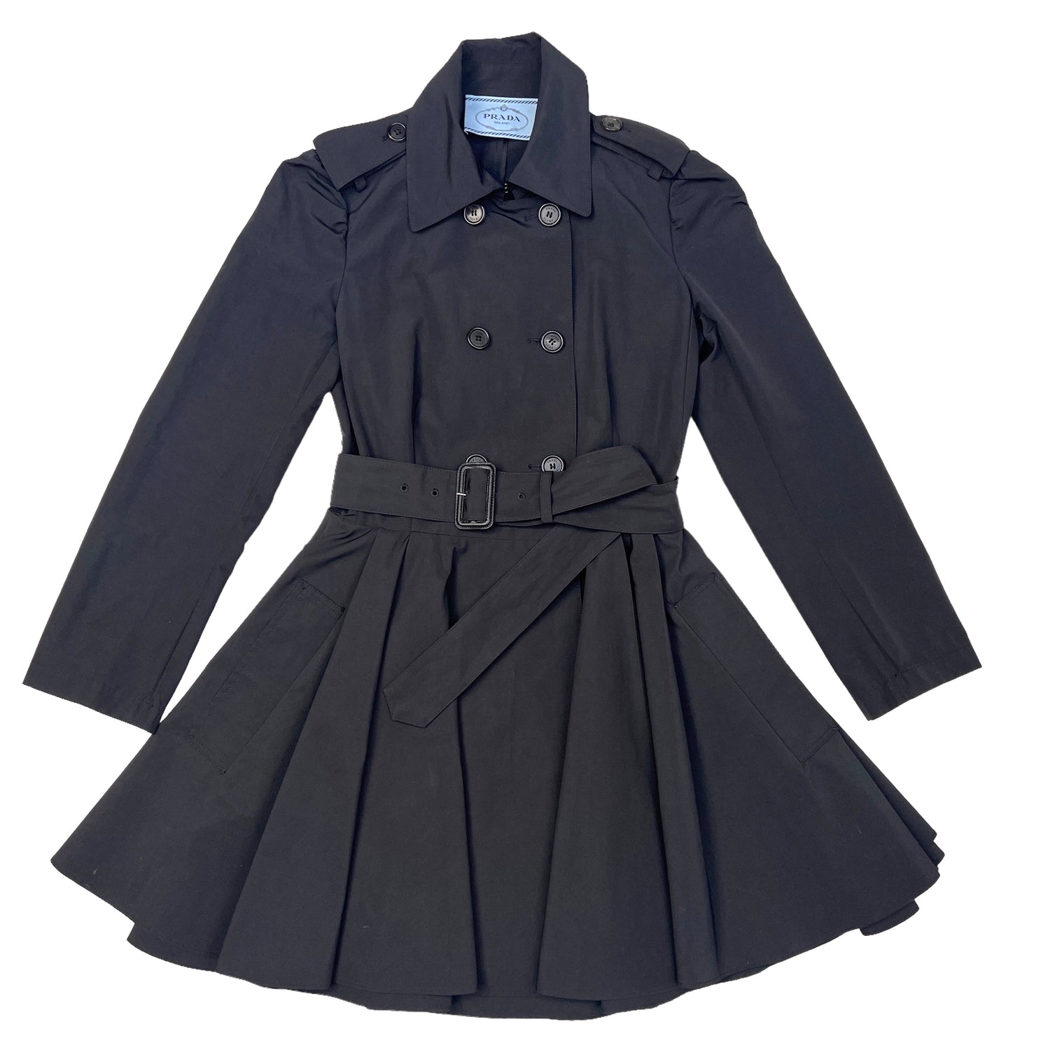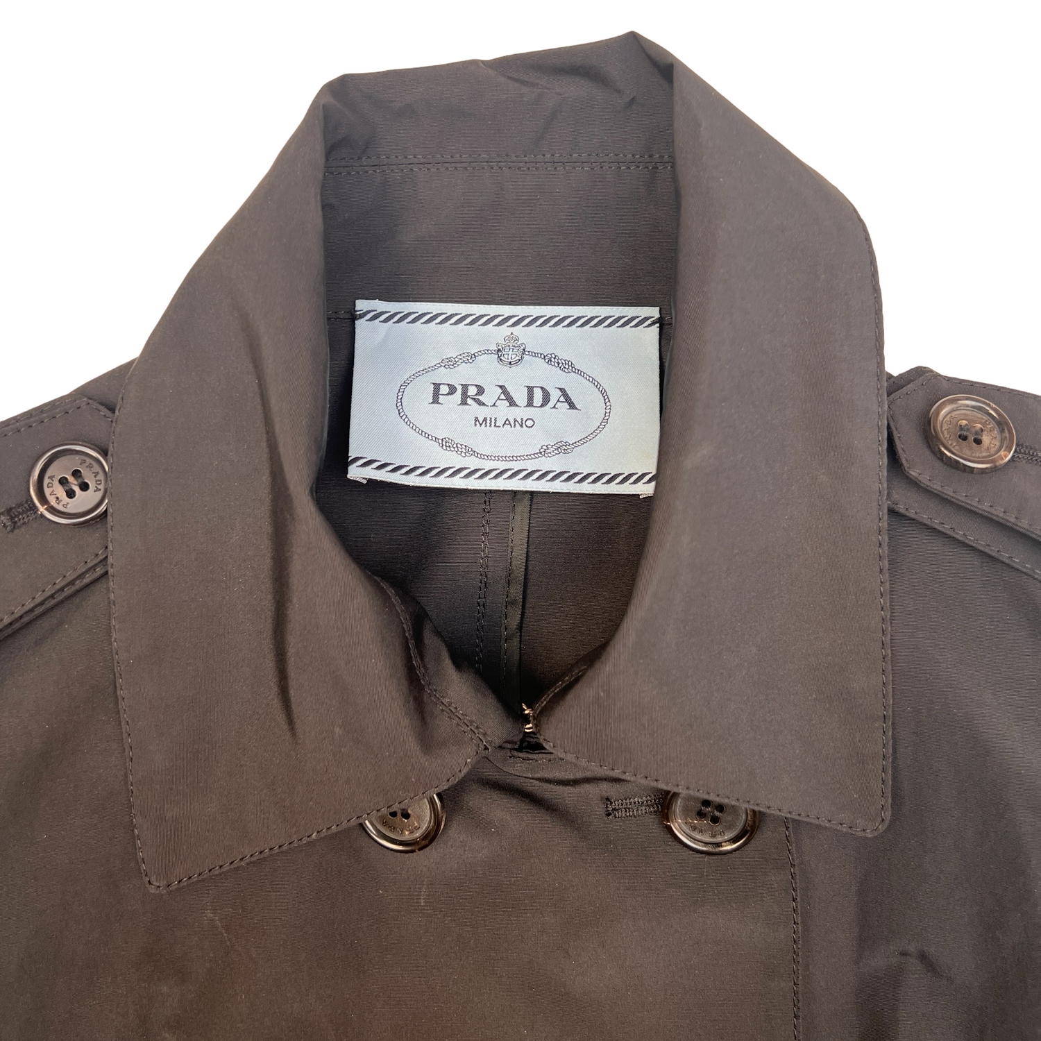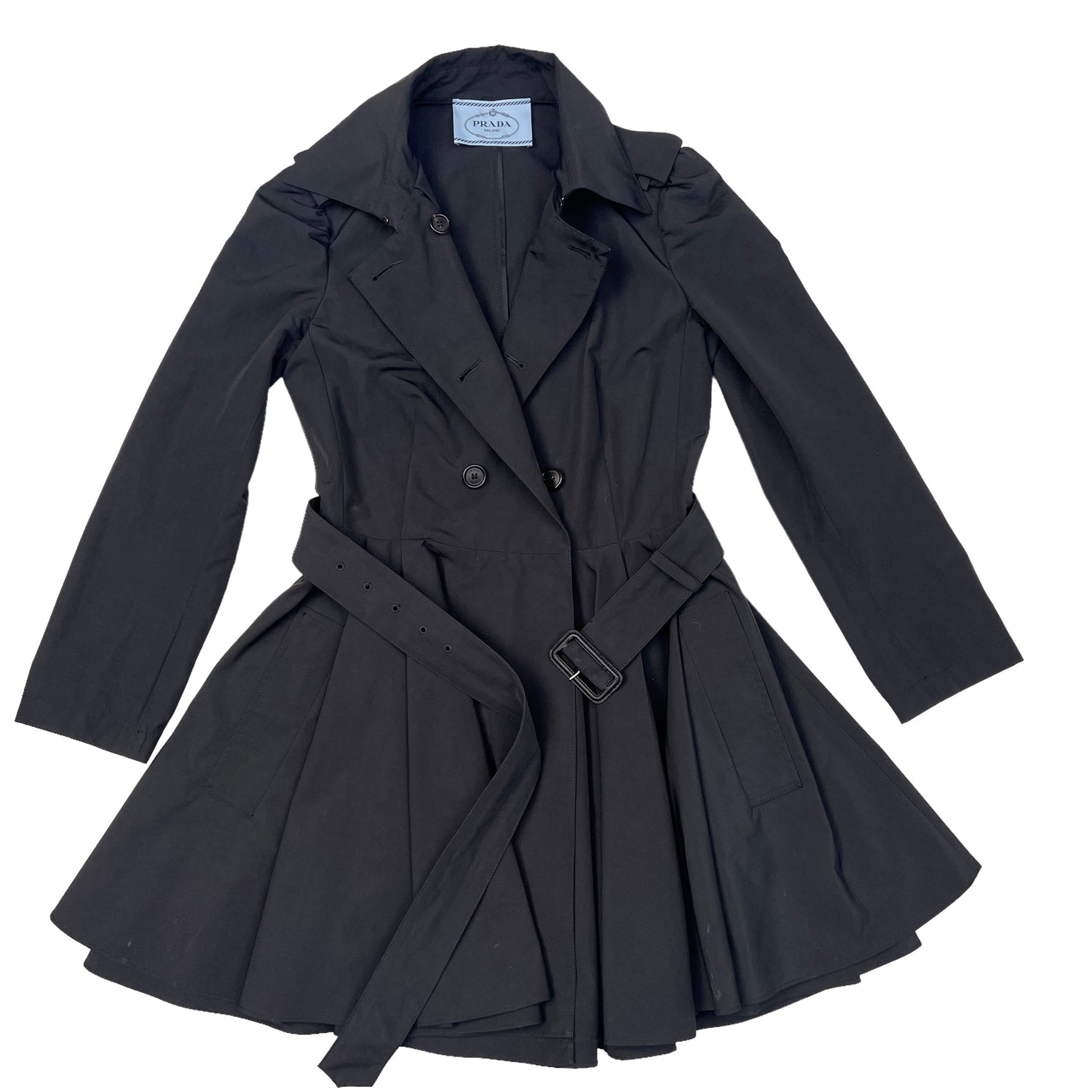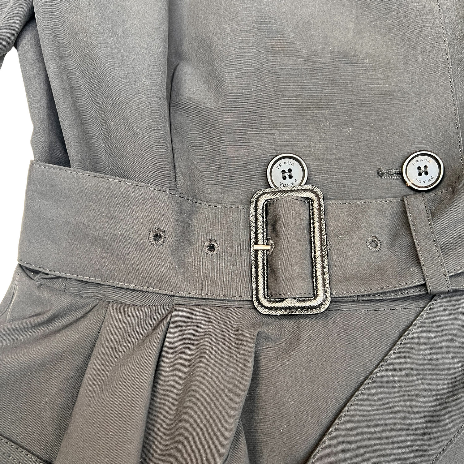 Prada black trench coat. Removable belt with saffiano leather clasp. Button closure at front. Pointed collar. Designer size 38.