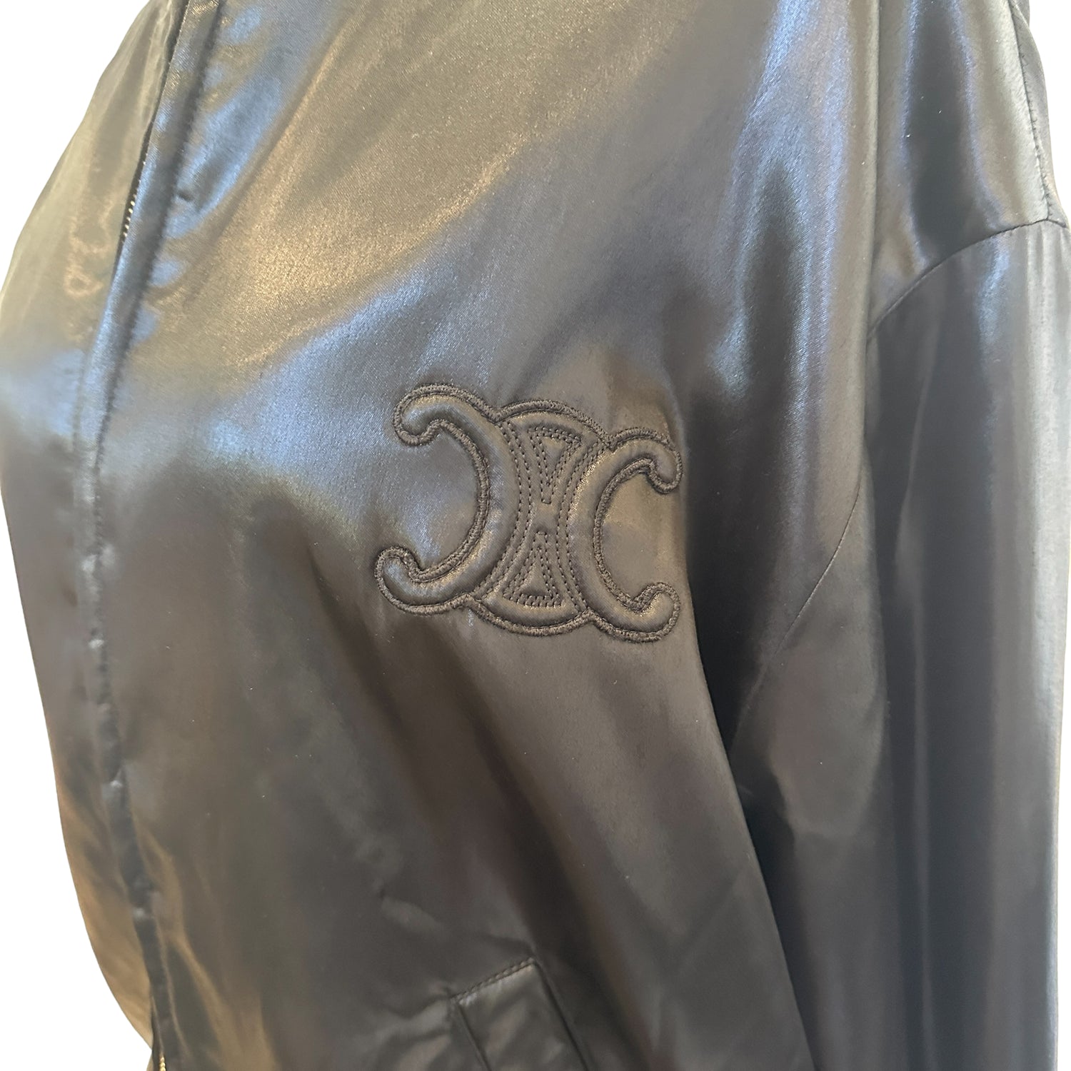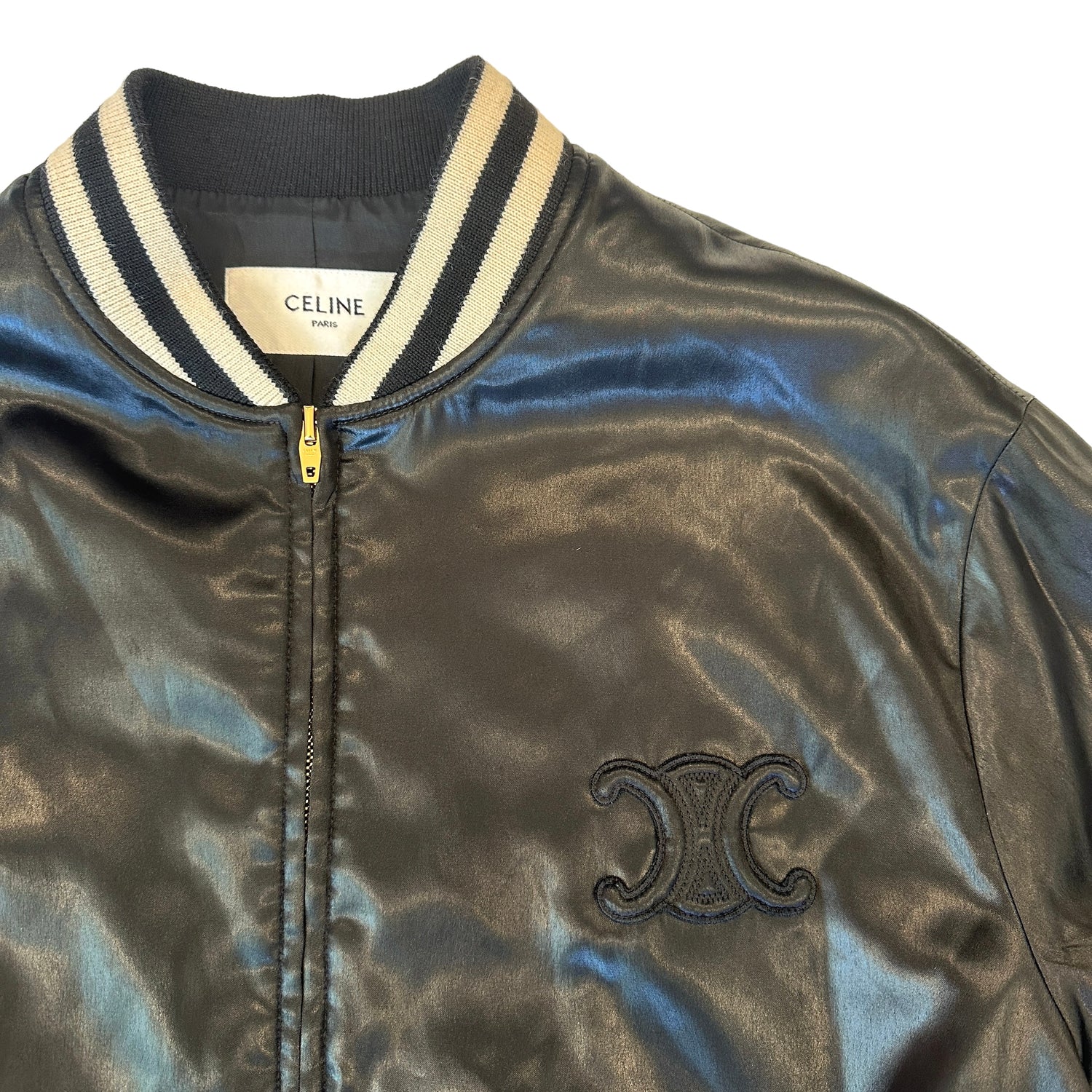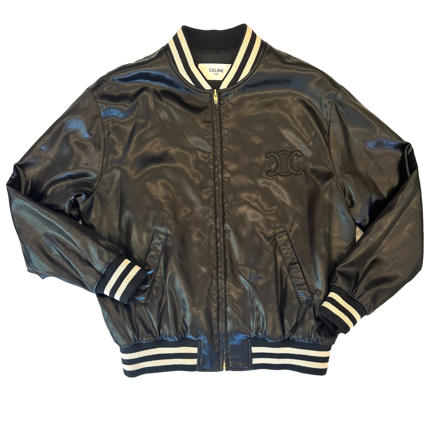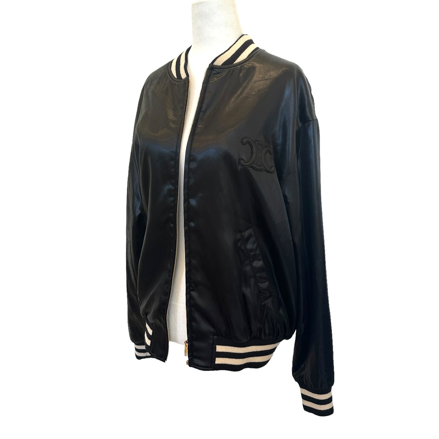 Celine Triomphe bomber jacket by Hedi Slimane. Black body and black and white stripes at collar, waist and wrists. Stand alone collar. Zipper closure at front. This is such a fantastic mid-season piece. Triomphe patch logo at front. Designer size 40.