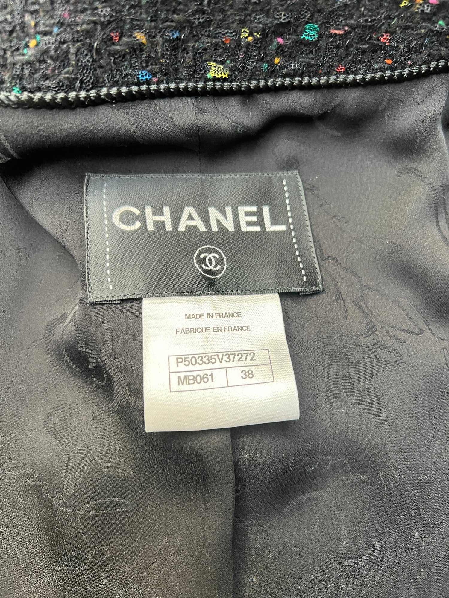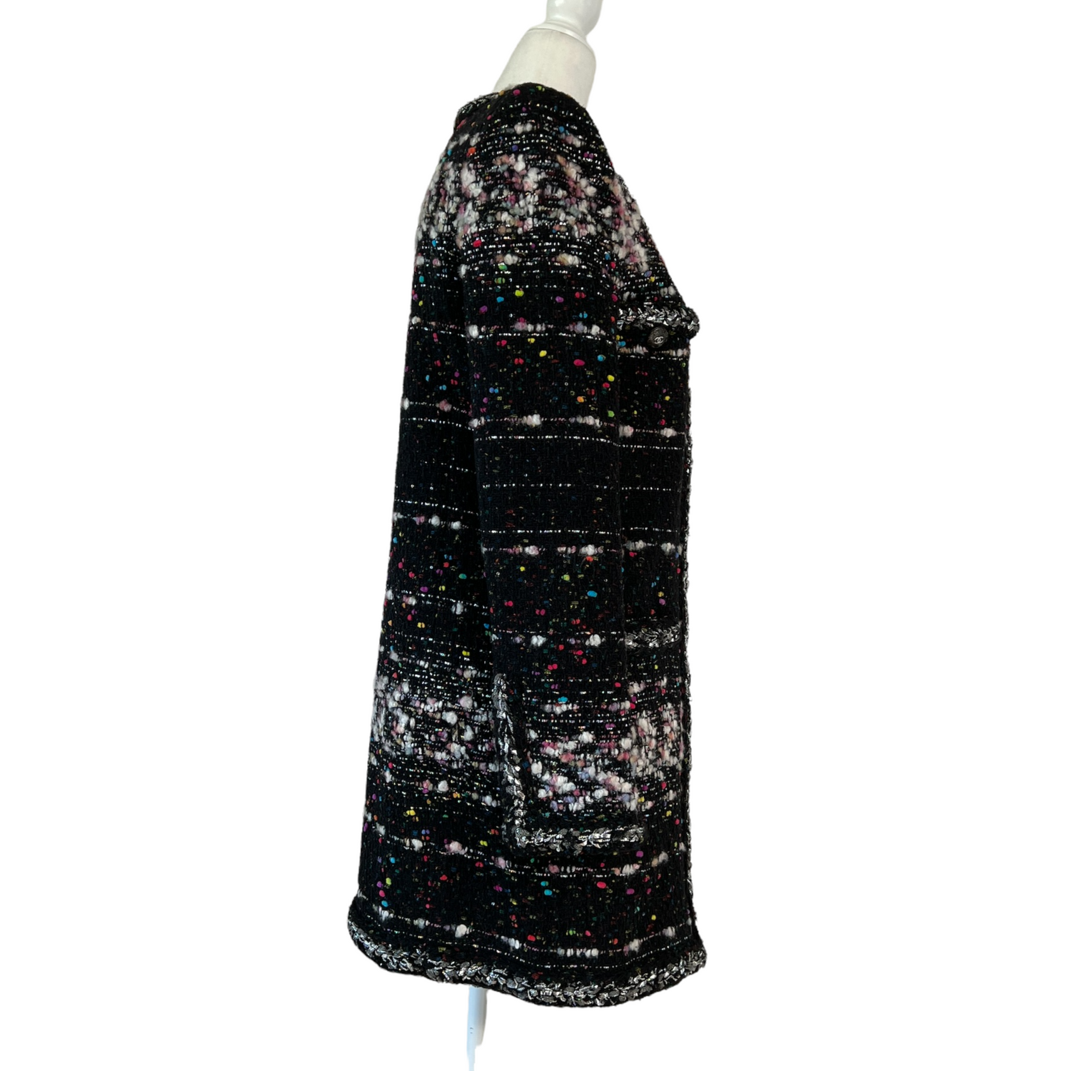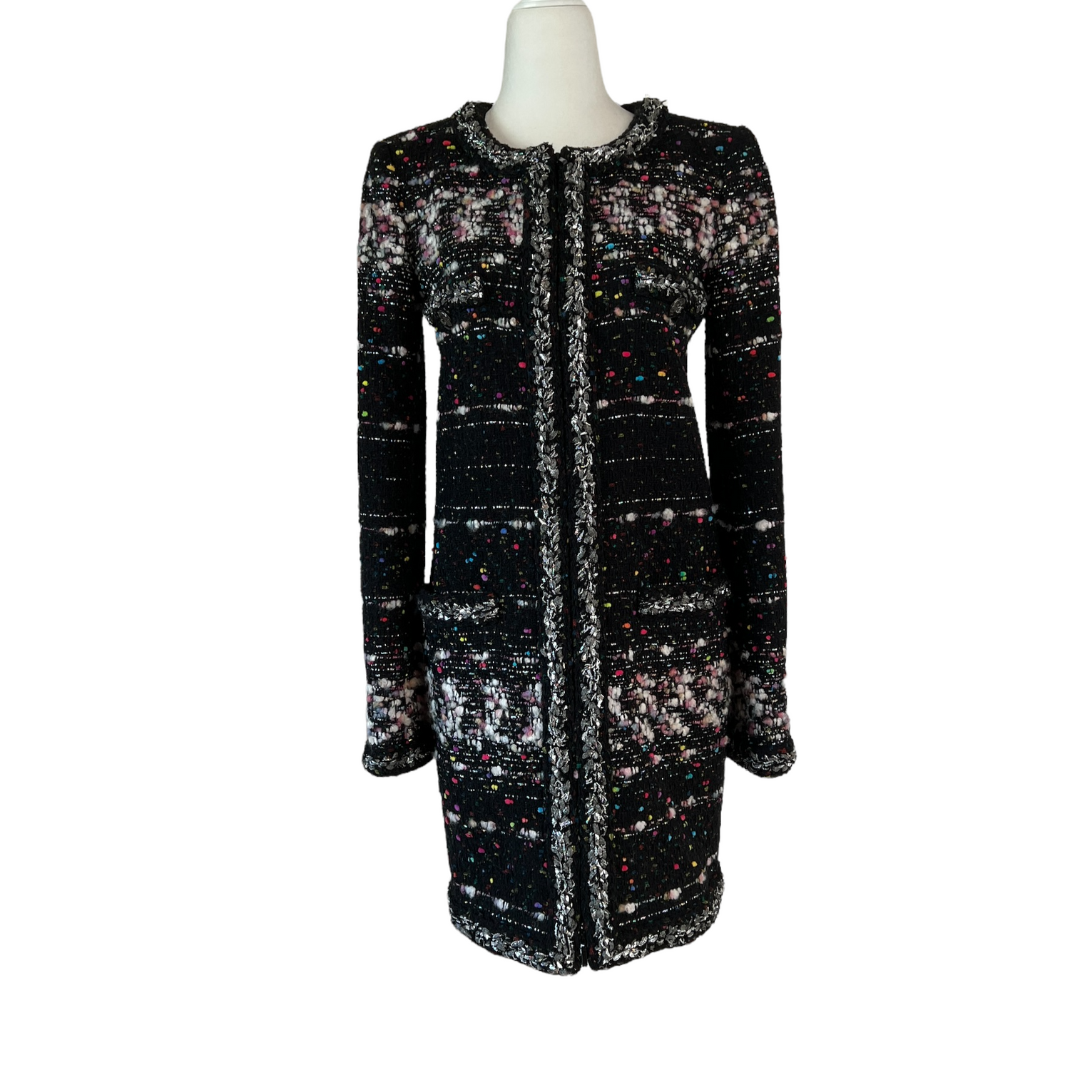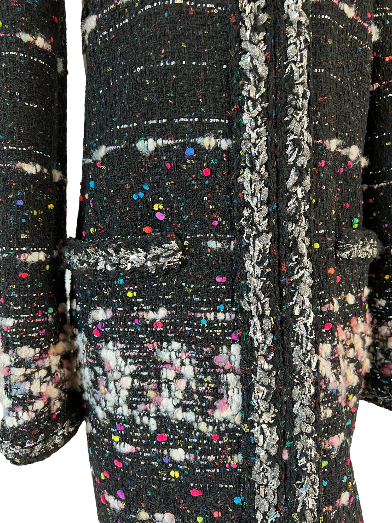 Classic yet edgy coat from Chanel. Black tweed with pops of color throughout for a twist. Metallic silver at edges. Black silk lining with CC prints. Round neck. Two pockets at side. One front pocket on chest. CC buttons in silver-tone metal. Zipper closure at front. Size 38