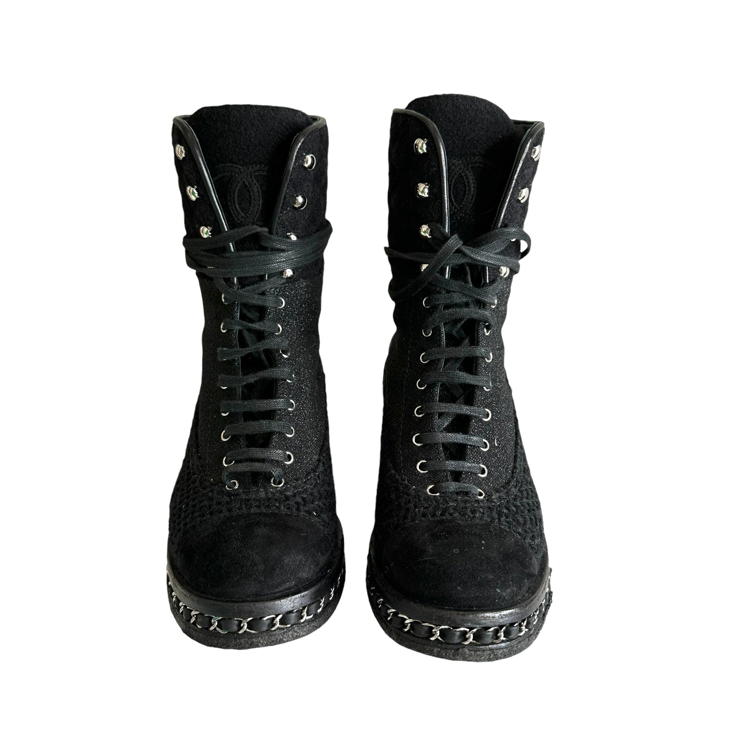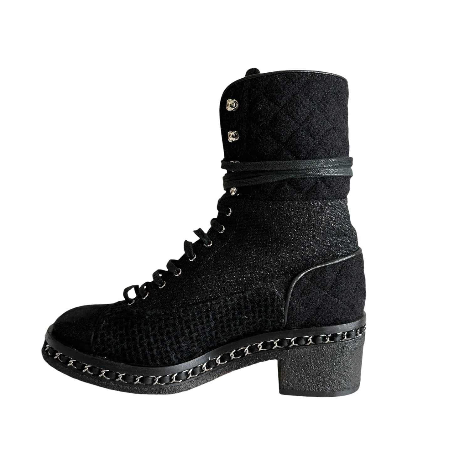 Chanel black tweed combat boots. CC logo at front. Silver-tone chain and hardware. Designer size 39.
