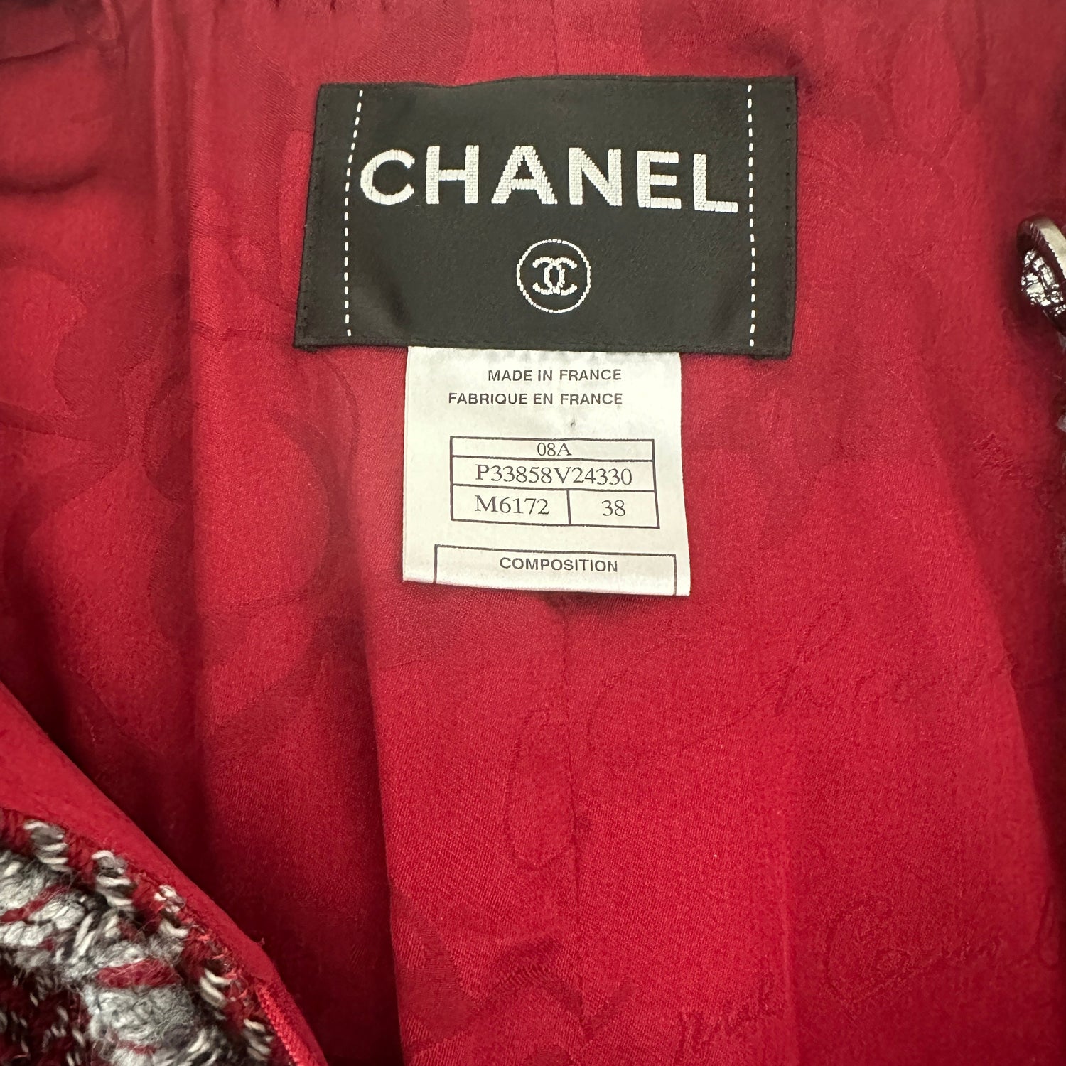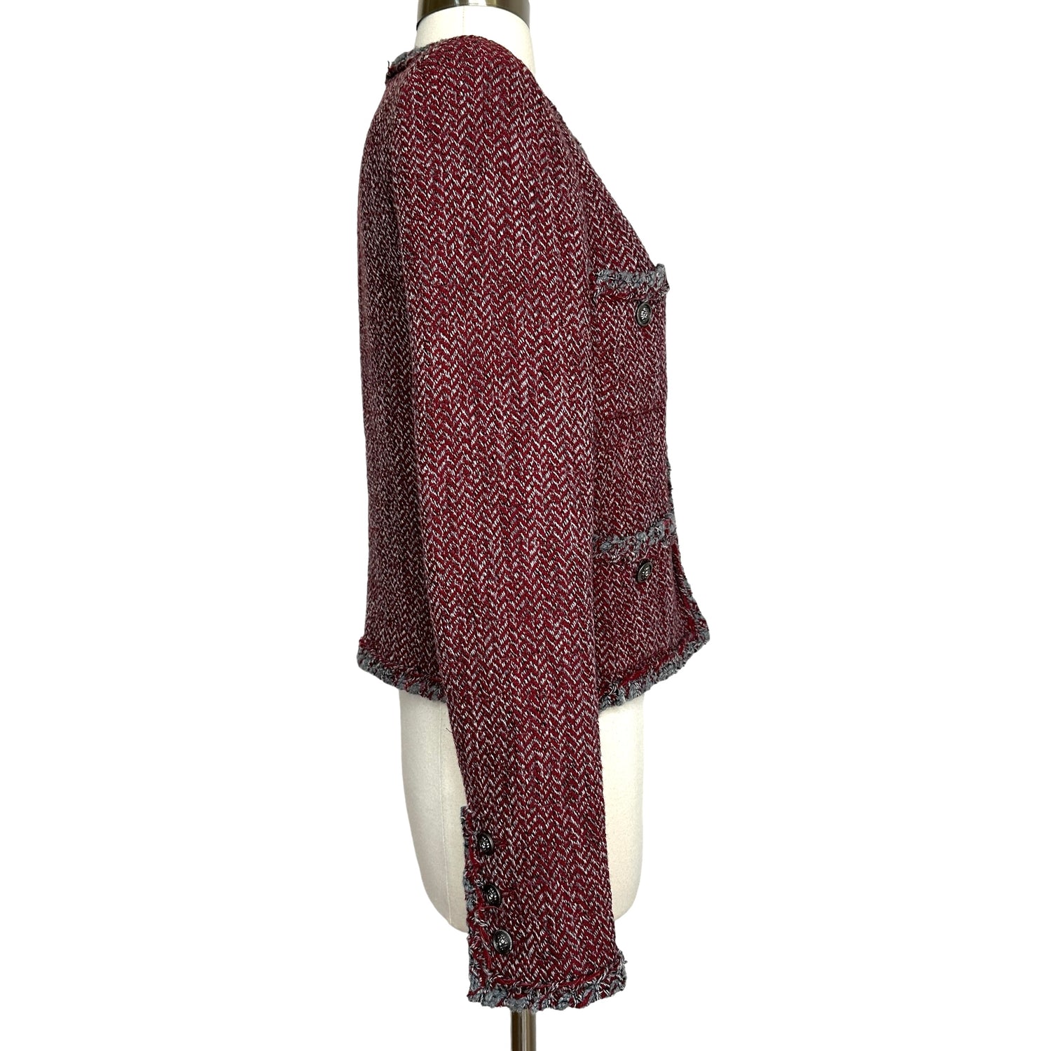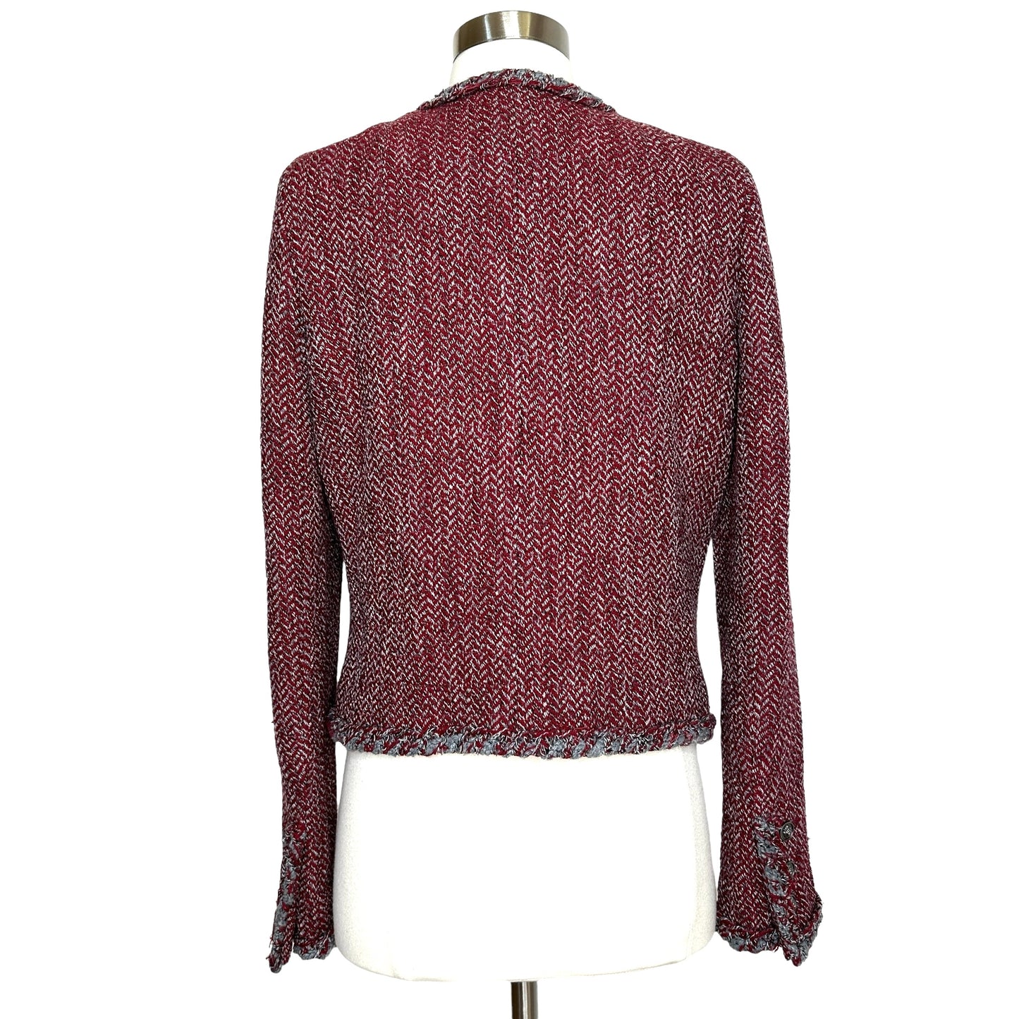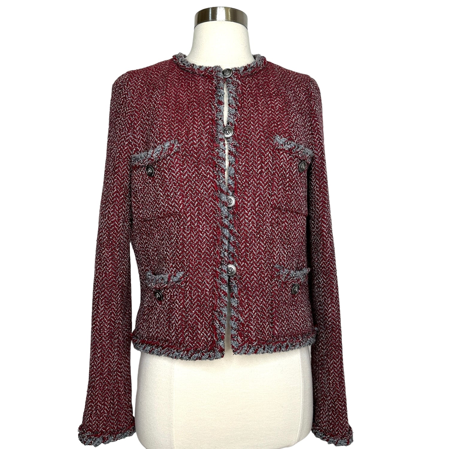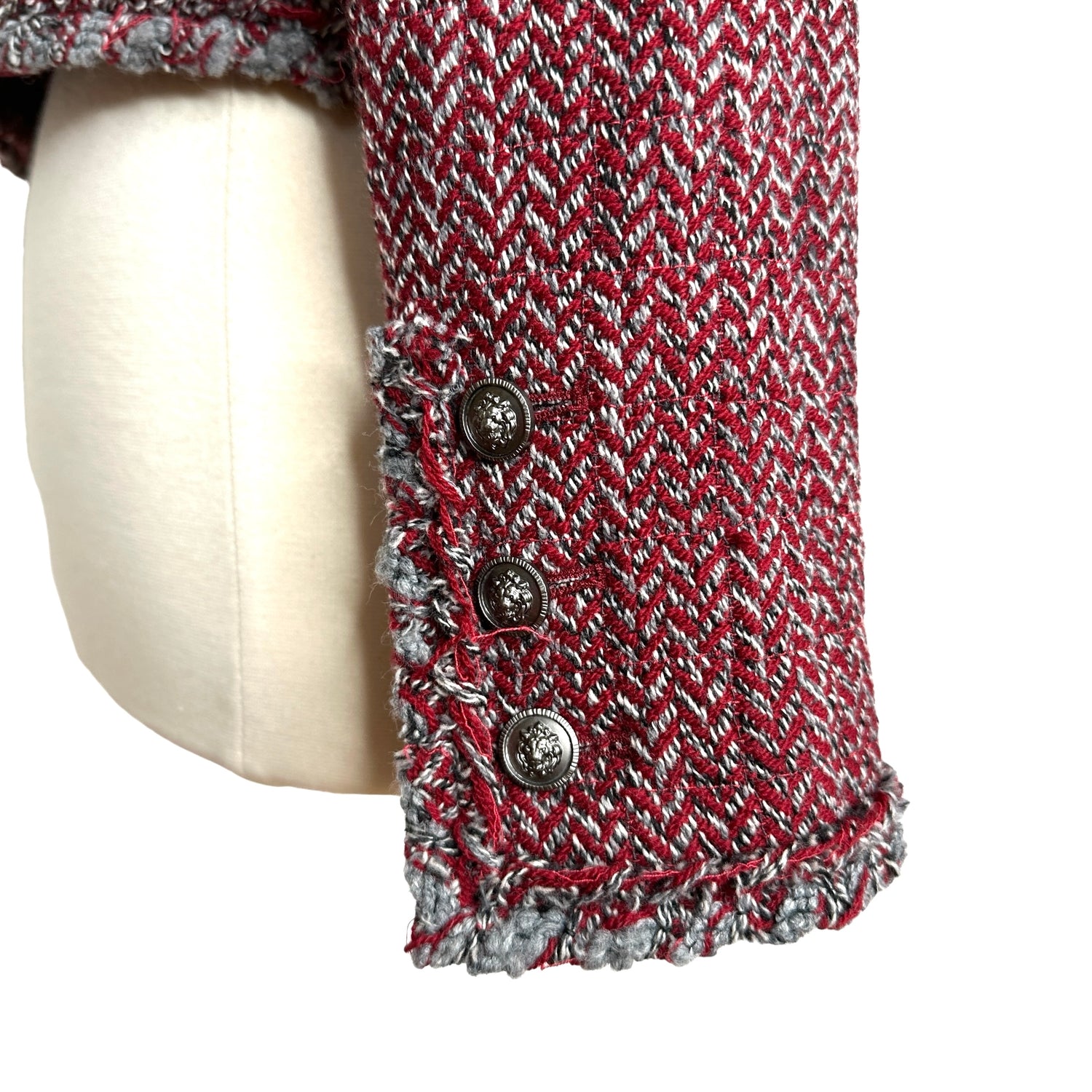 Chanel red and grey tweed jacket. Fall 2008 collection. Button closure at front. Collarless. Gunmetal lion heads buttons. Silk lining. Designer size 38.