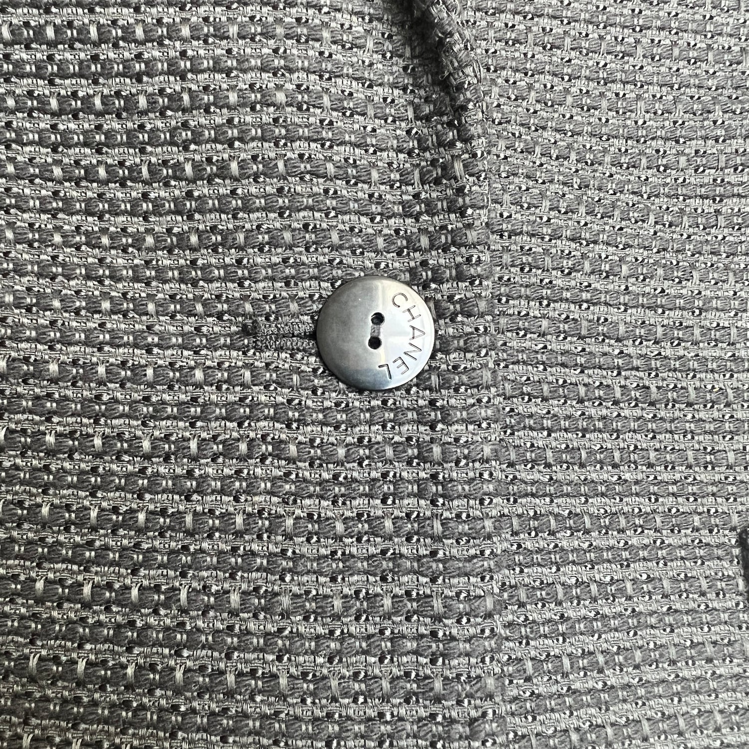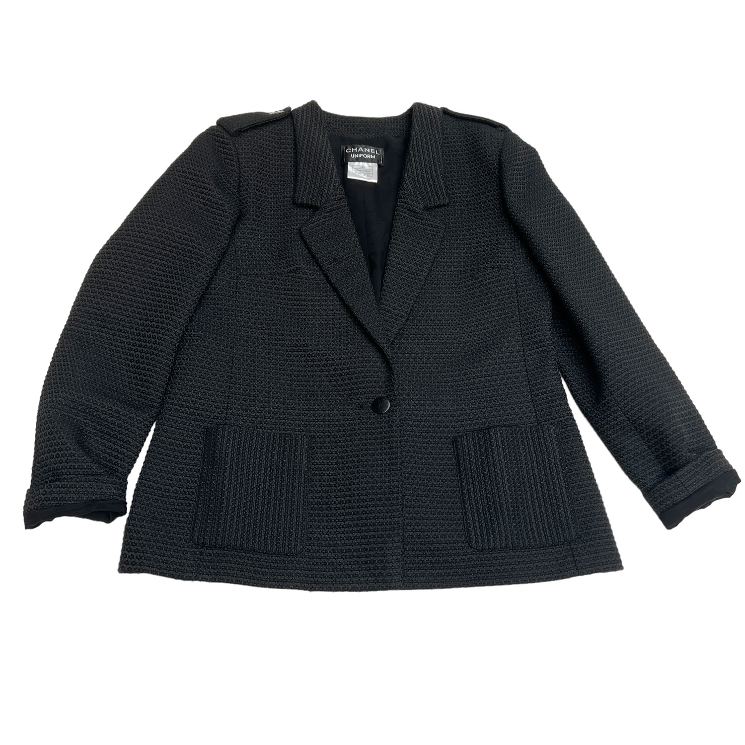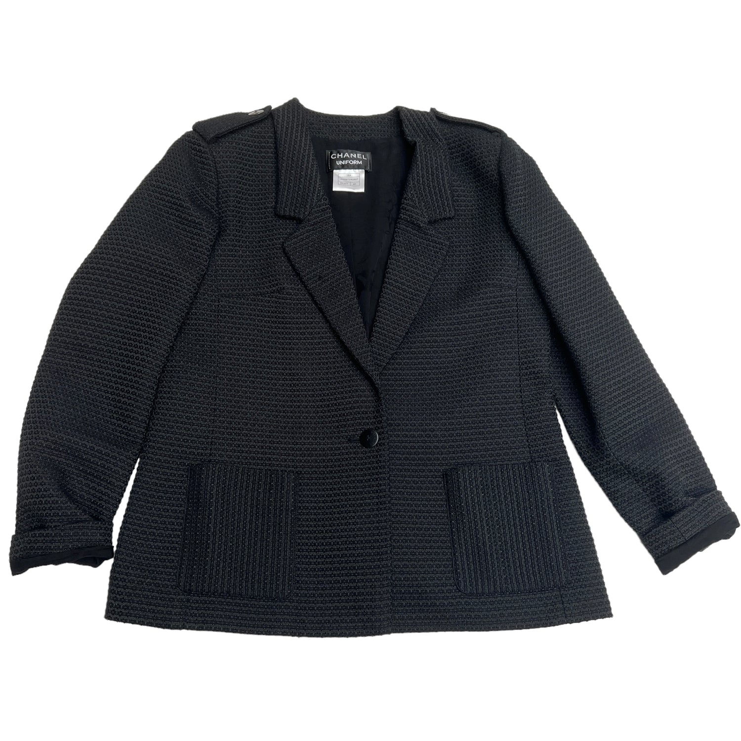 Chanel Uniform black blazer. Tweed pattern. Two pockets. One button at front. Pointed collar. Chanel brand spelled out at button. Designer size 40.