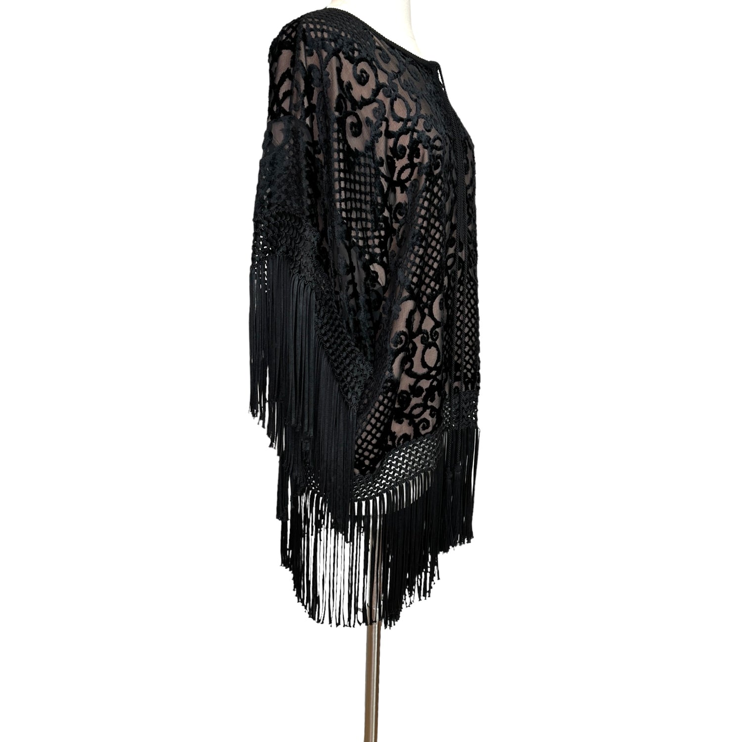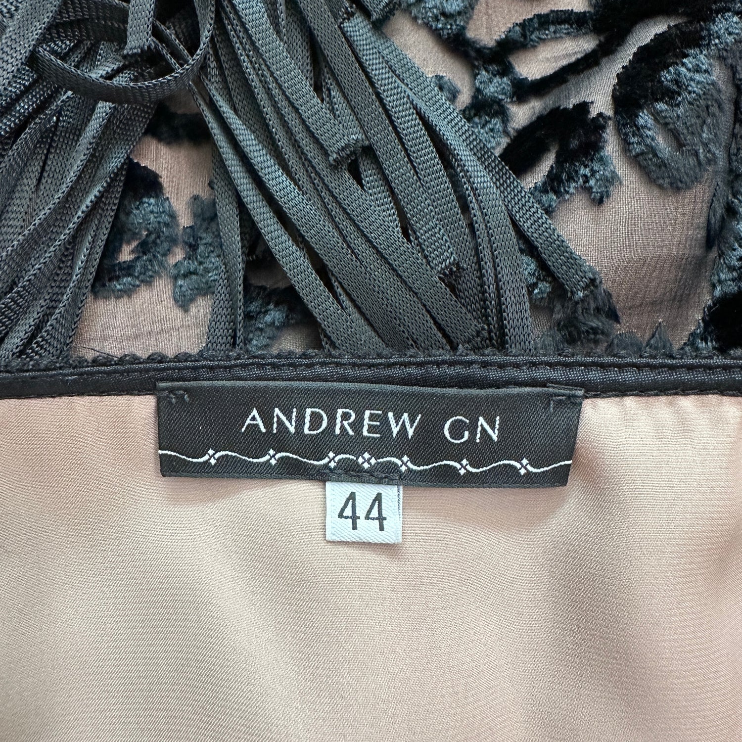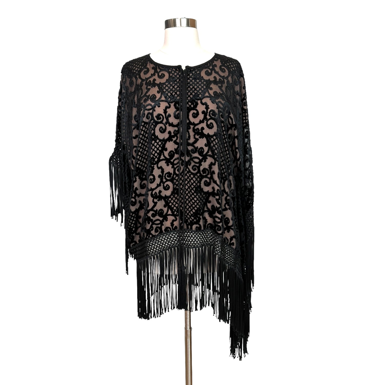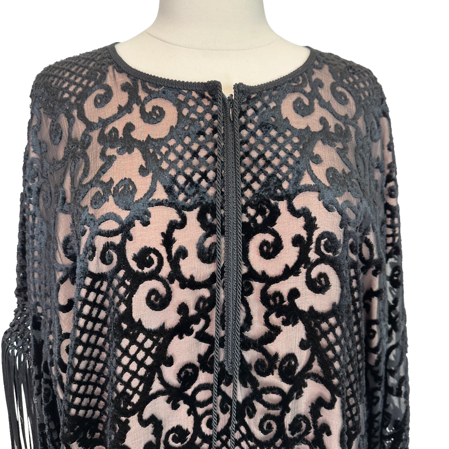 Andrew GN asymmetrical poncho. Tassels at bottom. Zipper closure at front. Black velvet on nude fabricl. Pom-Pom at front. Concealed sleeves. Designer size 44.