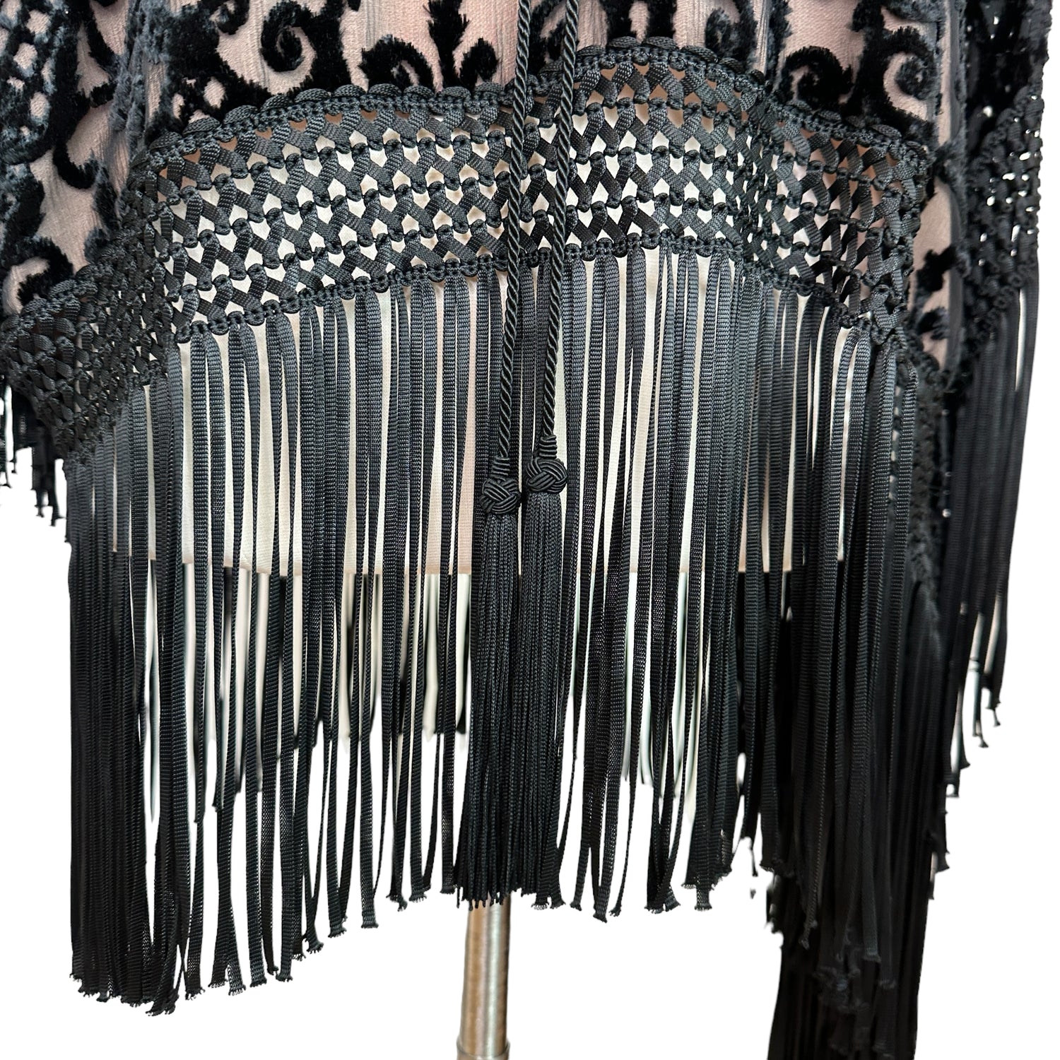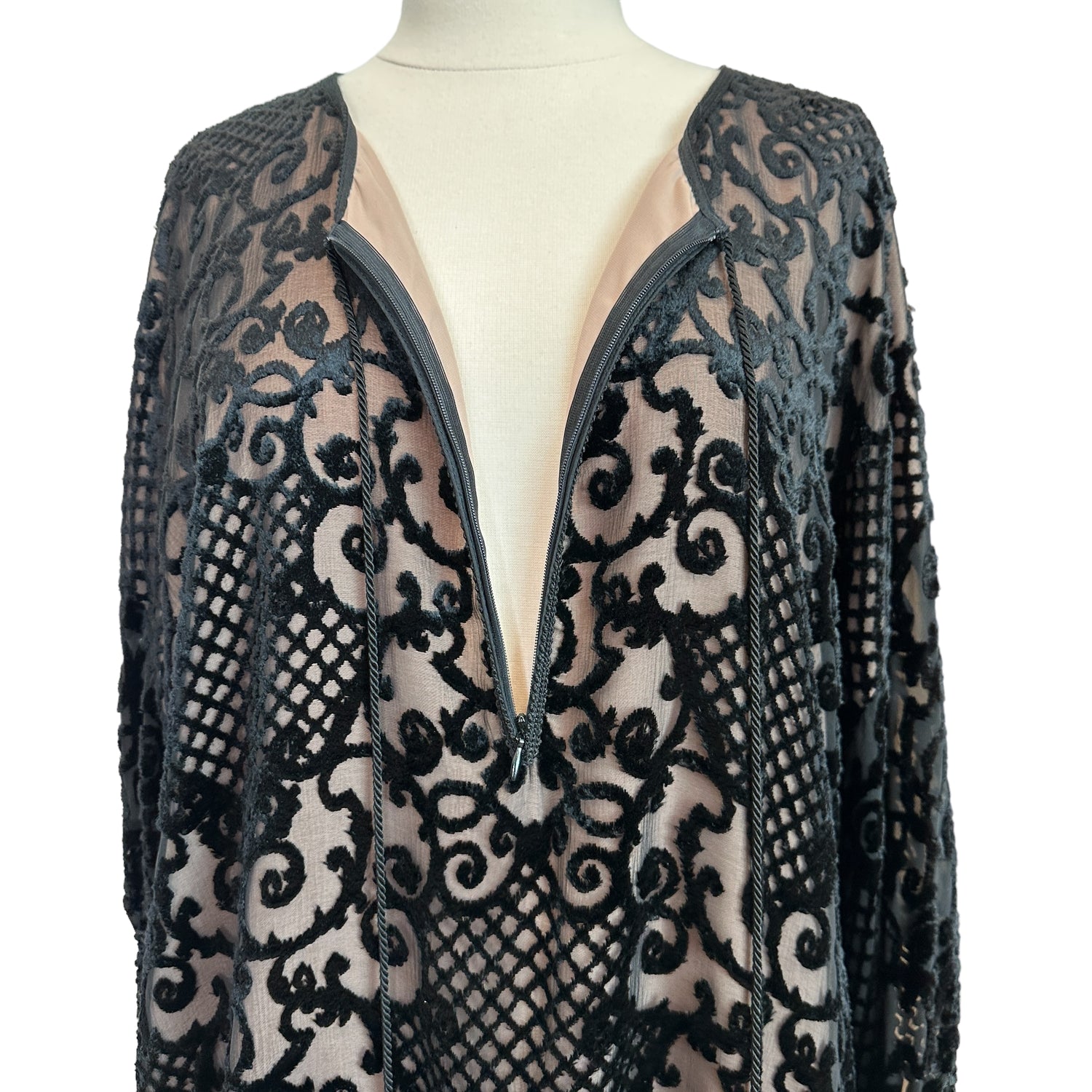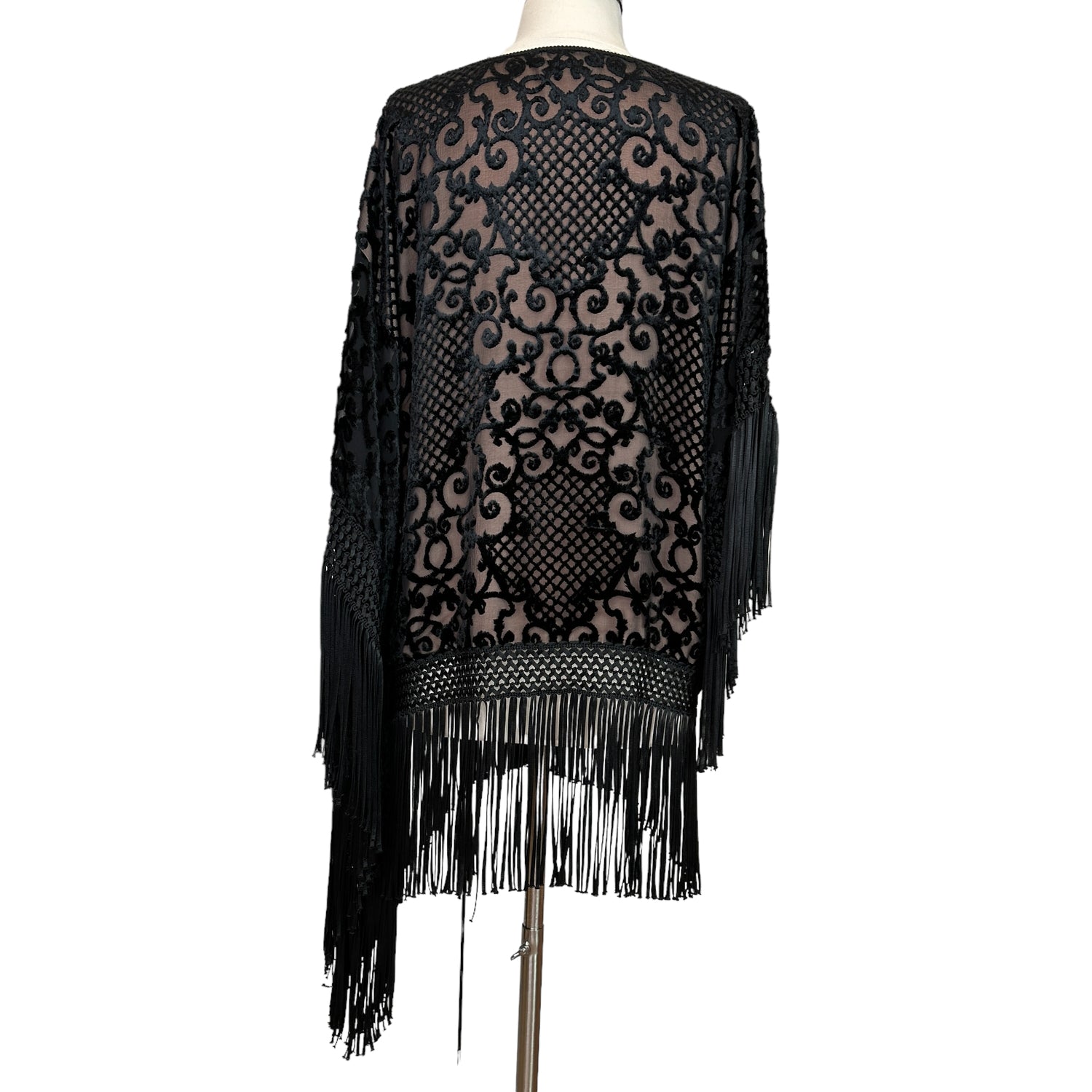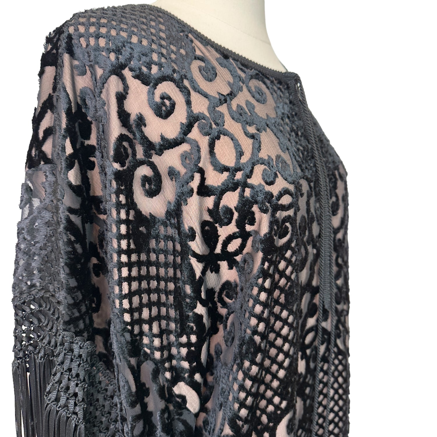 Andrew GN asymmetrical poncho. Tassels at bottom. Zipper closure at front. Black velvet on nude fabricl. Pom-Pom at front. Concealed sleeves. Designer size 44.