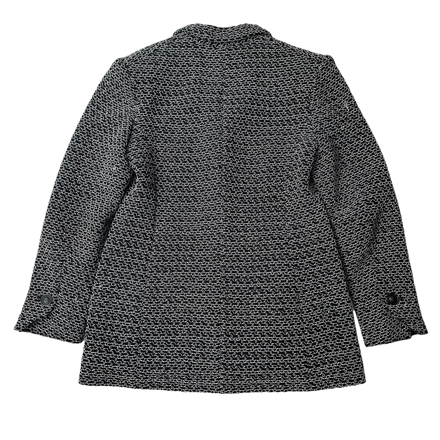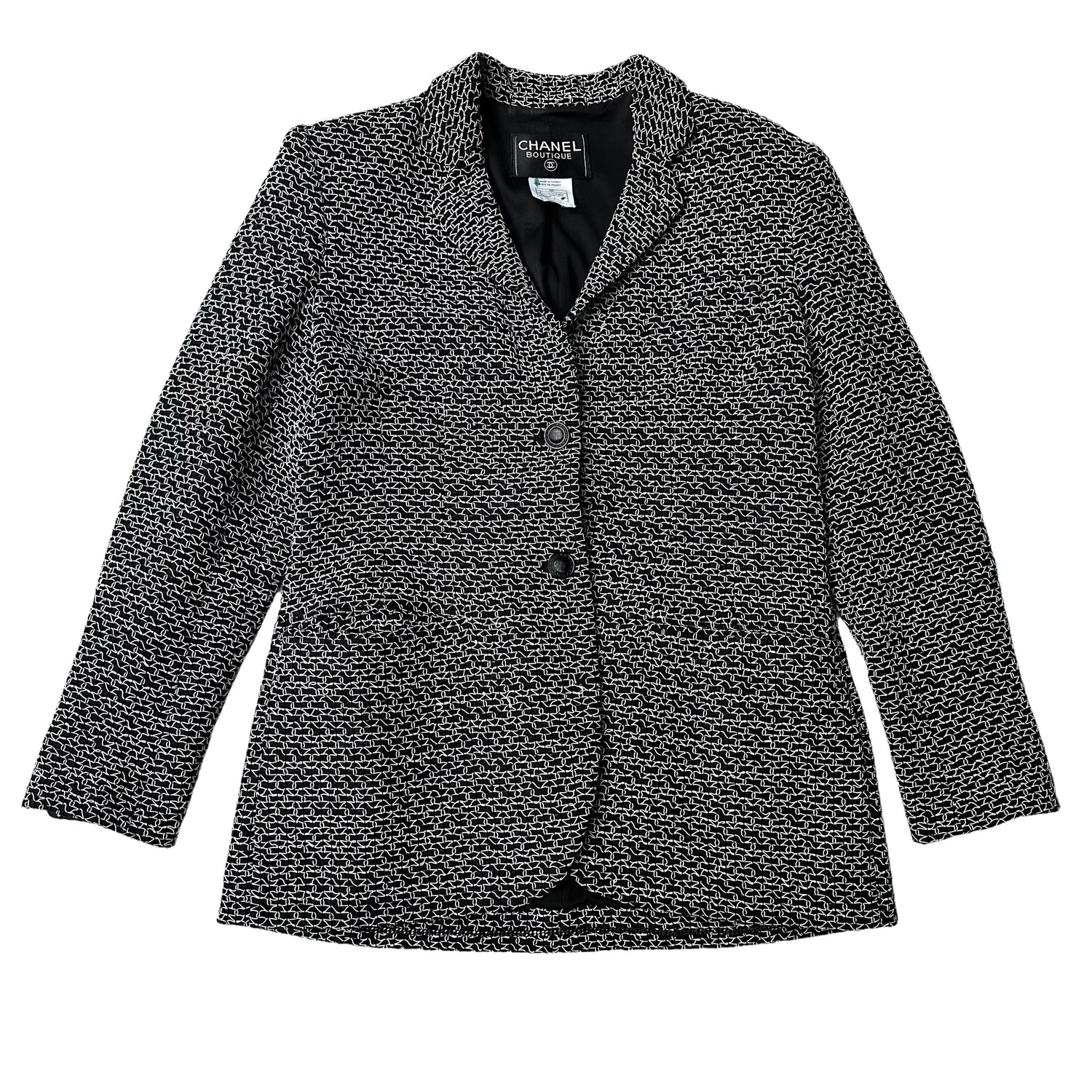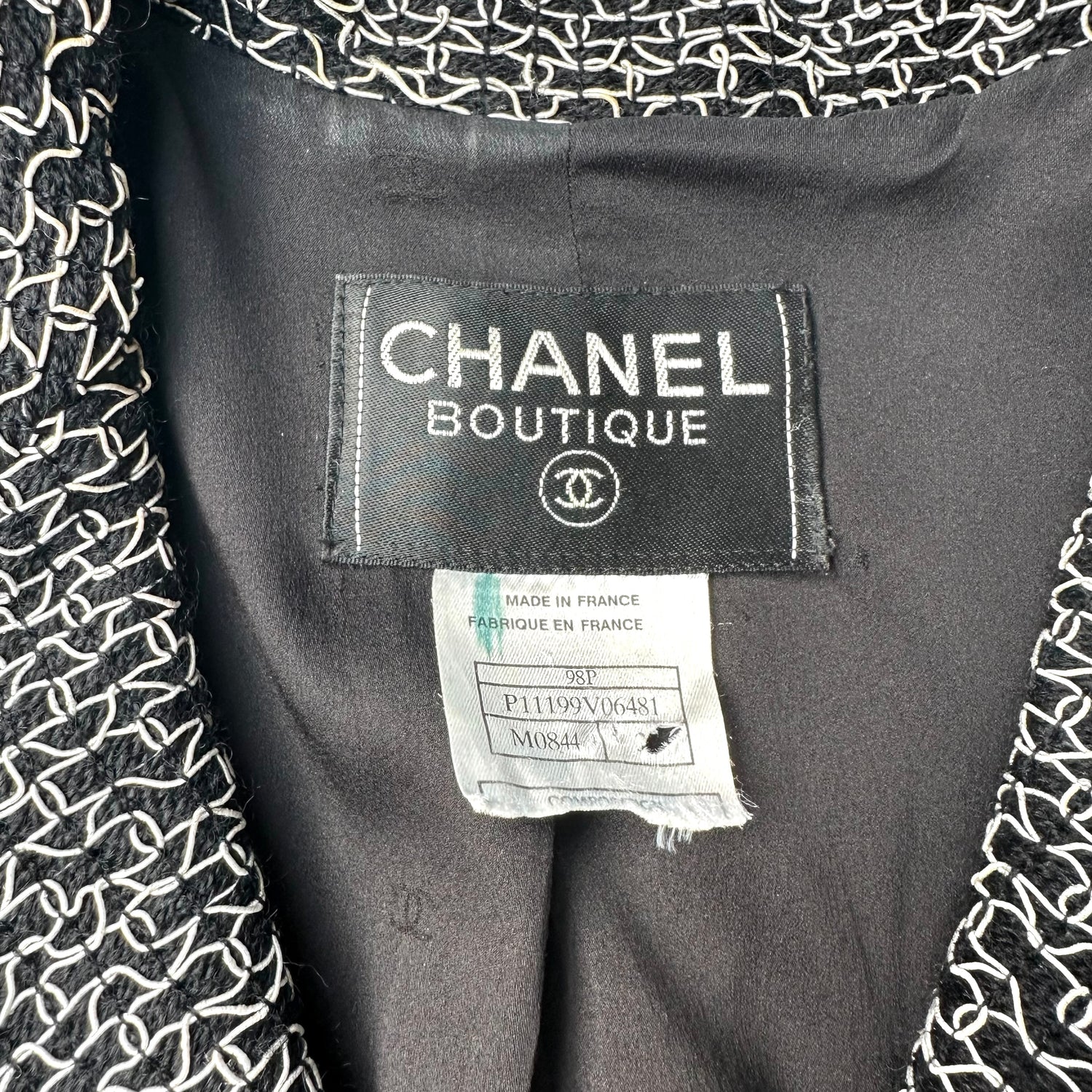 Chanel black and white blazer. Vintage from the 1998 Spring Collection by Karl Lagerfeld. Intricate weaved stitching throughout giving it a unique texture. Button closure at front. Pointed collar. One button at sleeves. Designer size seems to be 38.