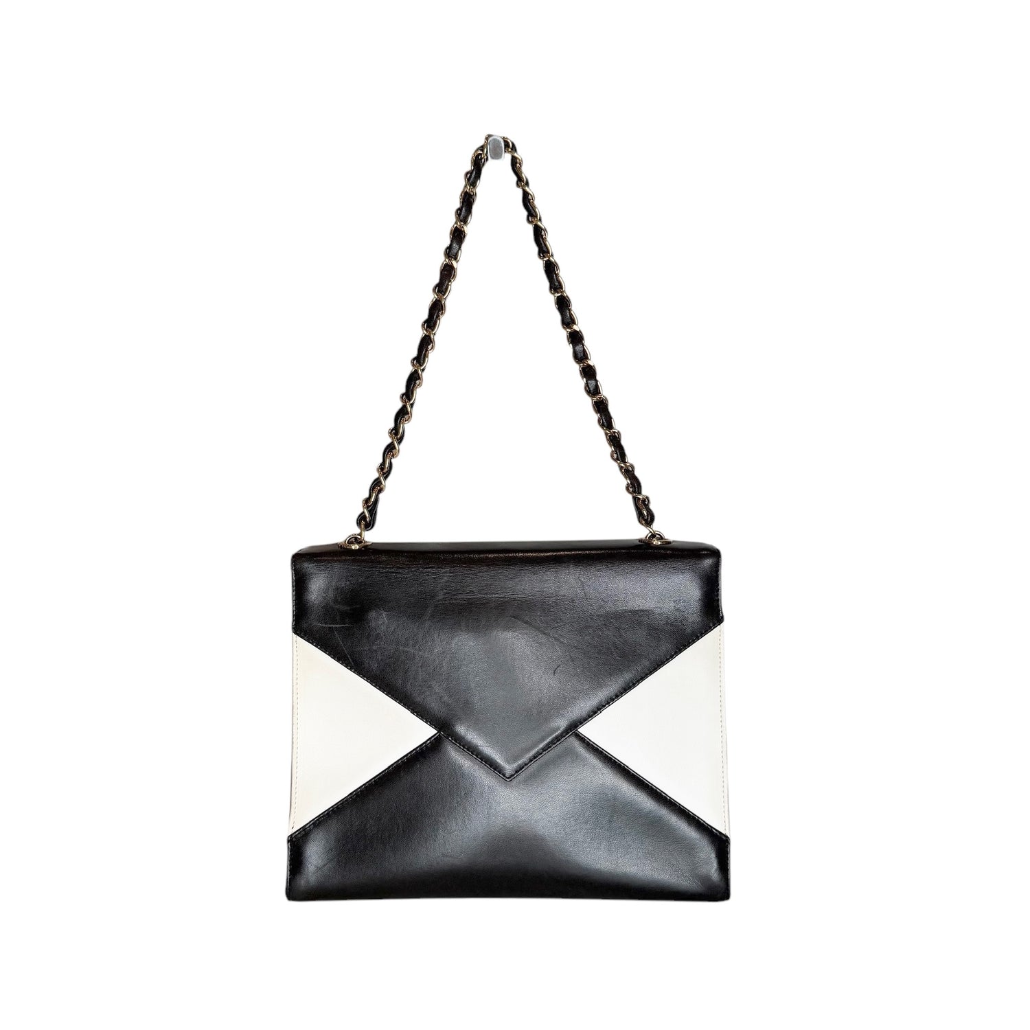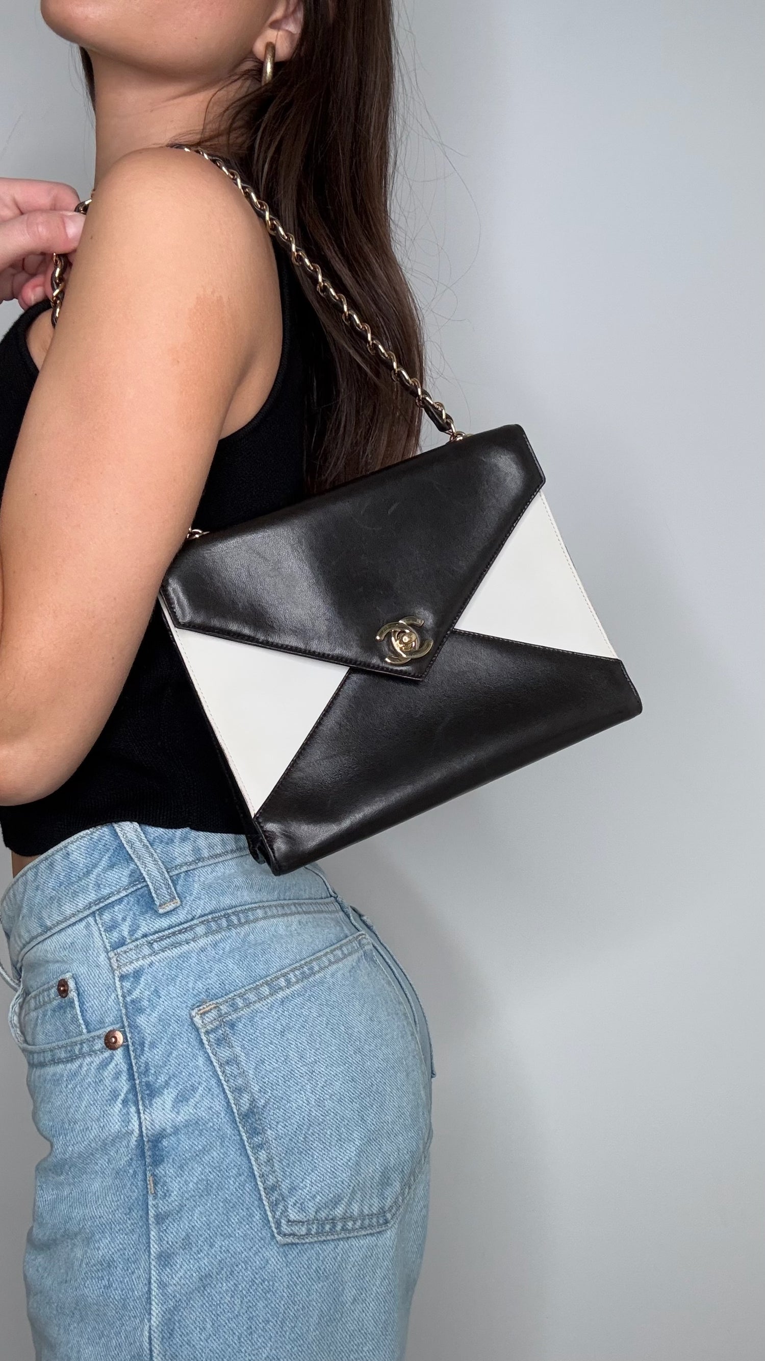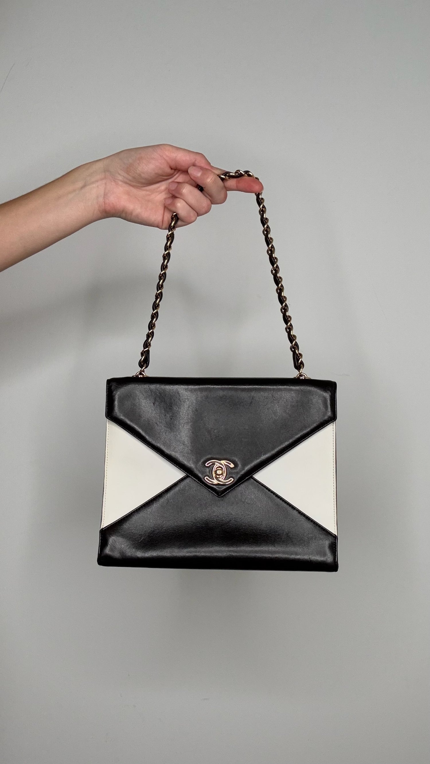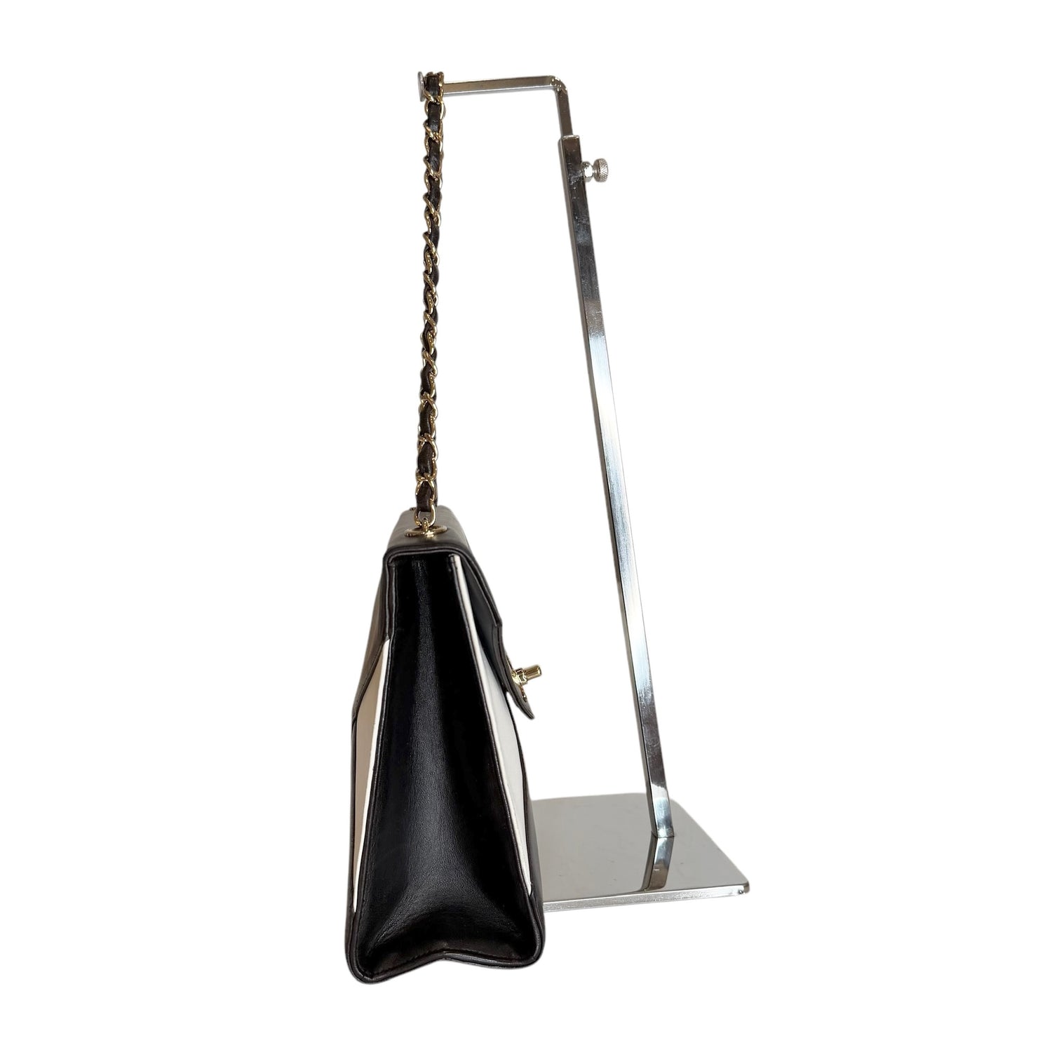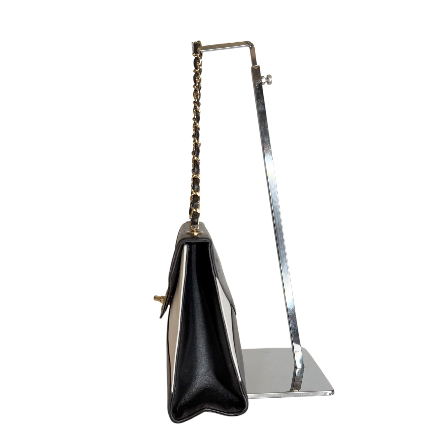 Chanel black and white lambskin leather flap bag. Gold-tone hardware. Single chain strap. One interior pocket.