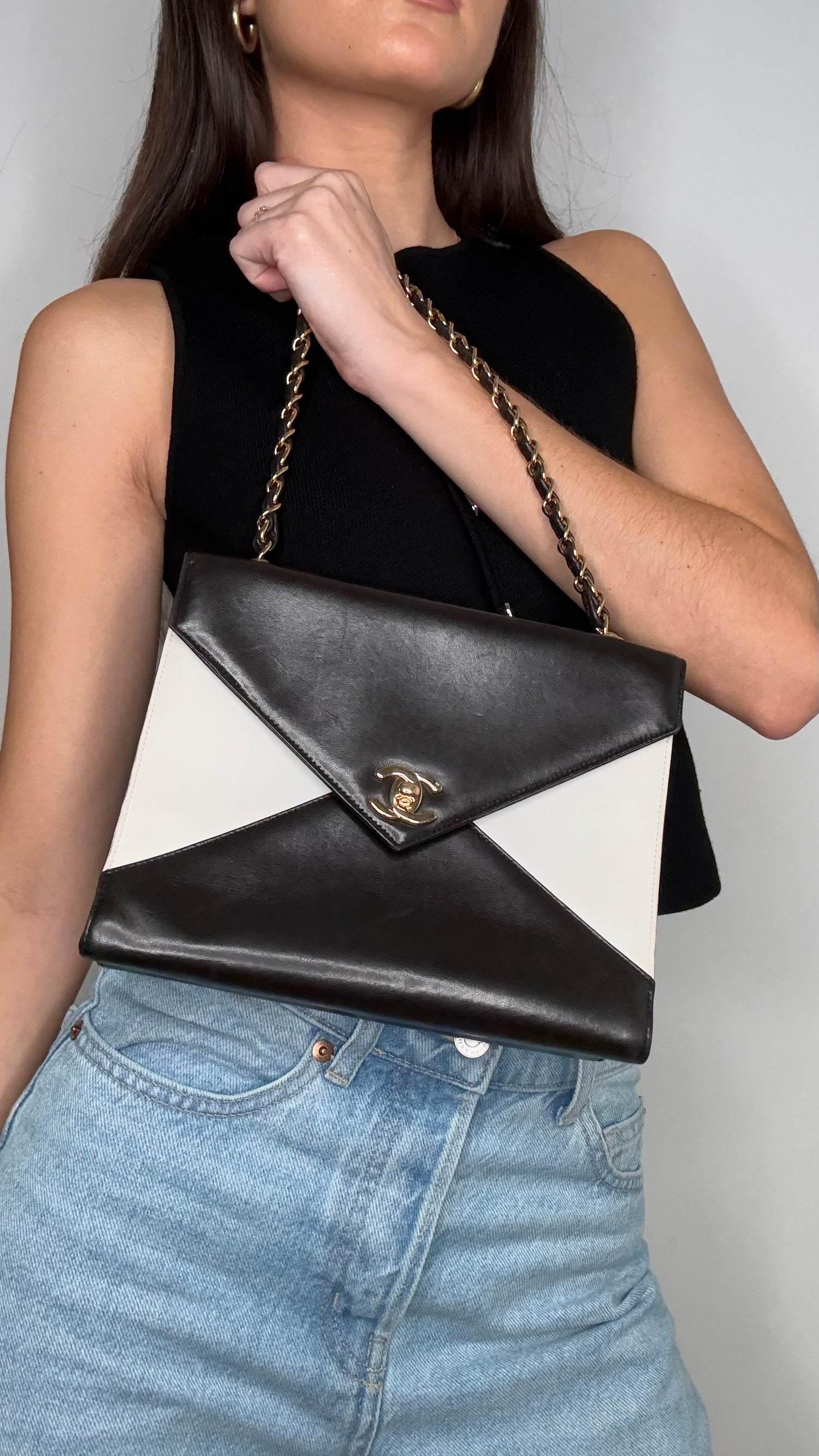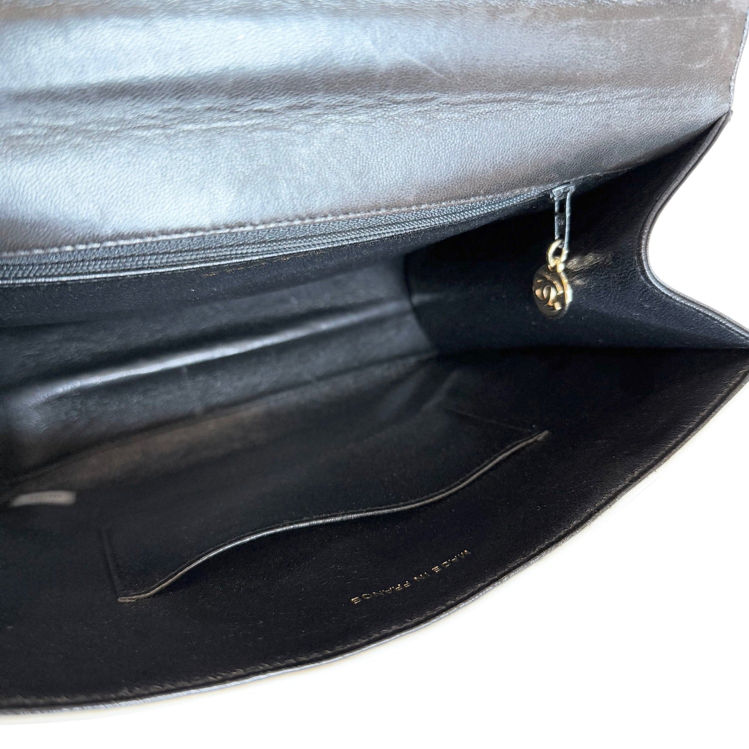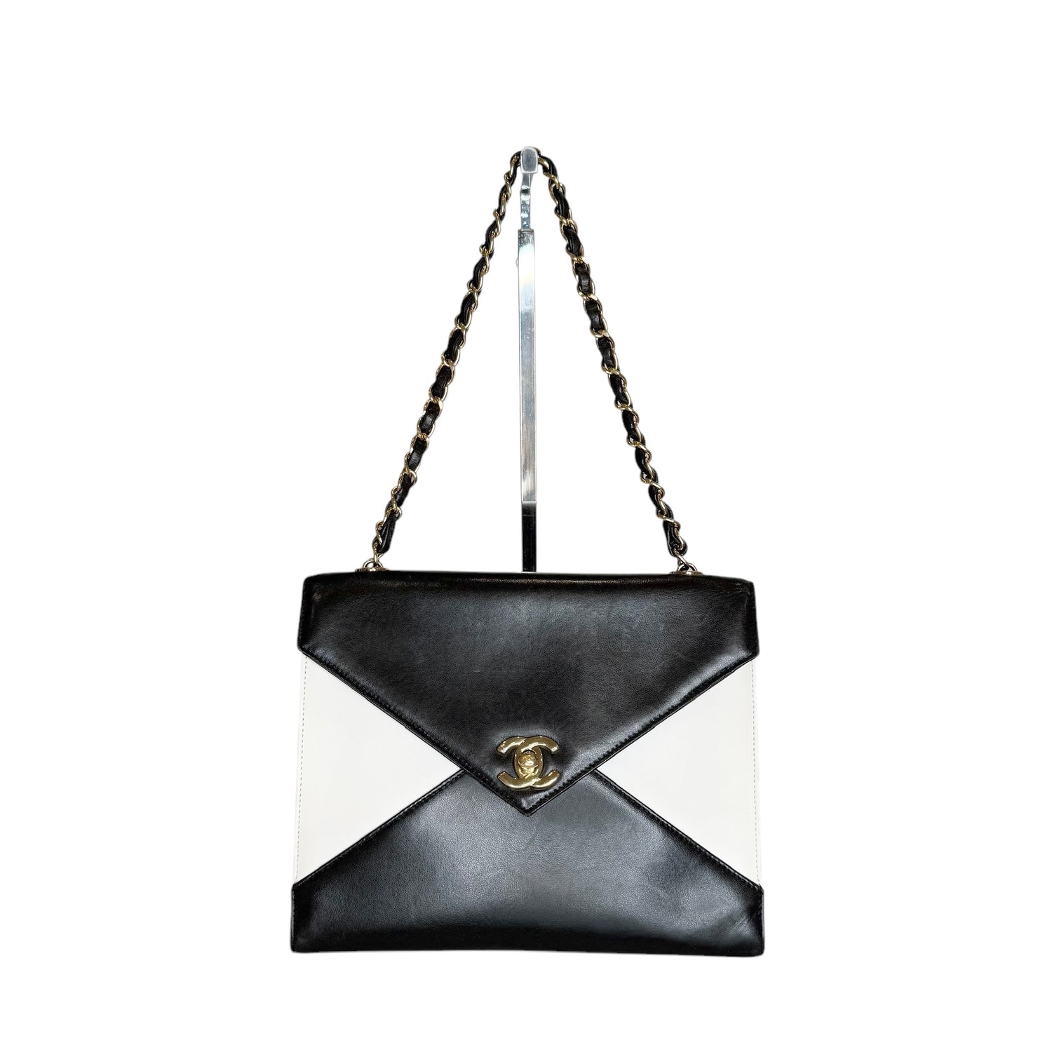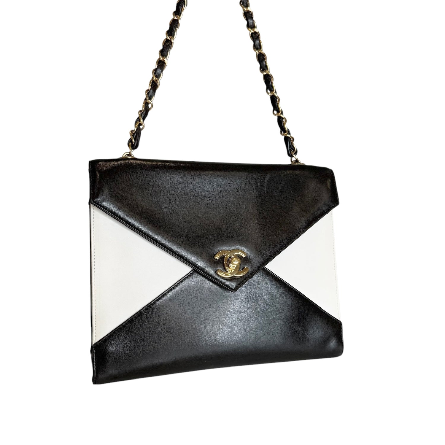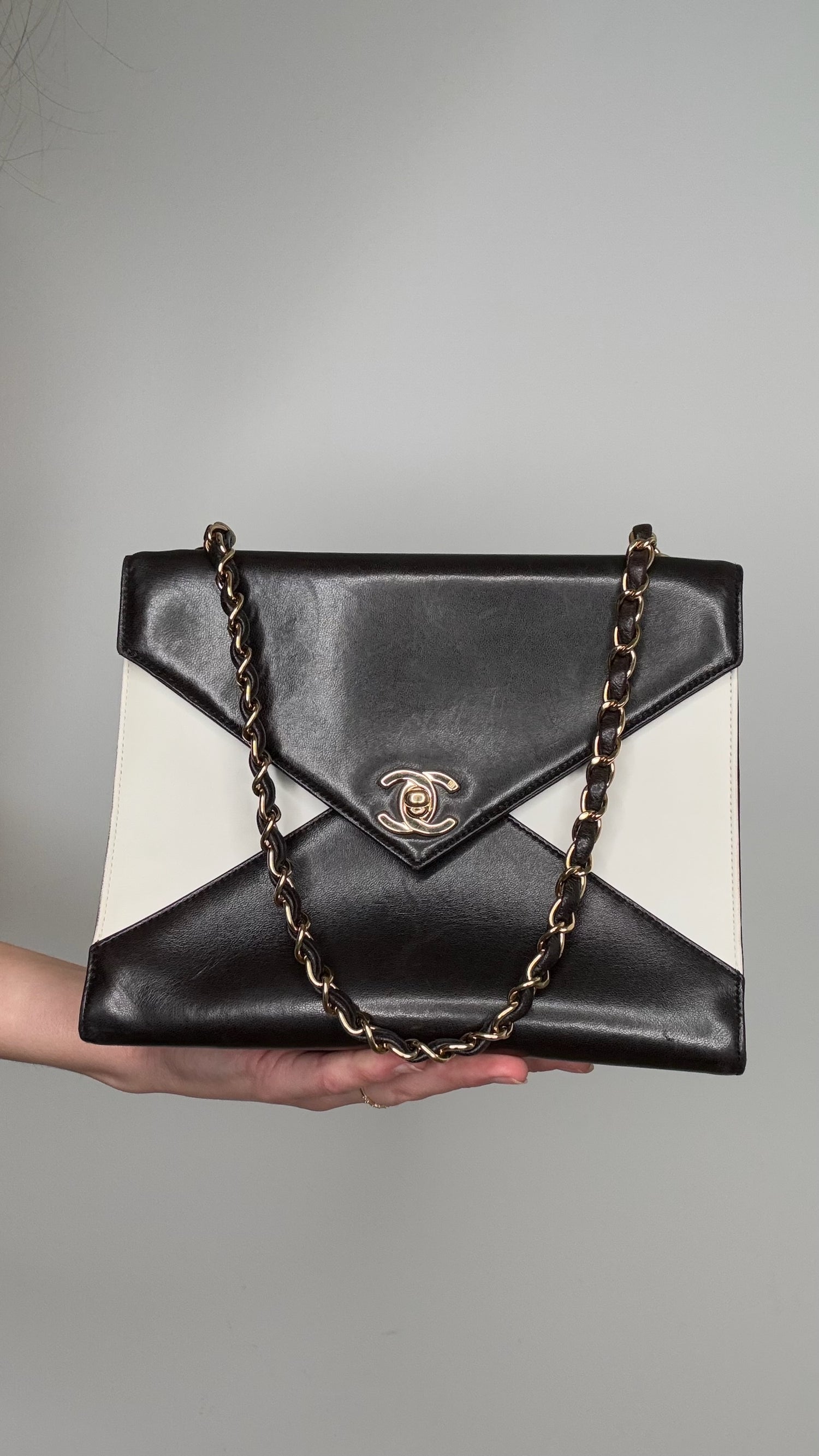 Chanel black and white lambskin leather flap bag. Gold-tone hardware. Single chain strap. One interior pocket.