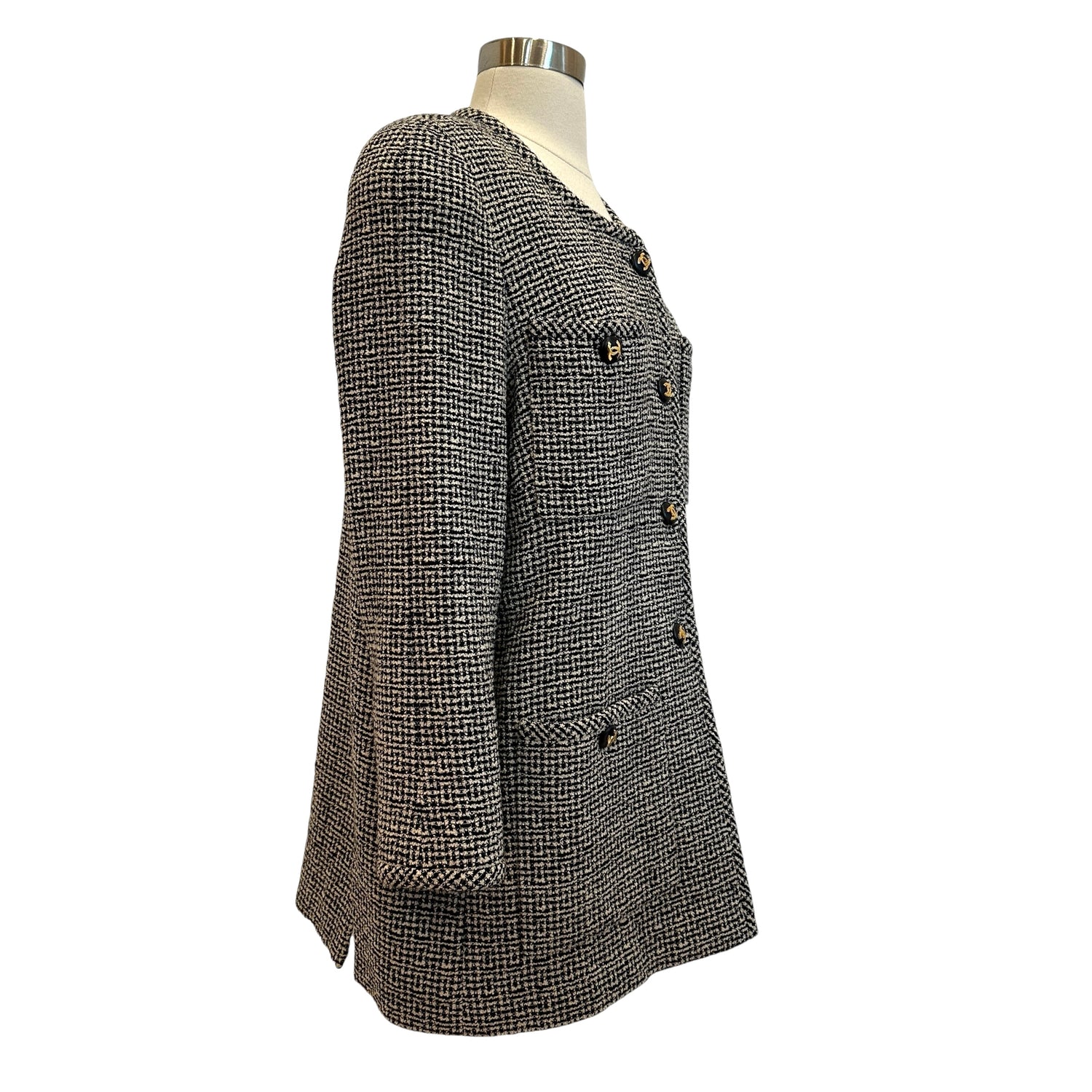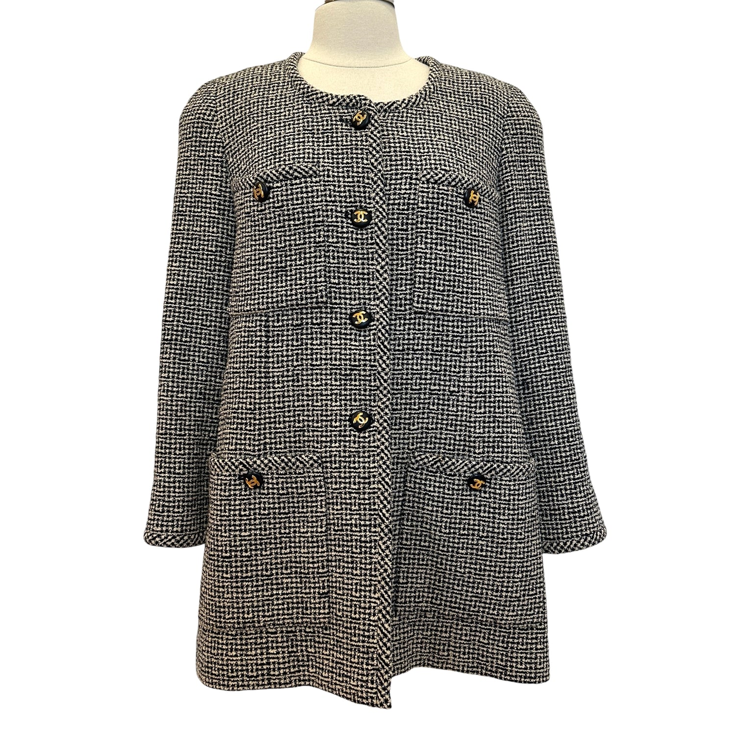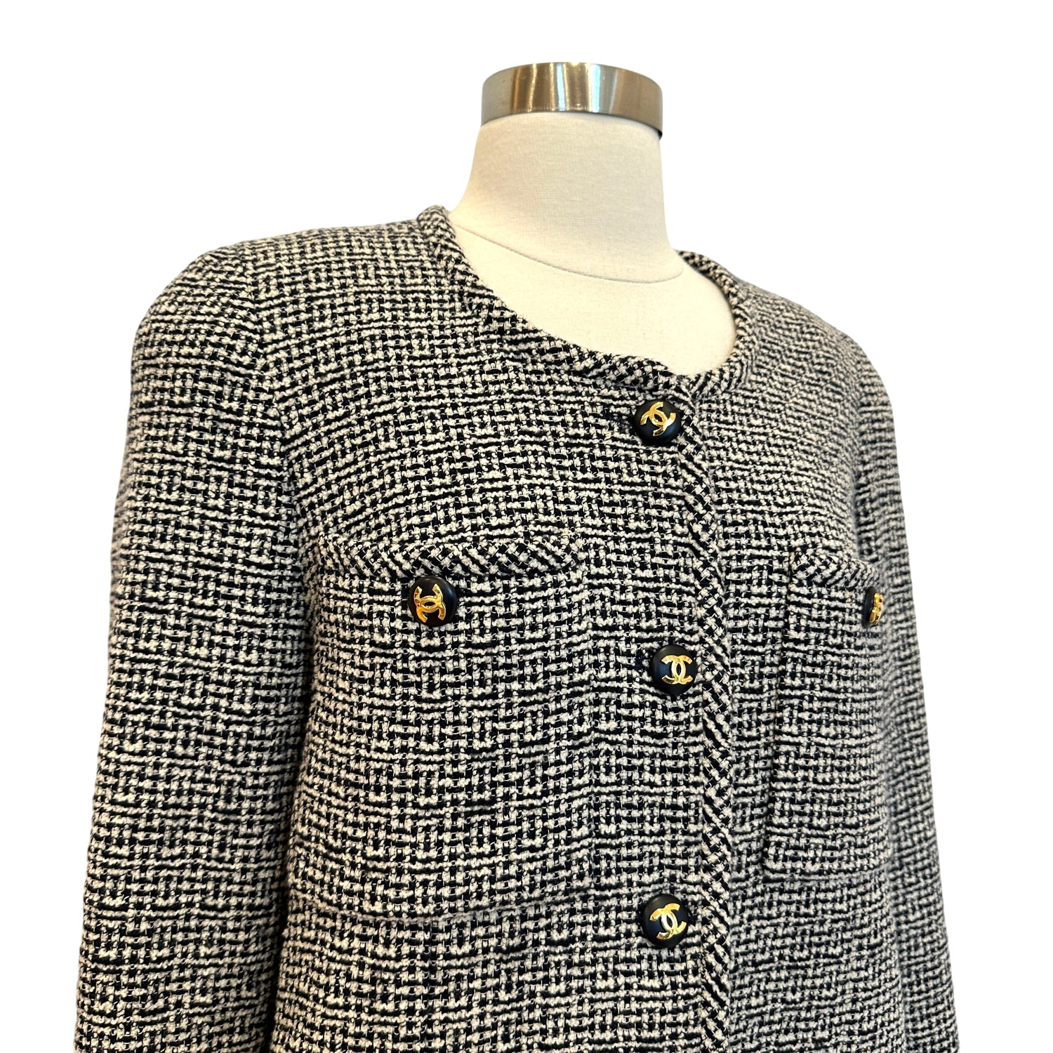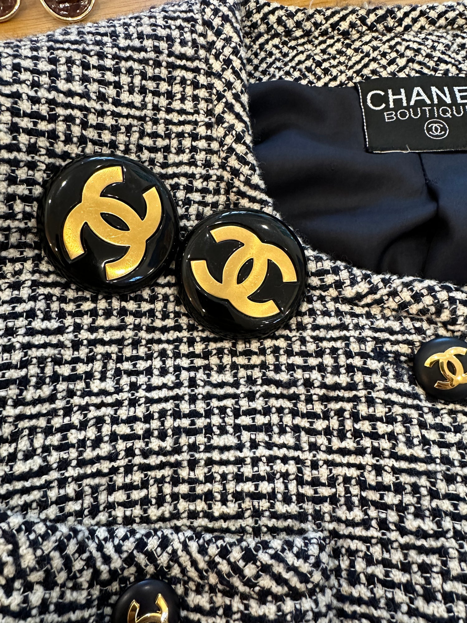 Chanel vintage tweed jacket. Collarless. Stunning large CC button in gold and black. Four pockets with buttons. Silk lining. Designer size 44.