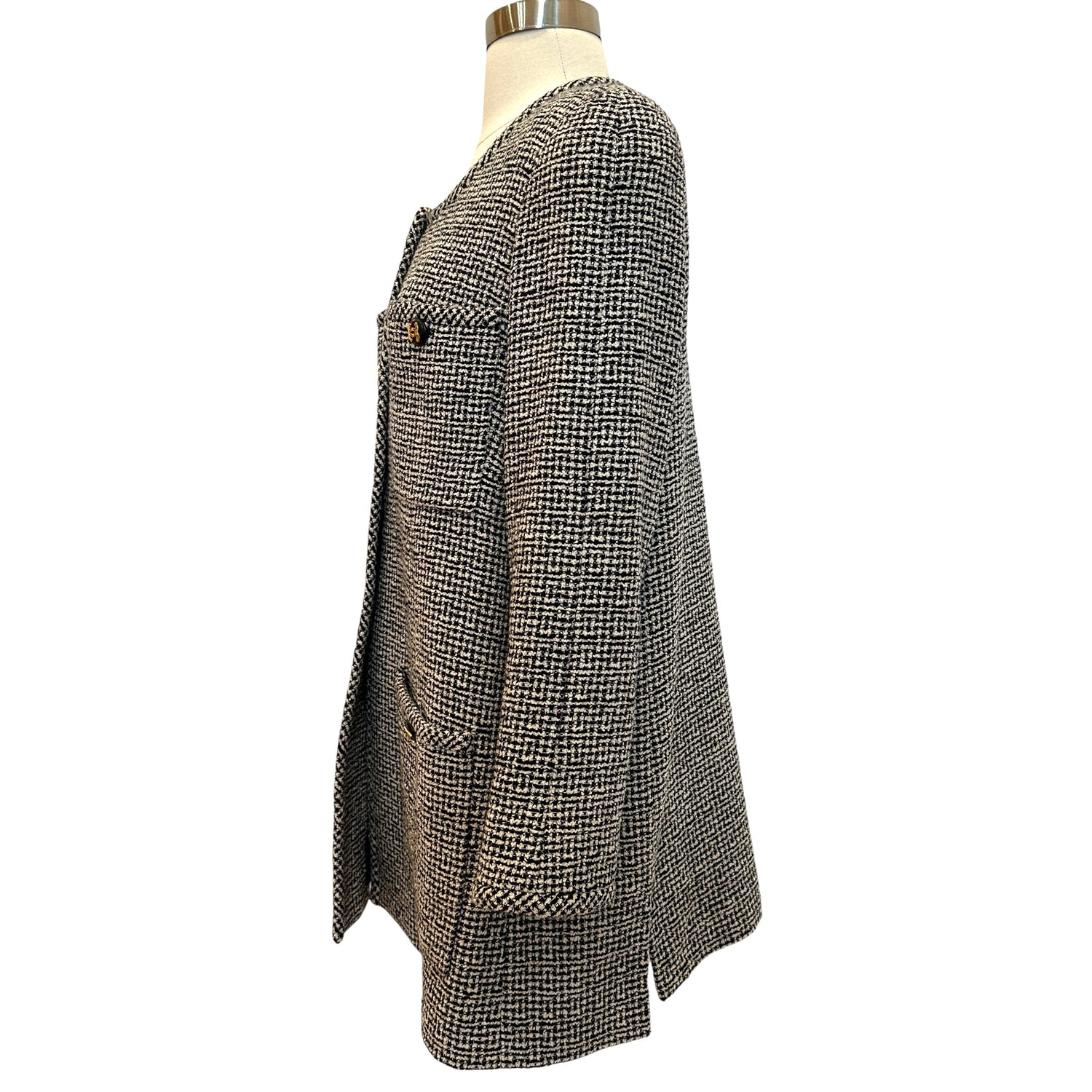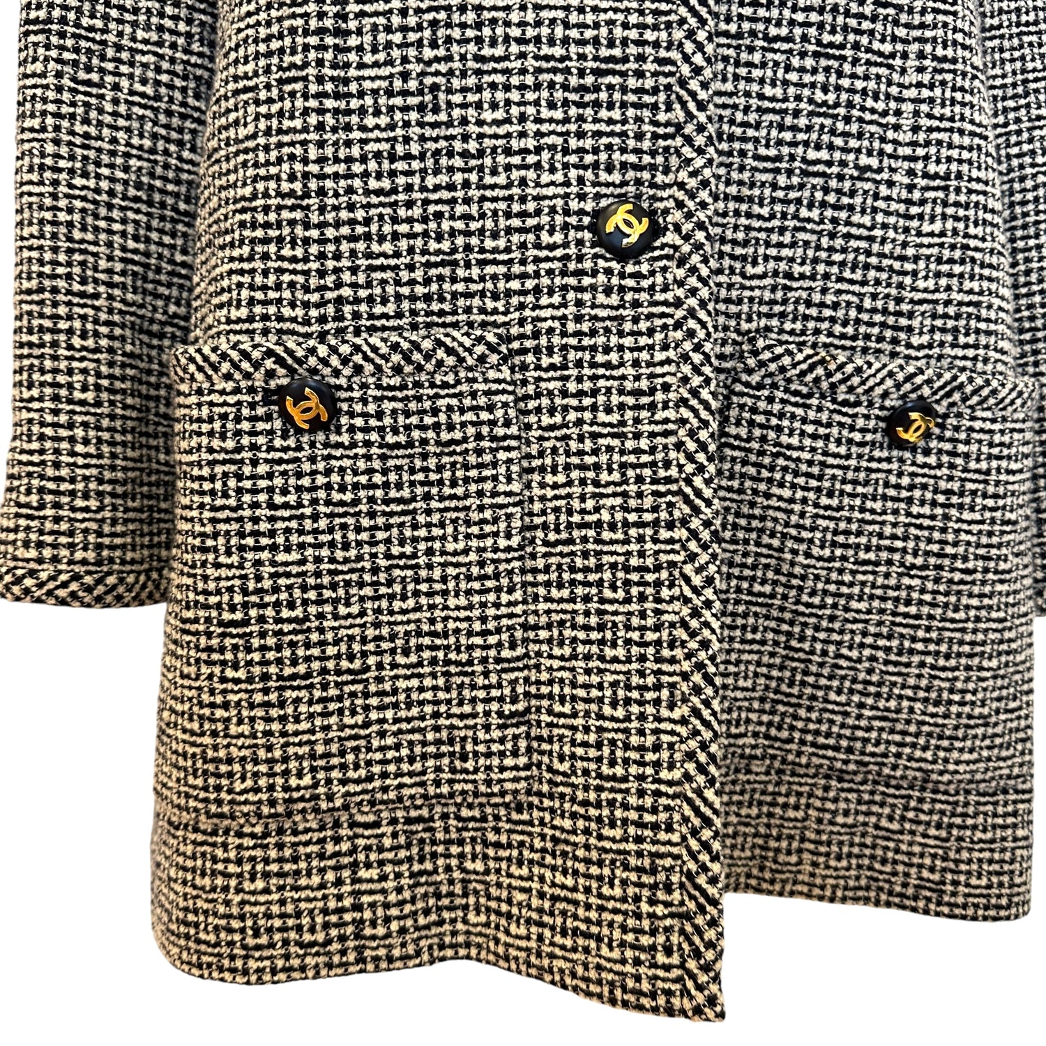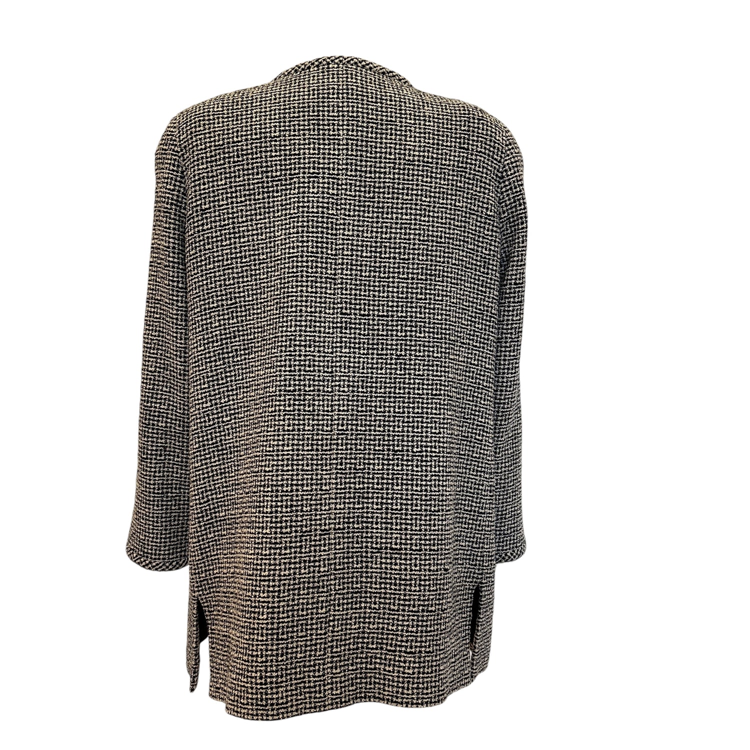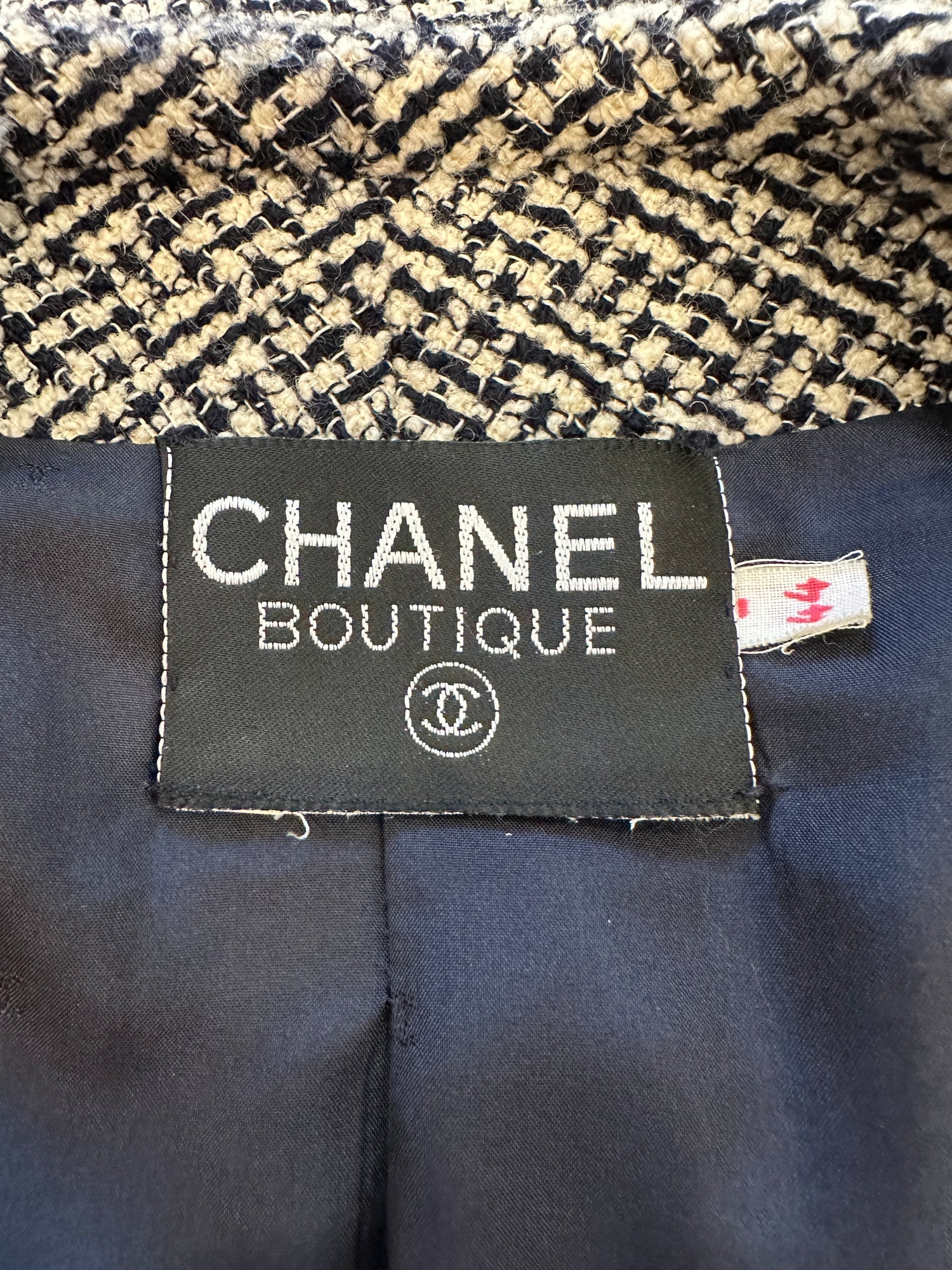 Chanel vintage tweed jacket. Collarless. Stunning large CC button in gold and black. Four pockets with buttons. Silk lining. Designer size 44.