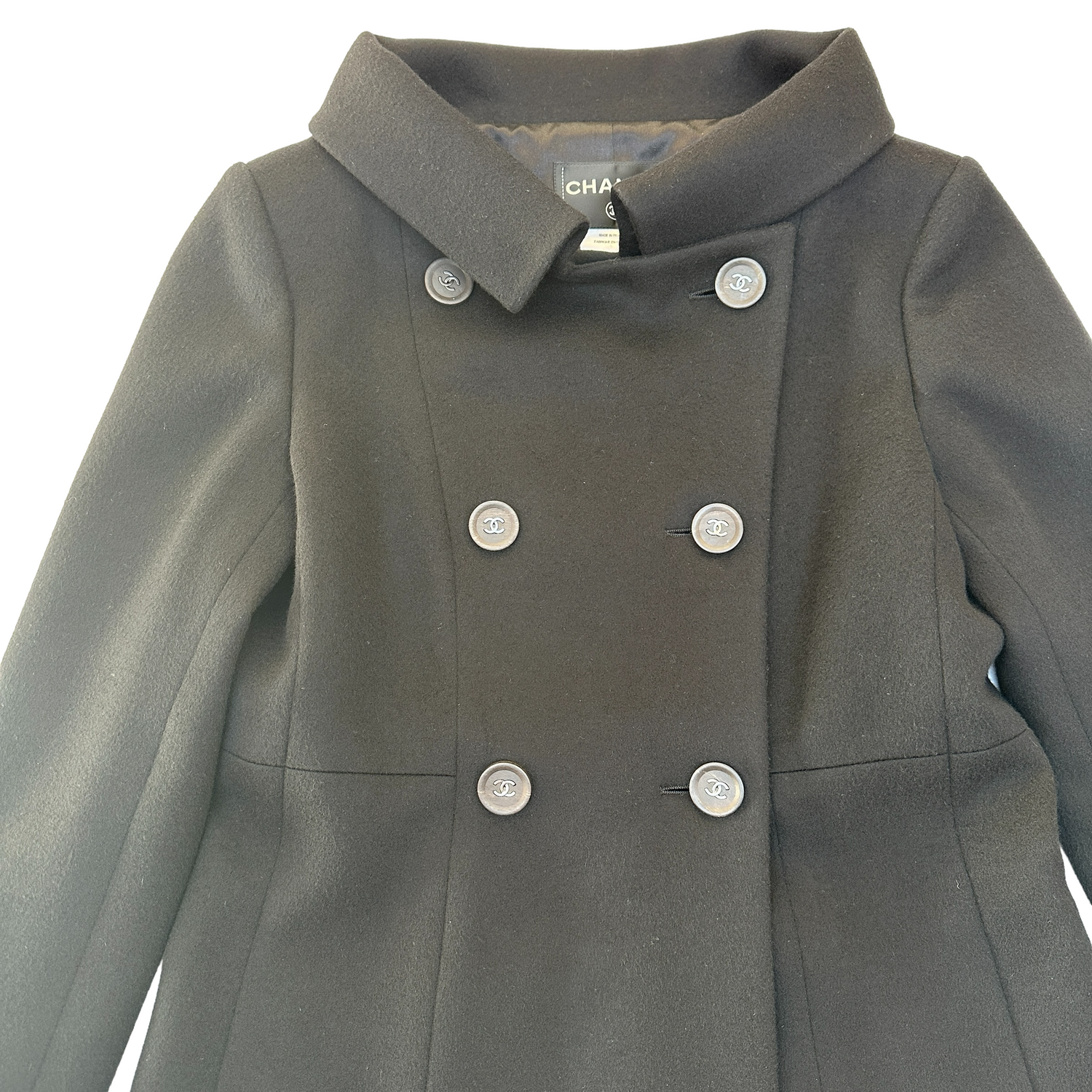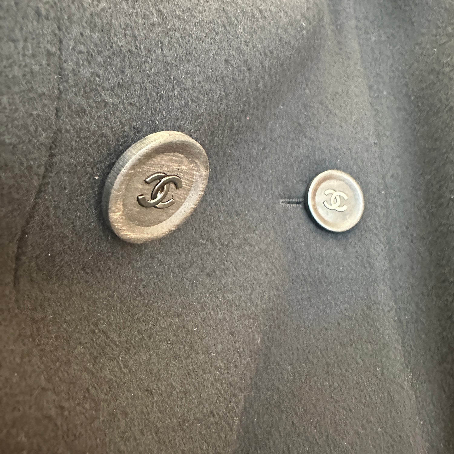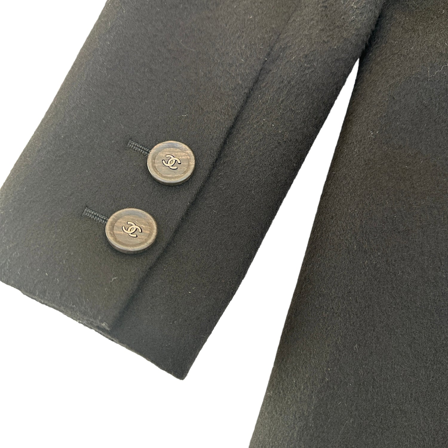 Chanel black wool long coat. Boat neck. Brown wooden buttons with CC logo. Designer size 40.