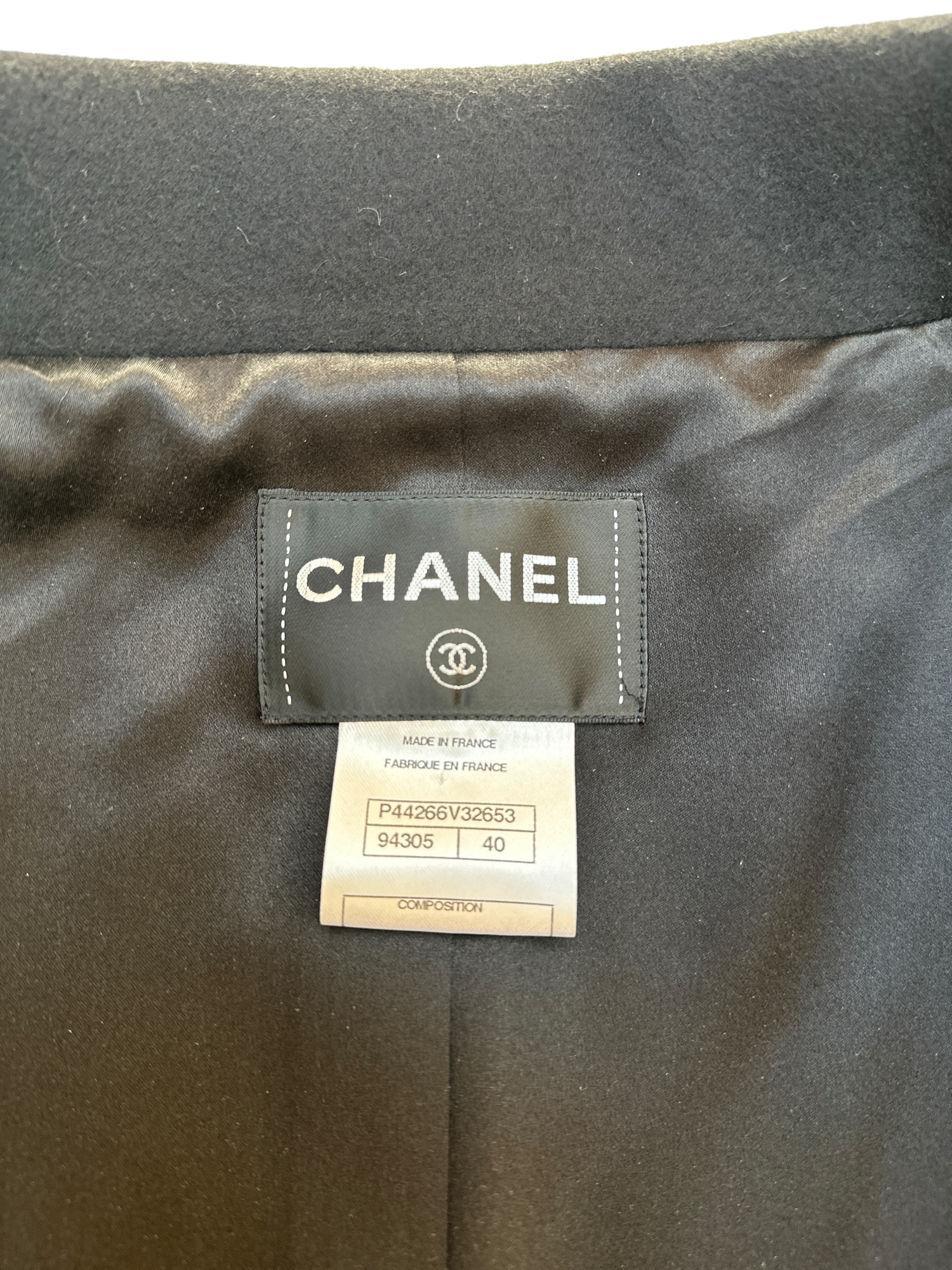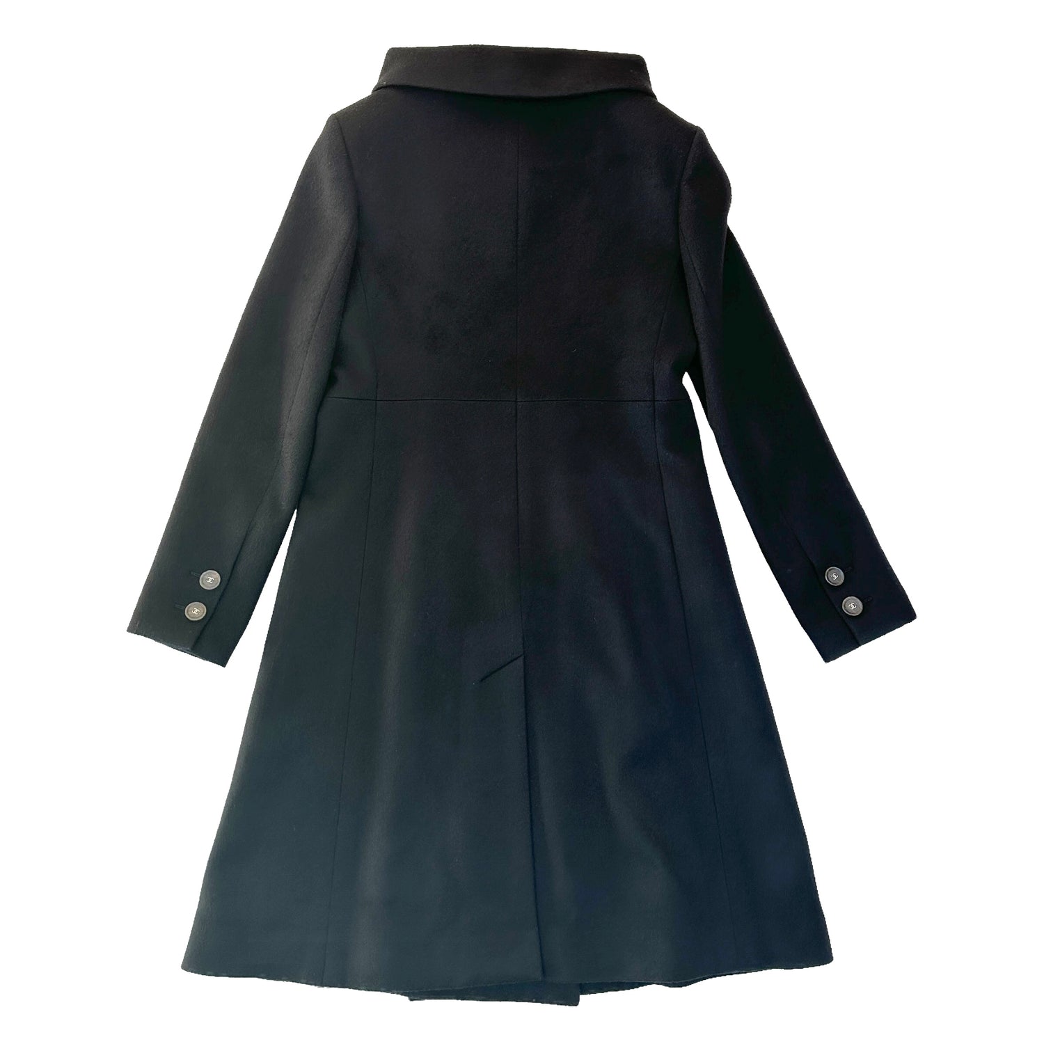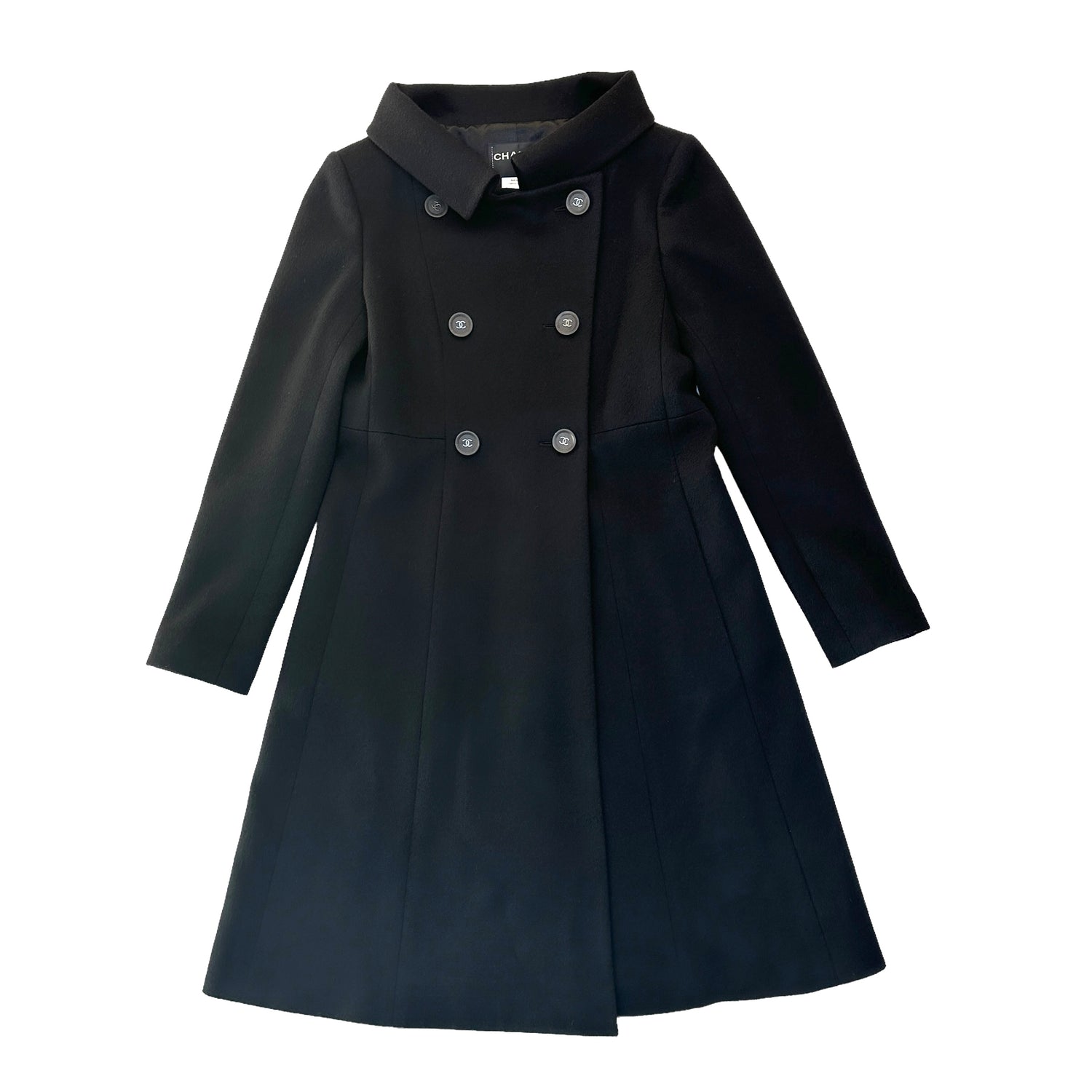 Chanel black wool long coat. Boat neck. Brown wooden buttons with CC logo. Designer size 40.