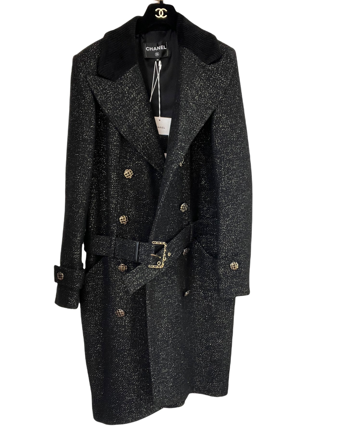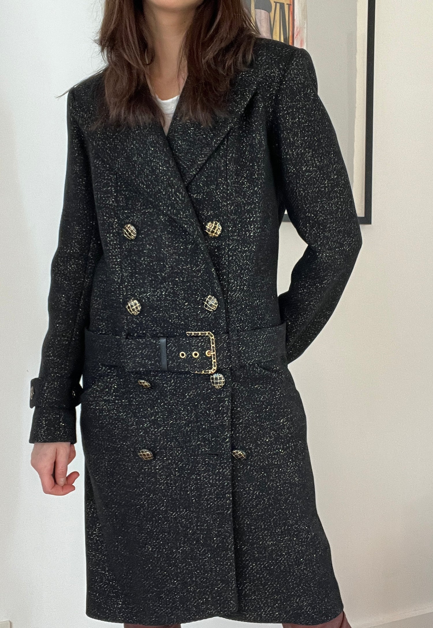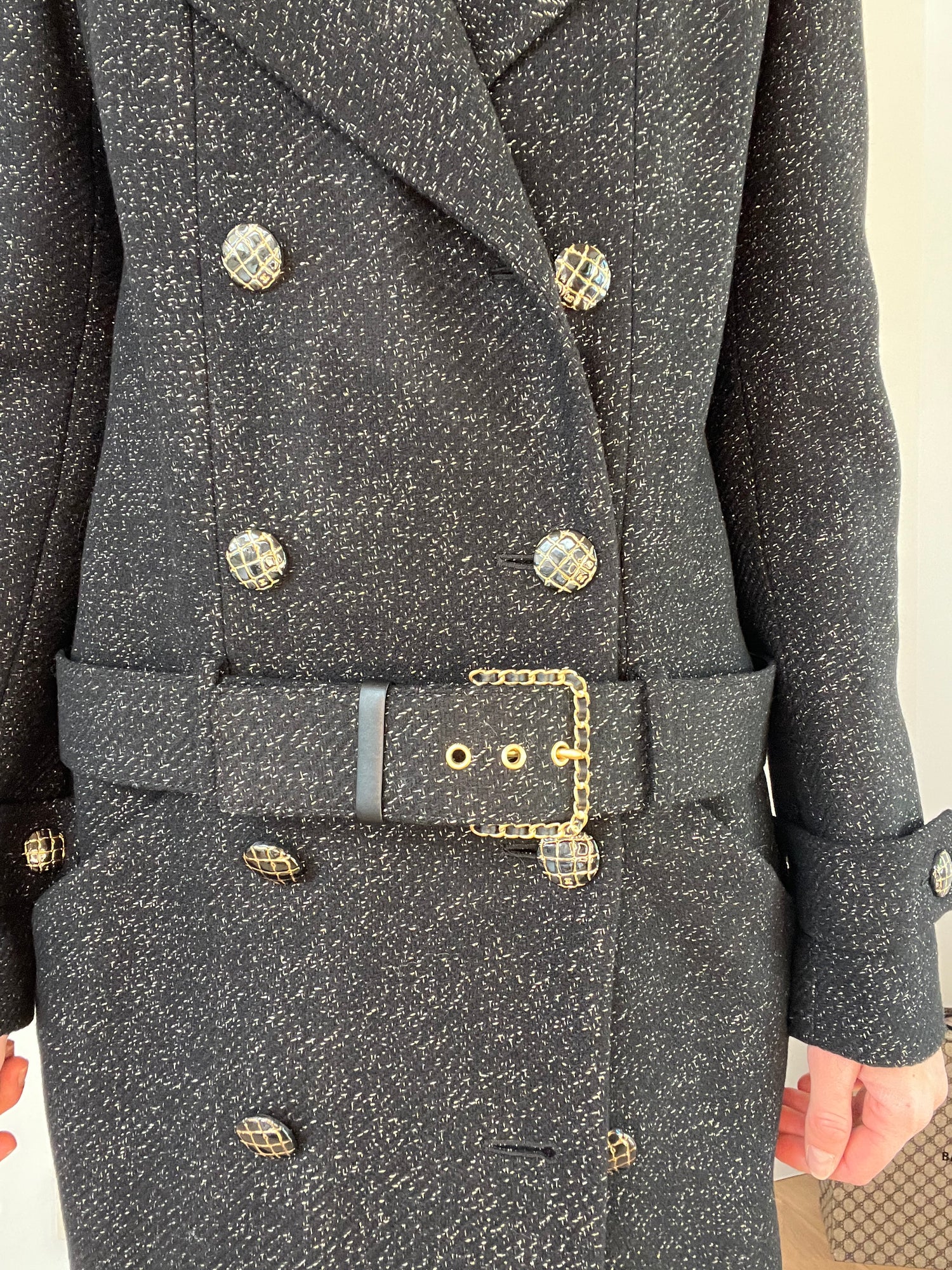 This is a stunning trench coat from Chanel. It is a classic style yet rock and roll with the lower belt.