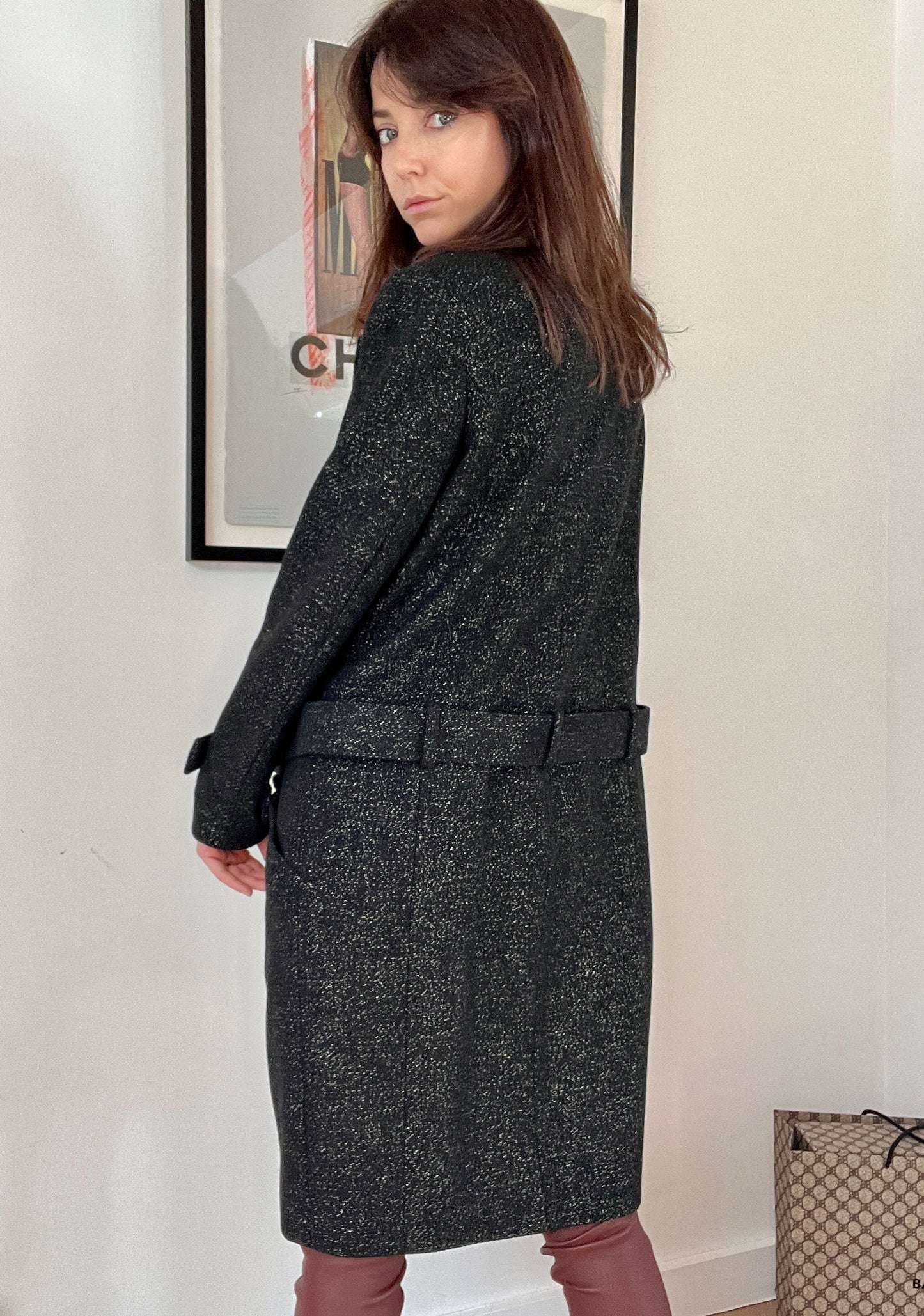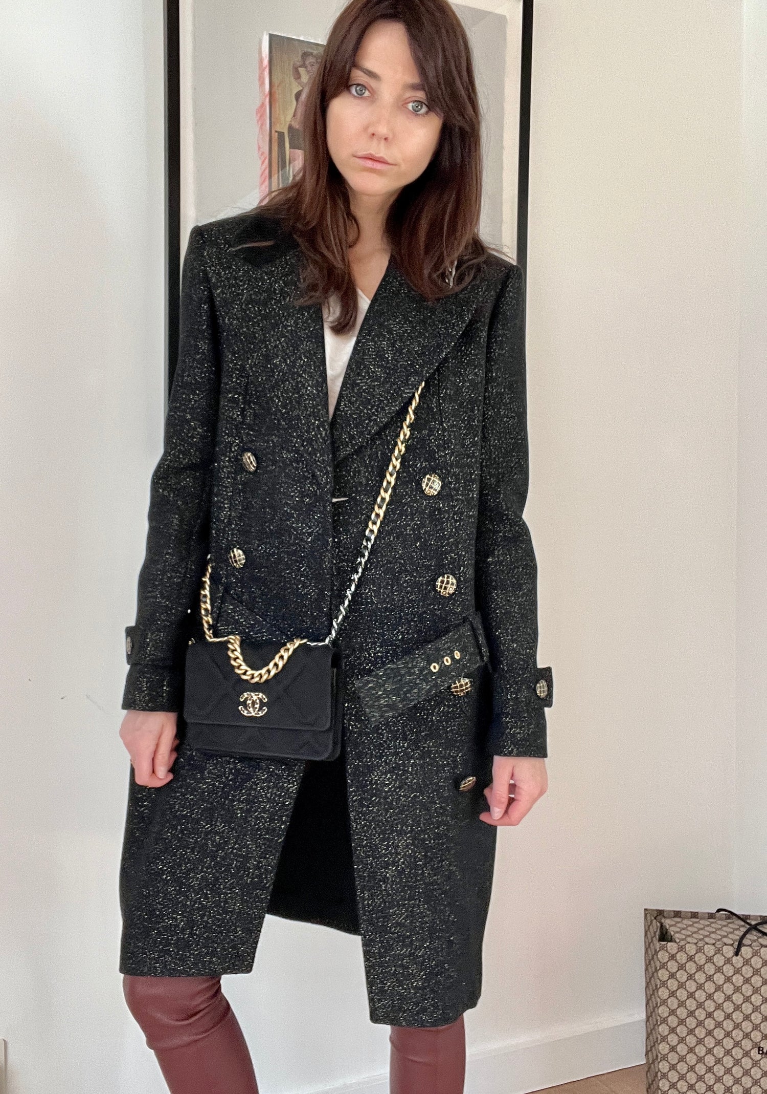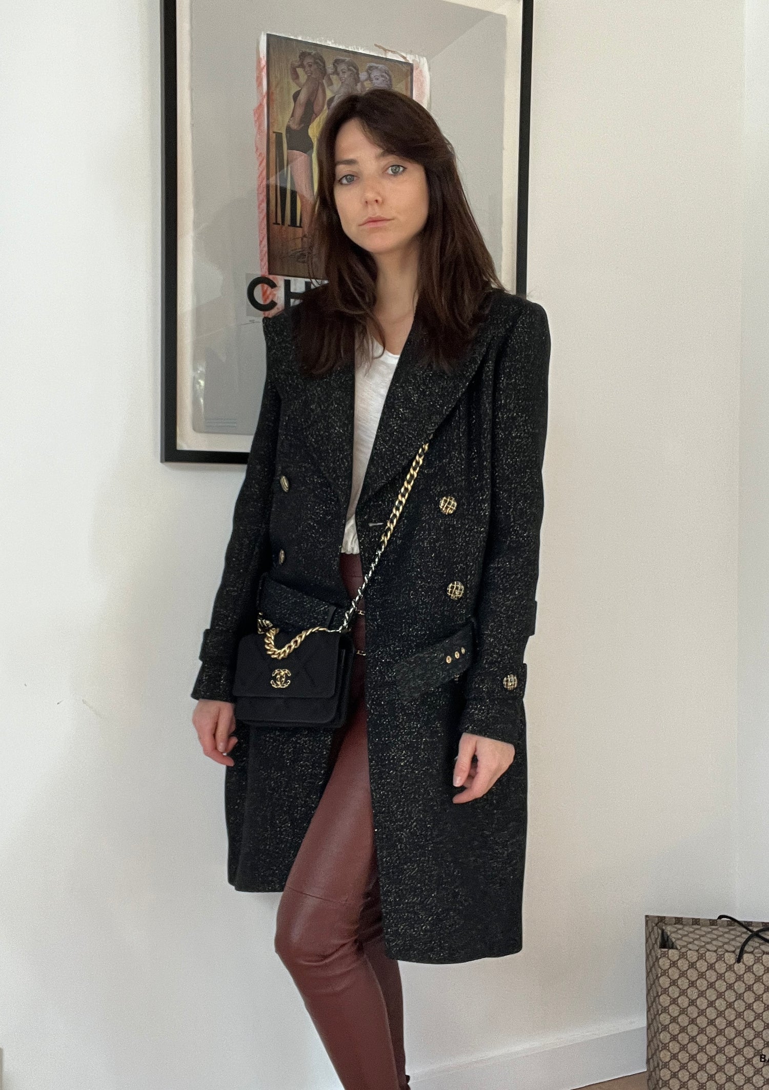 This is a stunning trench coat from Chanel. It is a classic style yet rock and roll with the lower belt.