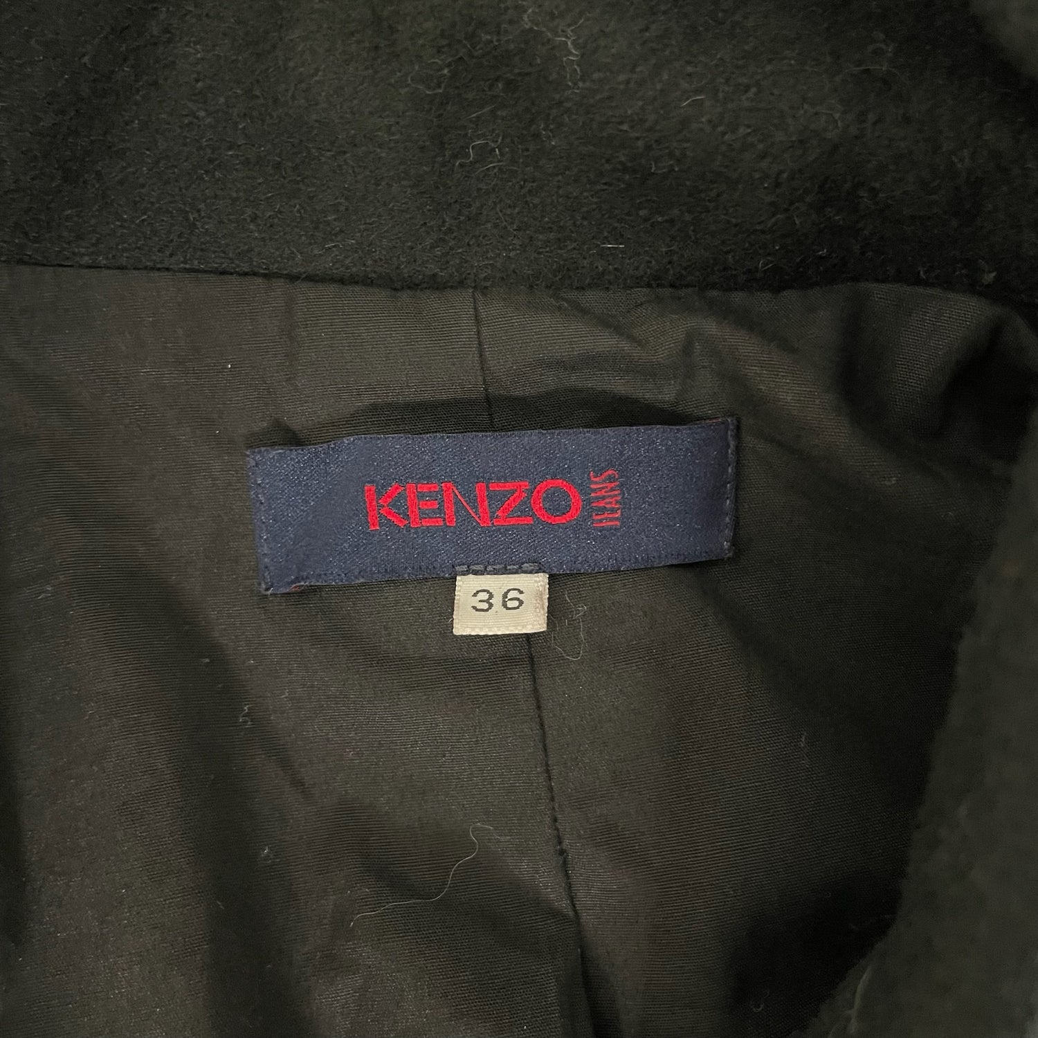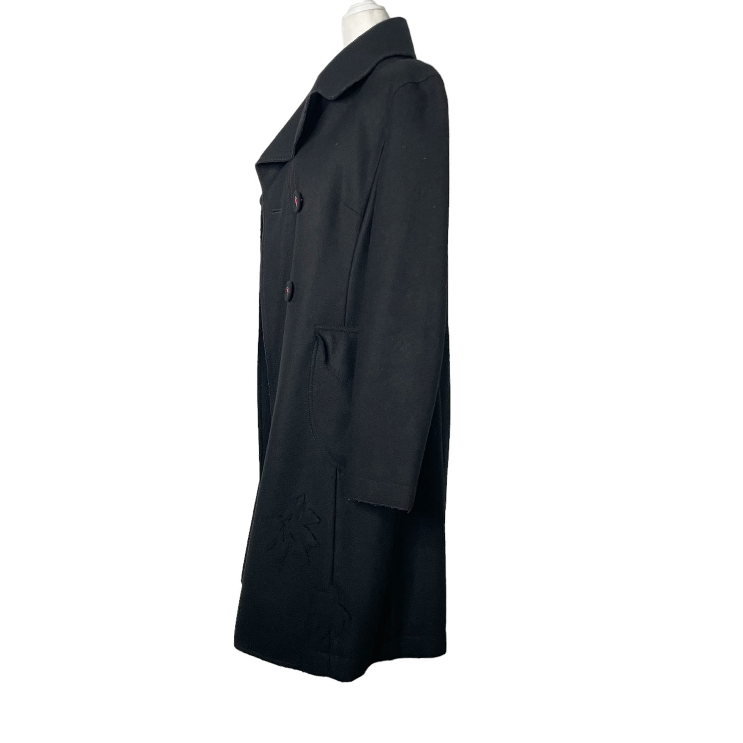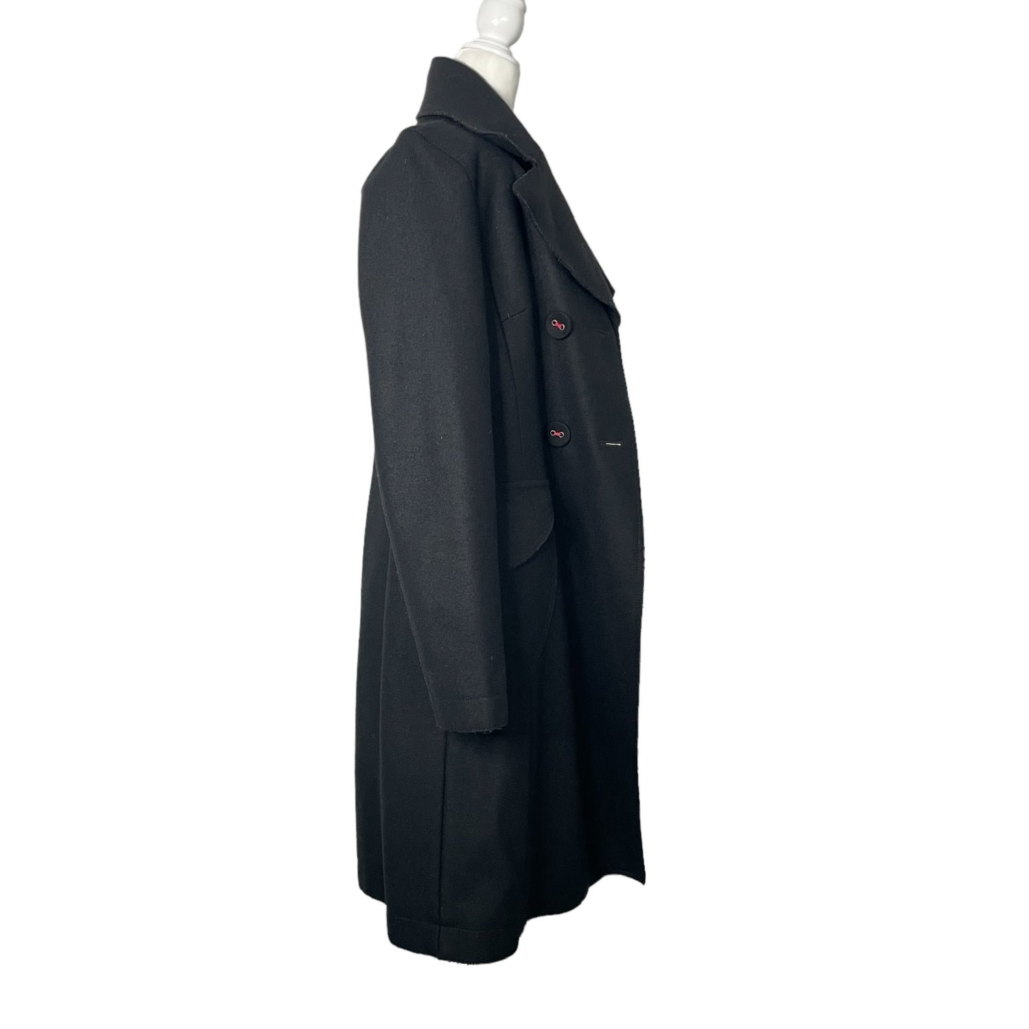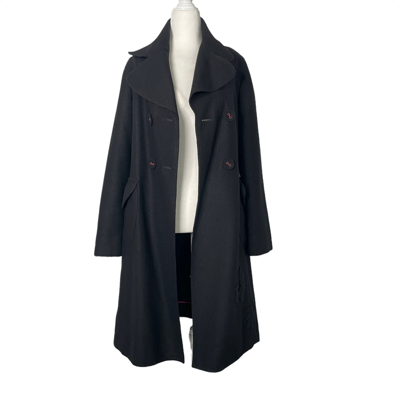 Kenzo black wool trench coat. Front button closures with red threading. Designer size 36.