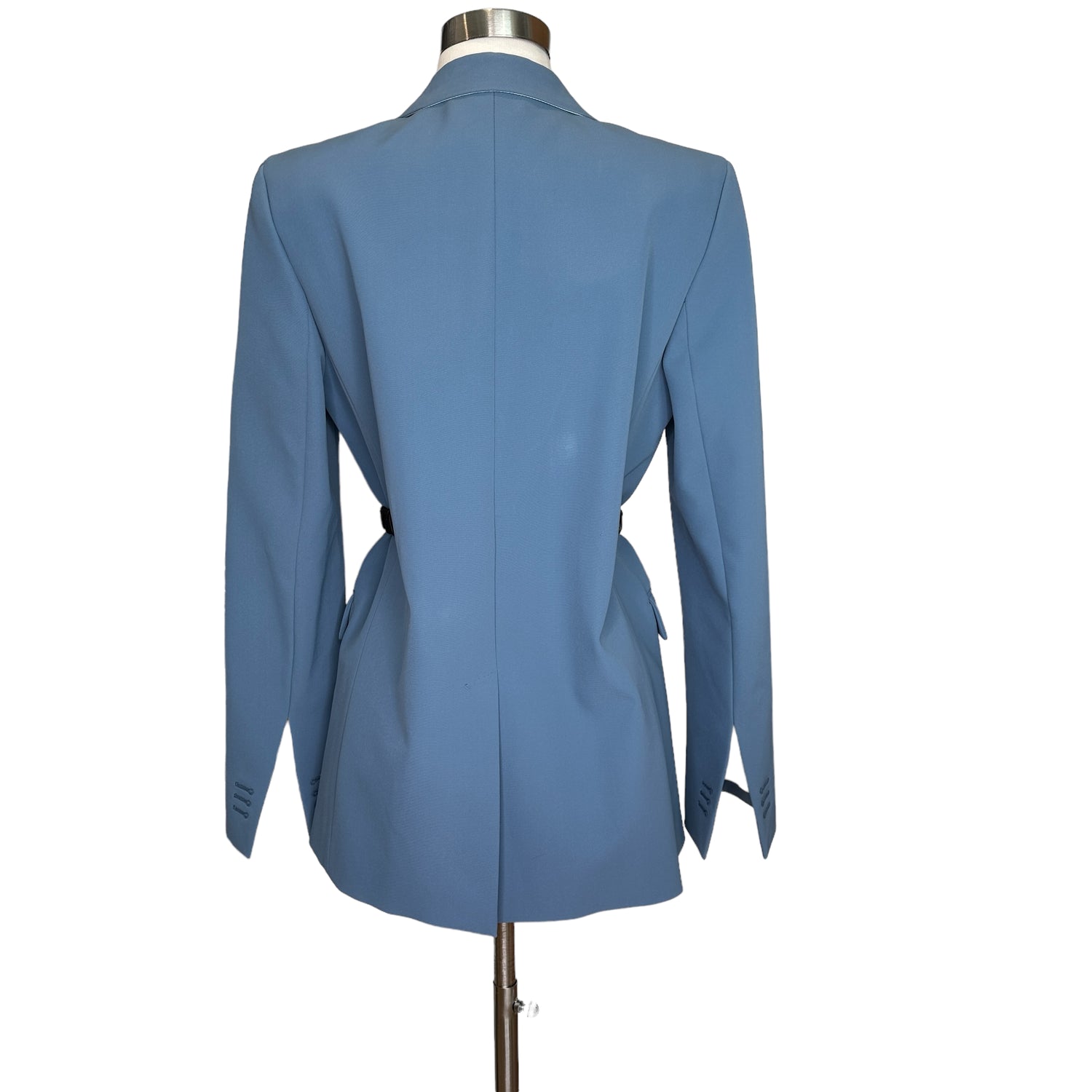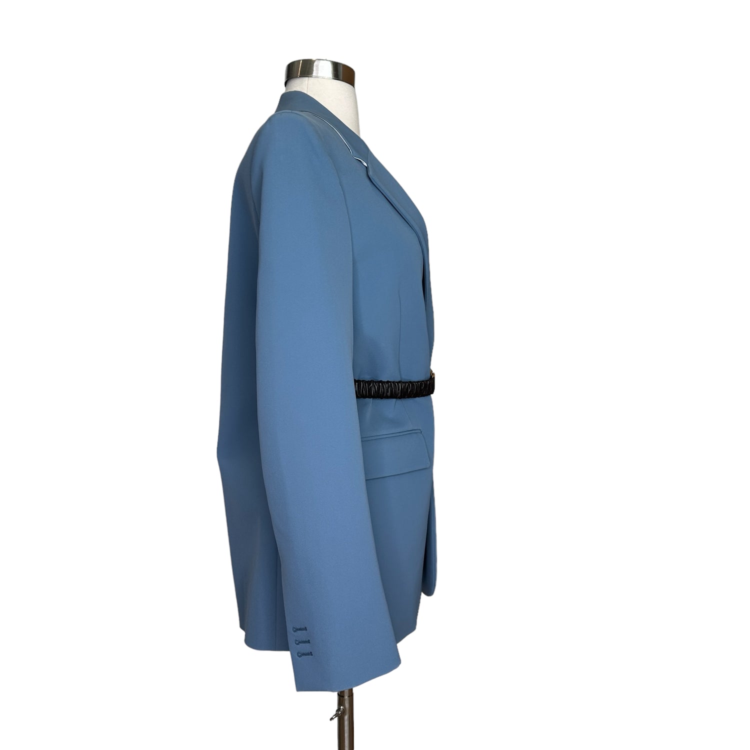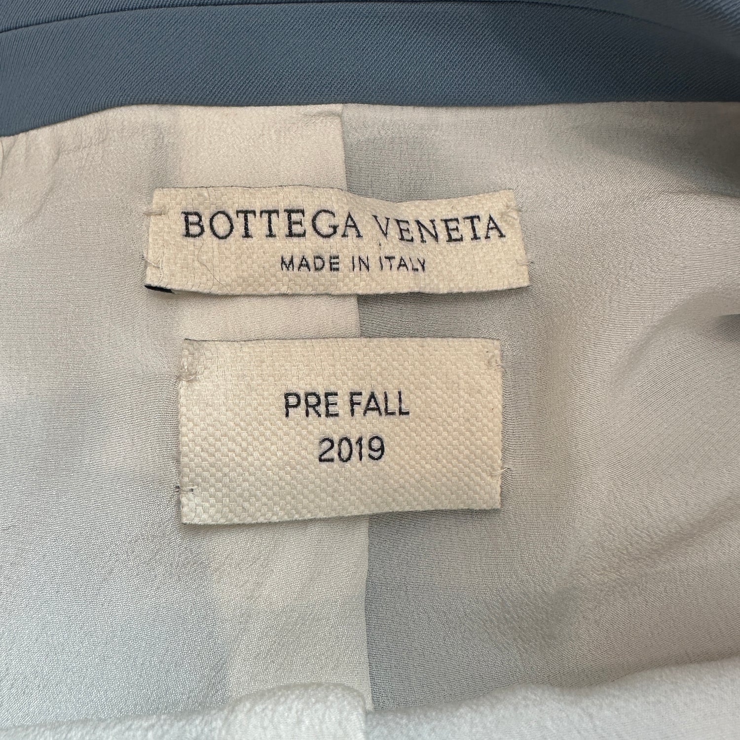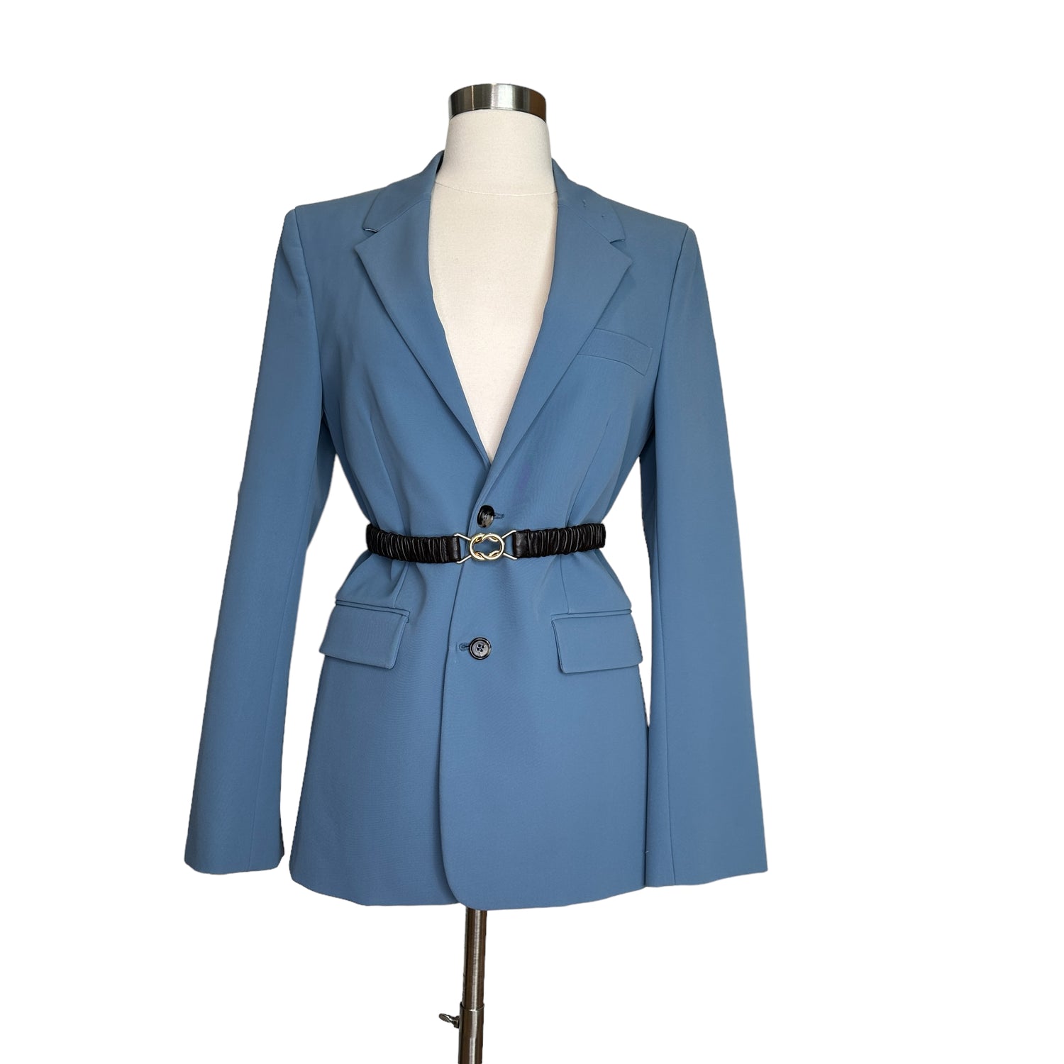 Bottega Veneta pre-fall 2019 collection jacket. Blue blazer with chocolate brown leather belt. Gold clasp at belt. Button closure at front. Pointed collar. Designer size 40.