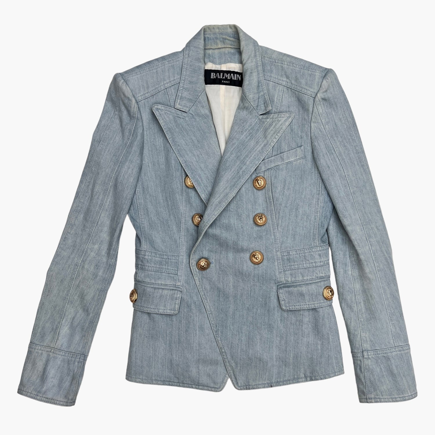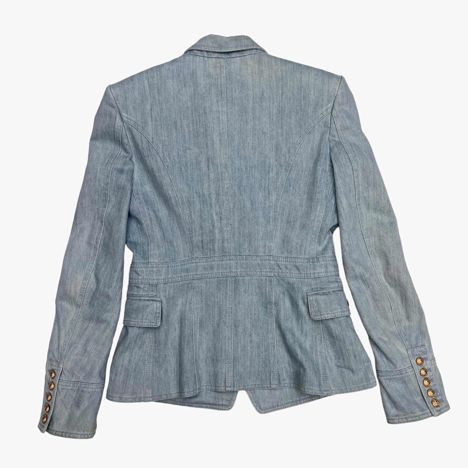 Balmain blue denim blazer. Gold-tone buttons. Designer size 44.