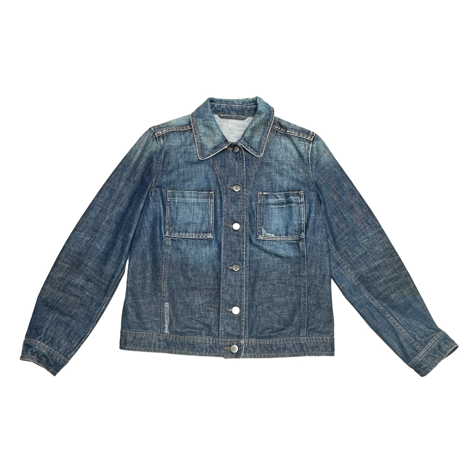 Prada blue denim jacket. Pointed collar. Prada logo printed on pocket, at front and inside. Designer size 44.