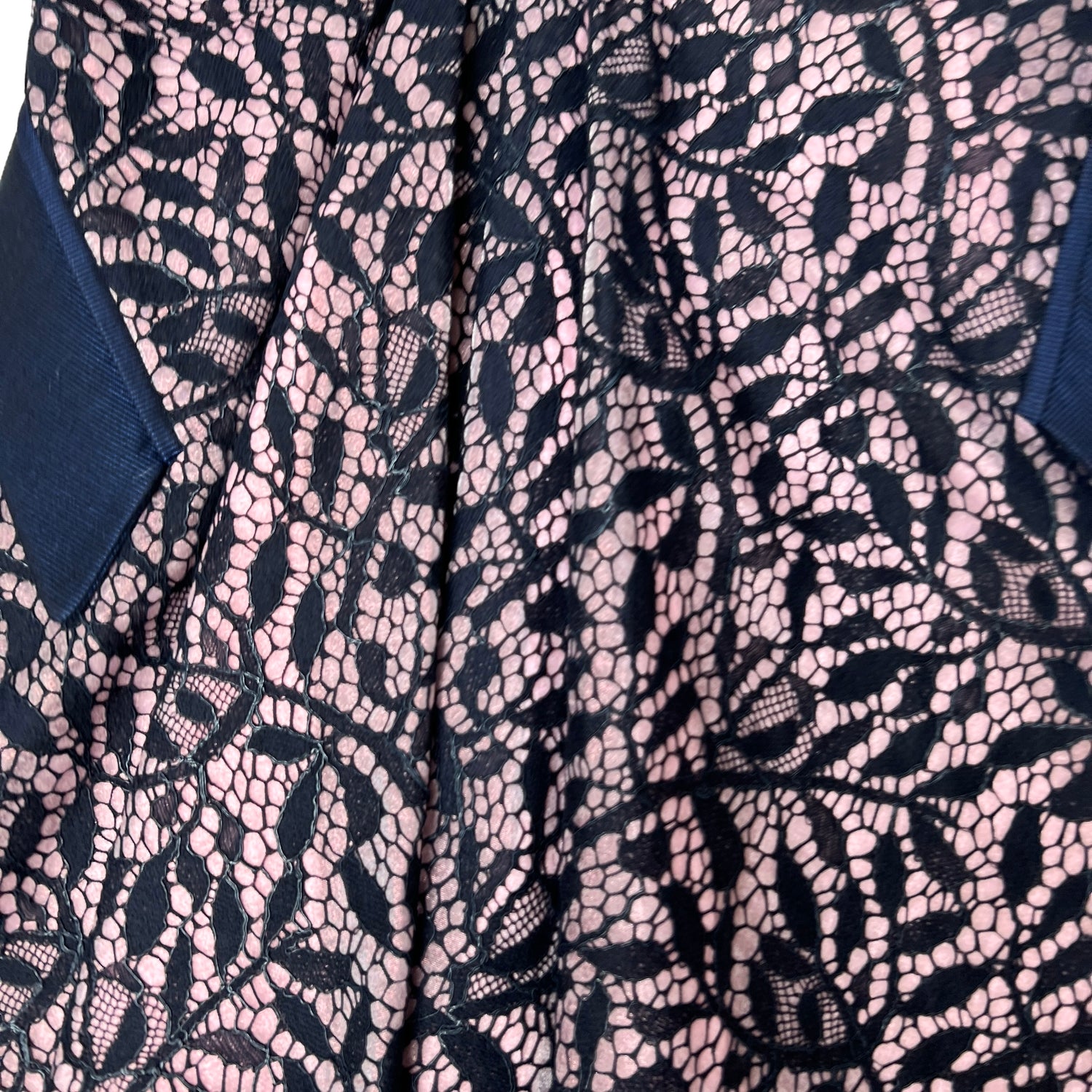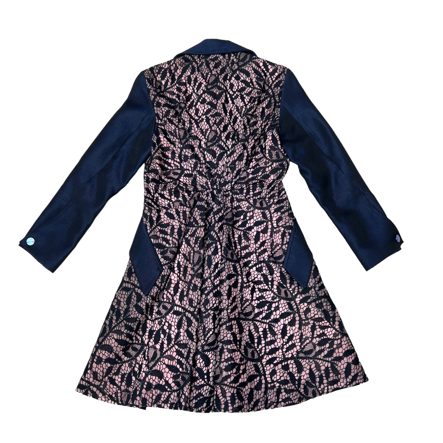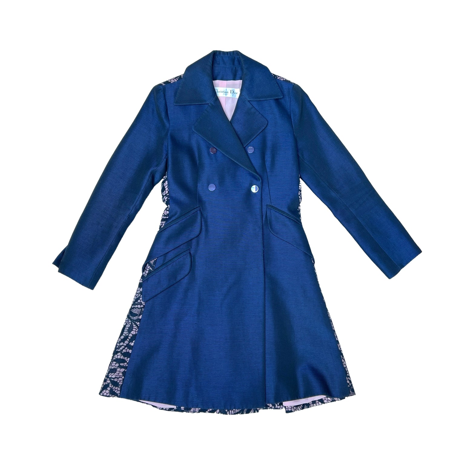 Christian Dior blue dress coat with lace at back. Blue lace on pink panel. Pockets. Pointed collar. Magnetic and snap buttons closure at front. Designer size 36 (US 4).