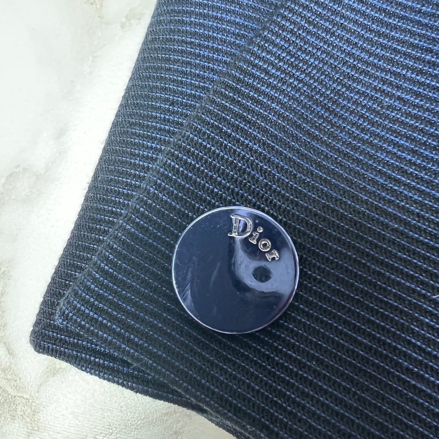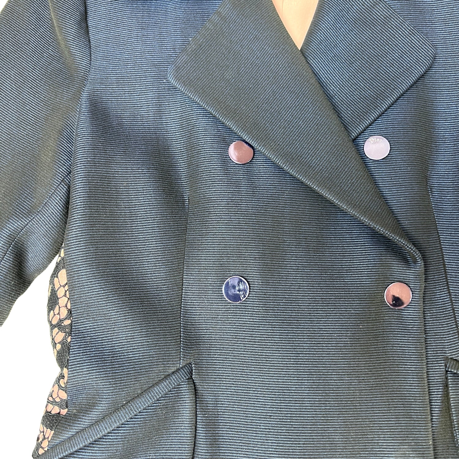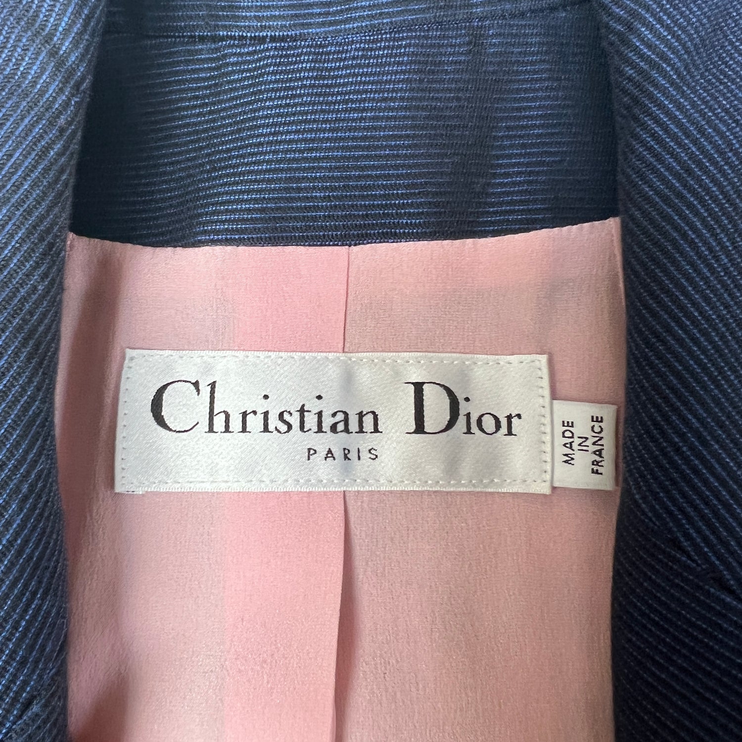 Christian Dior blue dress coat with lace at back. Blue lace on pink panel. Pockets. Pointed collar. Magnetic and snap buttons closure at front. Designer size 36 (US 4).